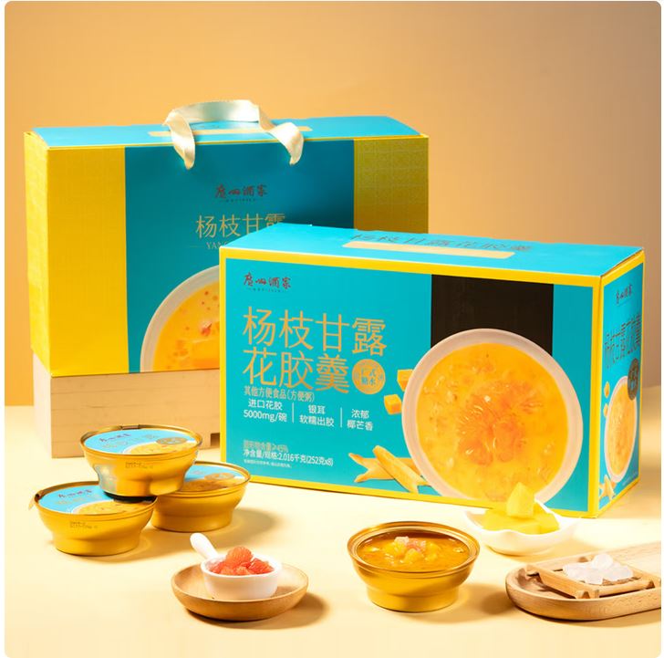 杨枝甘露花胶羹 内容物/主要原料:水、纯牛奶、椰浆、青稞米、冰糖、银耳、花胶(鱼胶)、芒果粉、西柚粉 产品规格:1*4*2016g 产品卖点 精选进口花胶,5000mg/碗,成熟的去腥技术与工艺,软糯不腥; 添加银耳炖煮,软糯胶润; 杨枝甘露风味,浓郁椰芒香,香甜怡人; 用料丰富,多重口感;