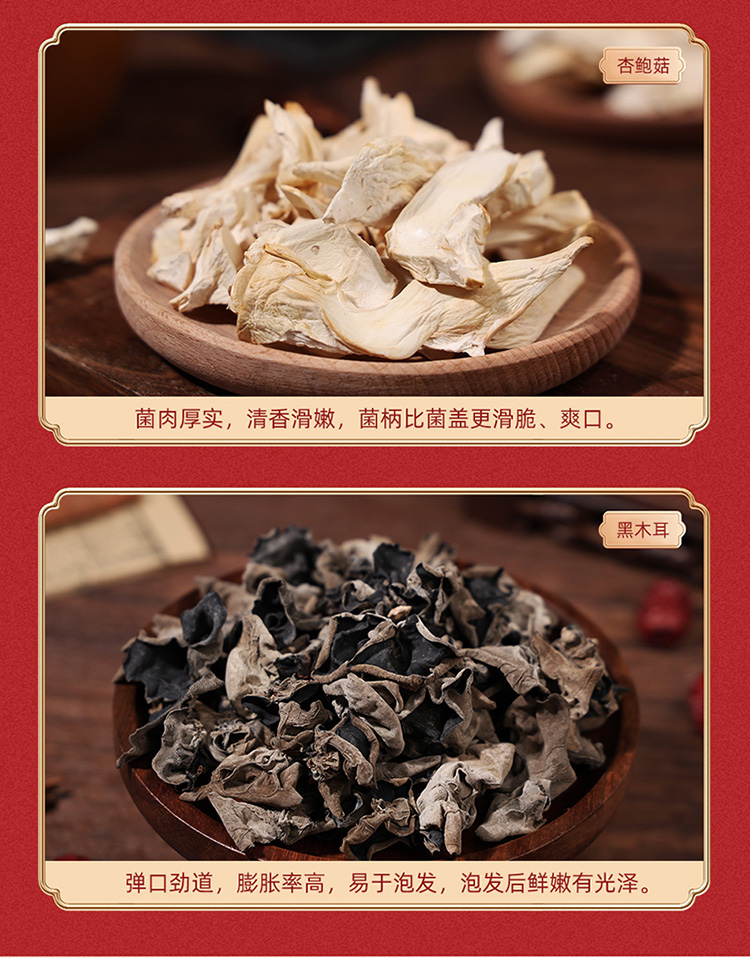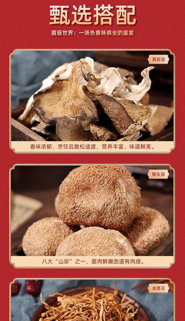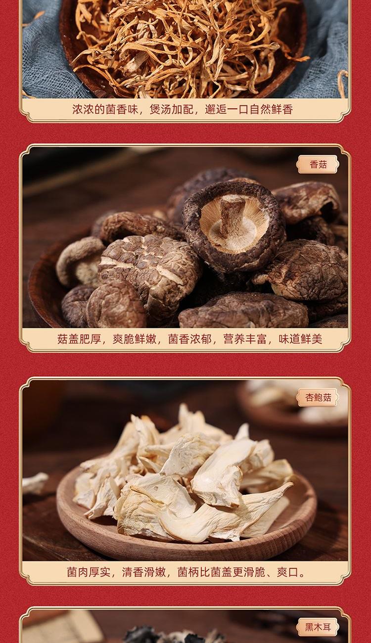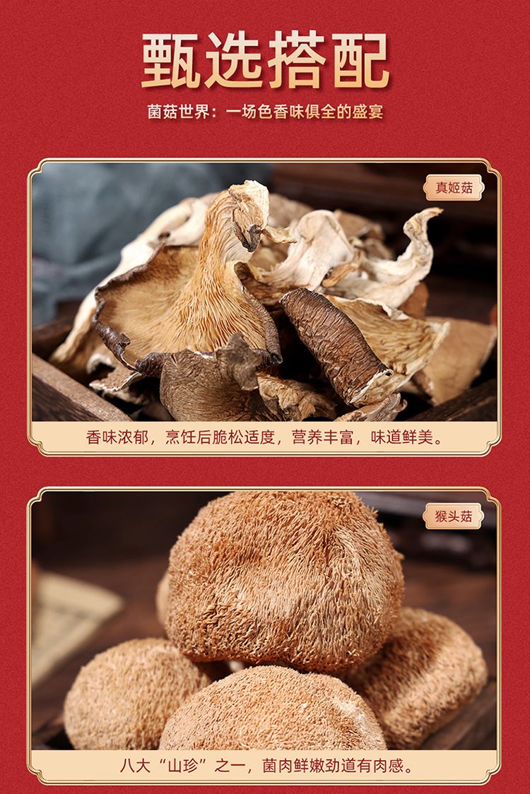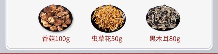 内置:香菇100g 猴头菇50g 虫草花50g 真姬菇100g 杏鲍菇100g 黑木耳80g