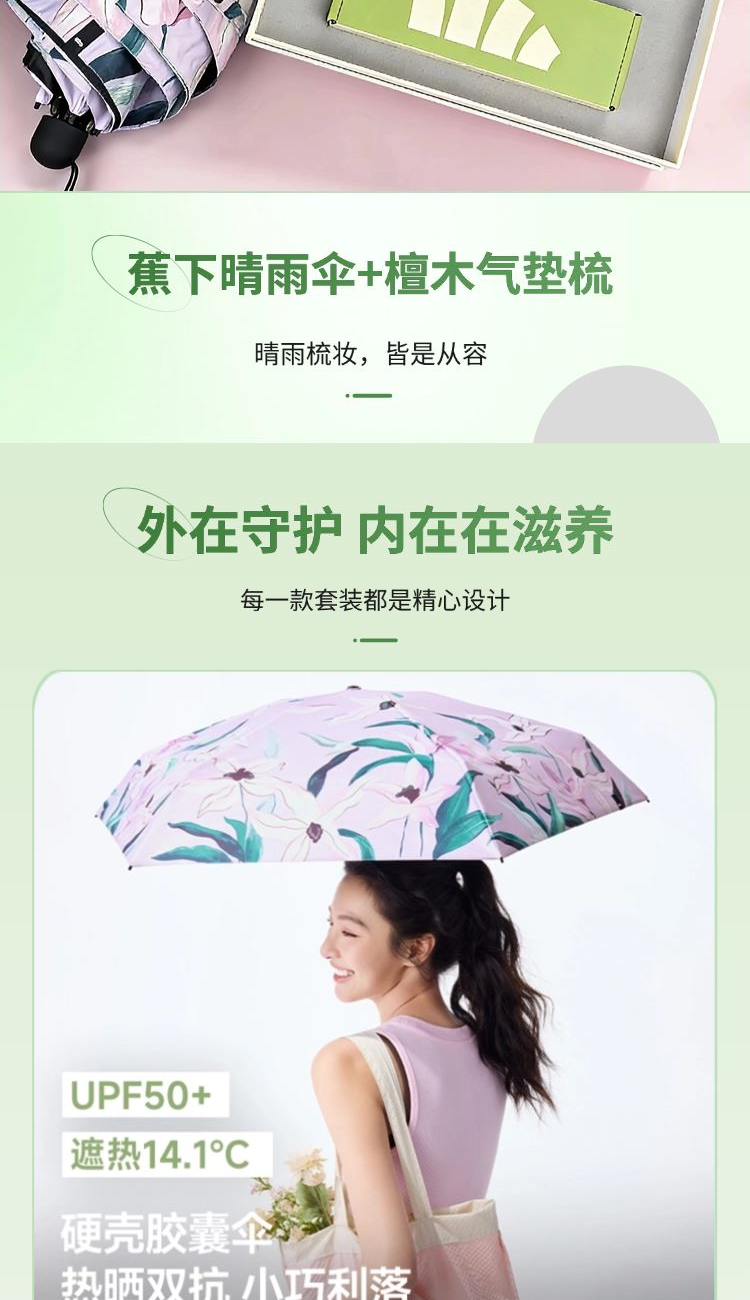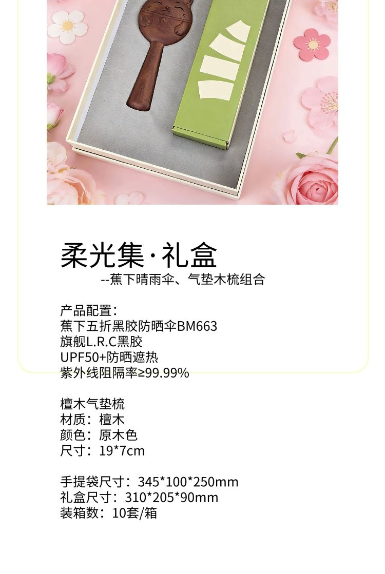 产品配置: 蕉下五折黑胶防晒伞BM663 旗舰L.R.C黑胶 UPF50+防晒遮热 紫外线阻隔率≥99.99% 檀木气垫梳 材质:檀木 颜色:原木色 尺寸:19*7cm 手提袋尺寸:345*100*250mm 礼盒尺寸:310*205*90mm