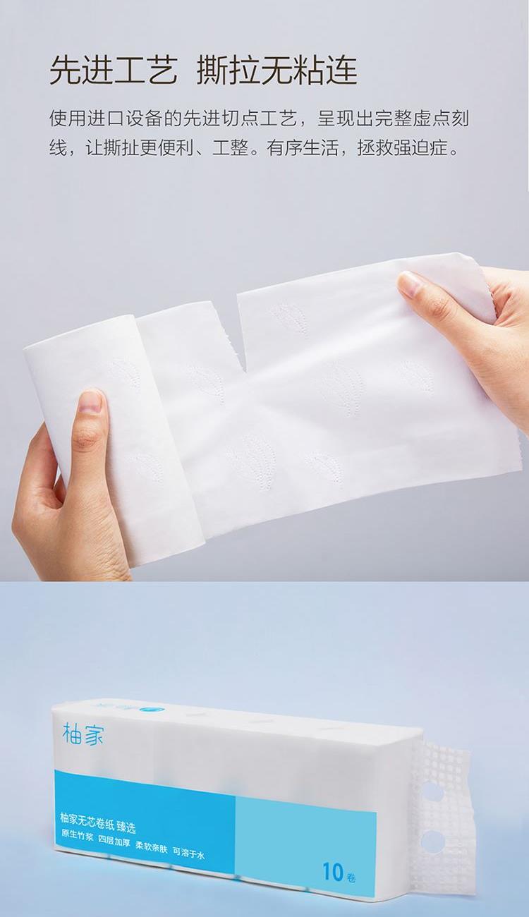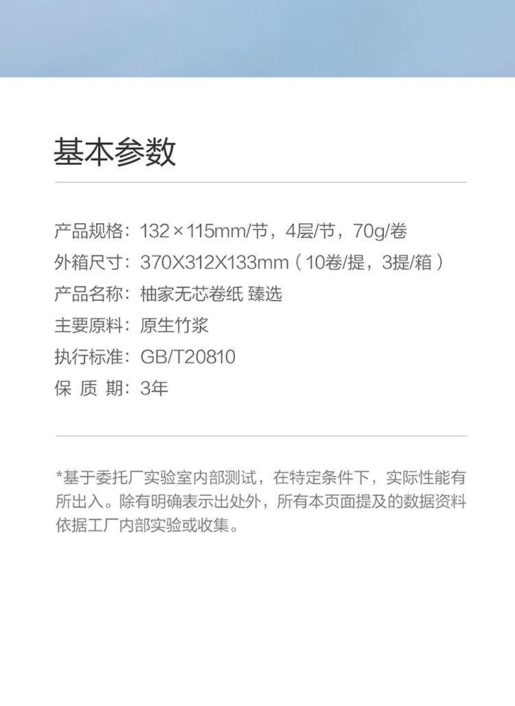 产品规格:70g/卷 ,10卷/提 单提规格:335*130*80mm/提 纸面规格:132*115mm/节(4层) 产品毛重:2350g 外箱尺寸:370*312*133mm 主要原料:原生竹浆 保 质 期:3年 产品卖点: 1、精选原生竹浆 健康环保 2、洁净轻体验 生活更舒畅 3、四层加厚 柔韧不易破 4、细柔表面 呵护娇嫩肌肤 5、先进工艺 撕拉无粘连