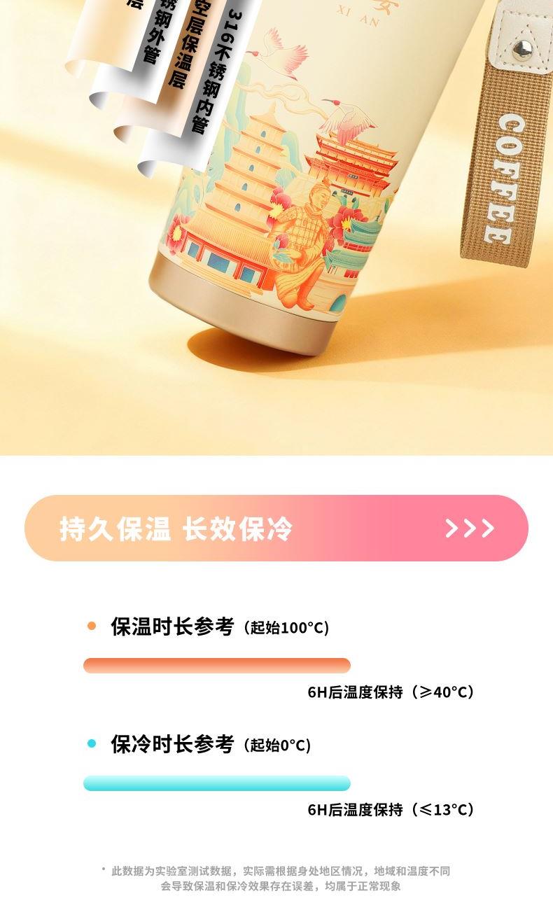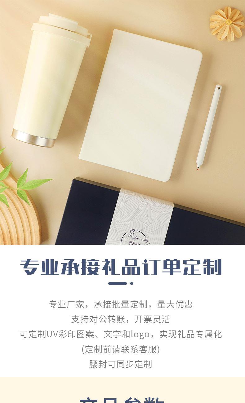 1.觅芳境--双饮咖啡杯 容量:500ml 内胆:316 外壳:304 杯盖:食品级PP 吸管:食品级硅胶 吸嘴:食品级PP 密封圈:食品级硅胶 2.自洁转动签字笔 规格:0.5mm 3.A5平装笔记本 规格:80张100克太阳纸 (64张点格纹,16张空白纸张) 礼盒尺寸:340*255*100(MM) 手提袋尺寸:350*265*110(MM)