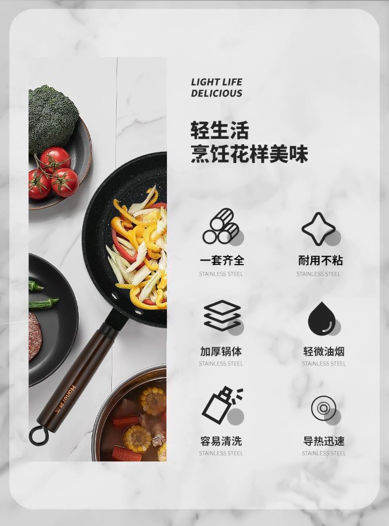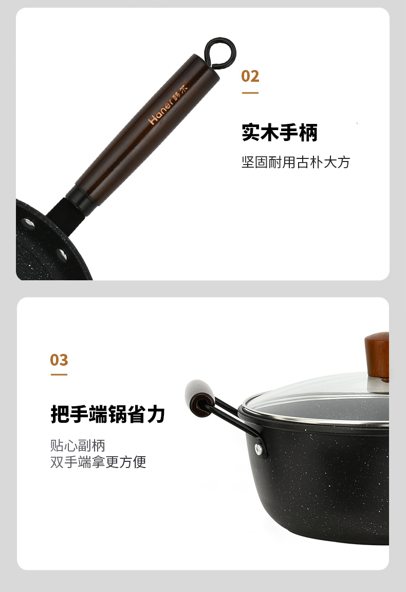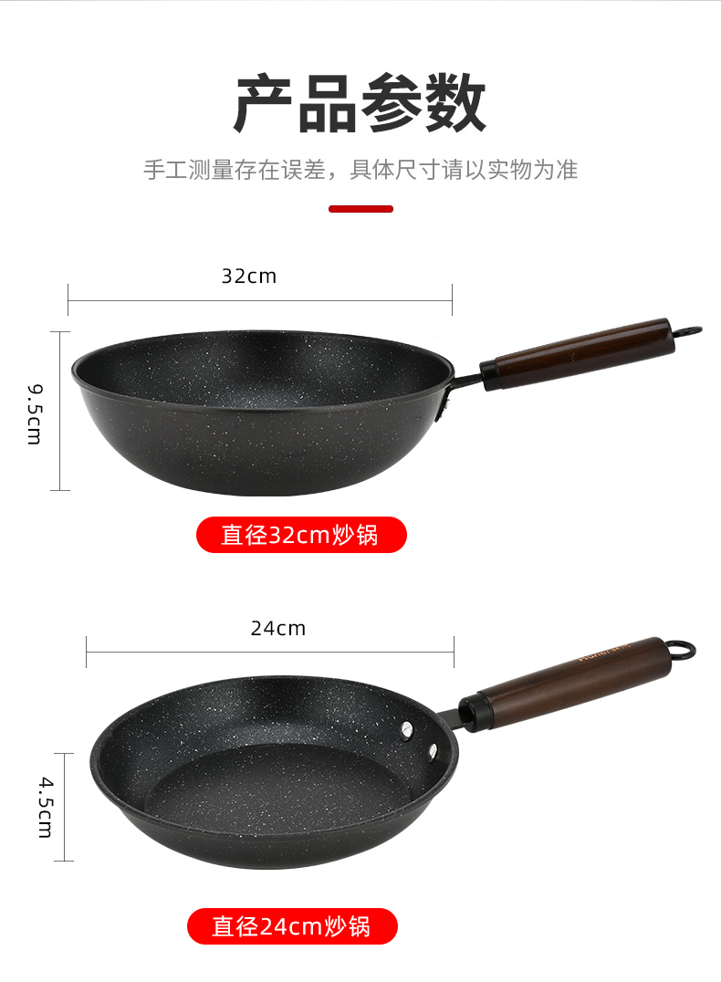 规 格:32cm炒锅+24cm汤锅+24cm煎锅 包装尺寸: 340*140*340mm 材 质:精铁 产品为精铁麦饭石高温熔喷工艺,具有不沾效果而且少油烟。炒锅32公分大口径加厚锅身防滑锅底配防烫隔热胶木手柄;配可视防爆浮法加厚玻璃;汤锅为24公分深汤锅,能做煲汤煮面等功能,盖子为浮法防爆可视玻璃盖并且配有排气均衡孔,保证营养不流失。煎锅为24公分超大口径煎锅。3锅1盖完成厨房组合,锅具适合所有炉具。
