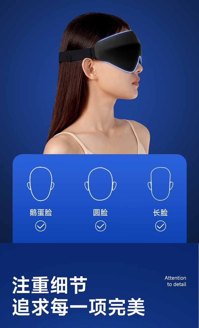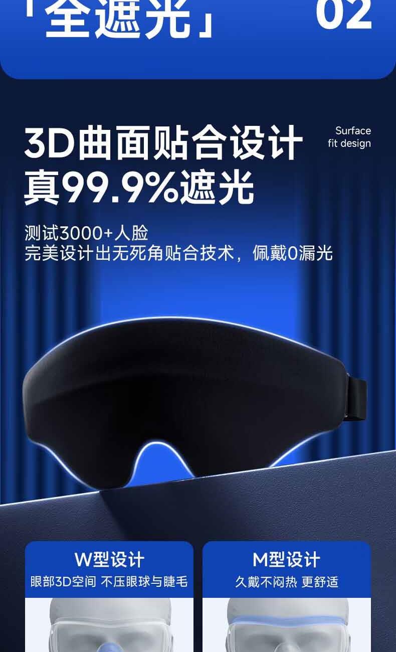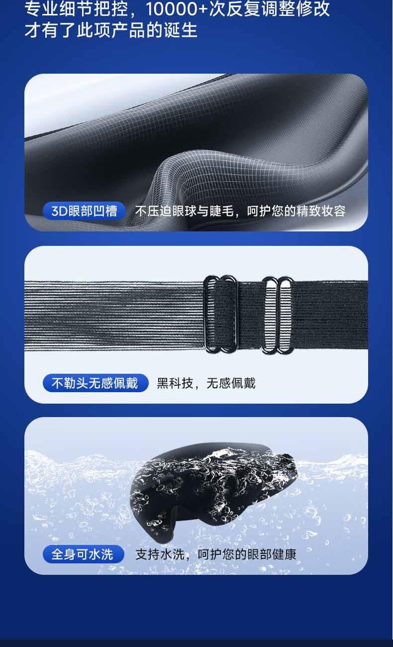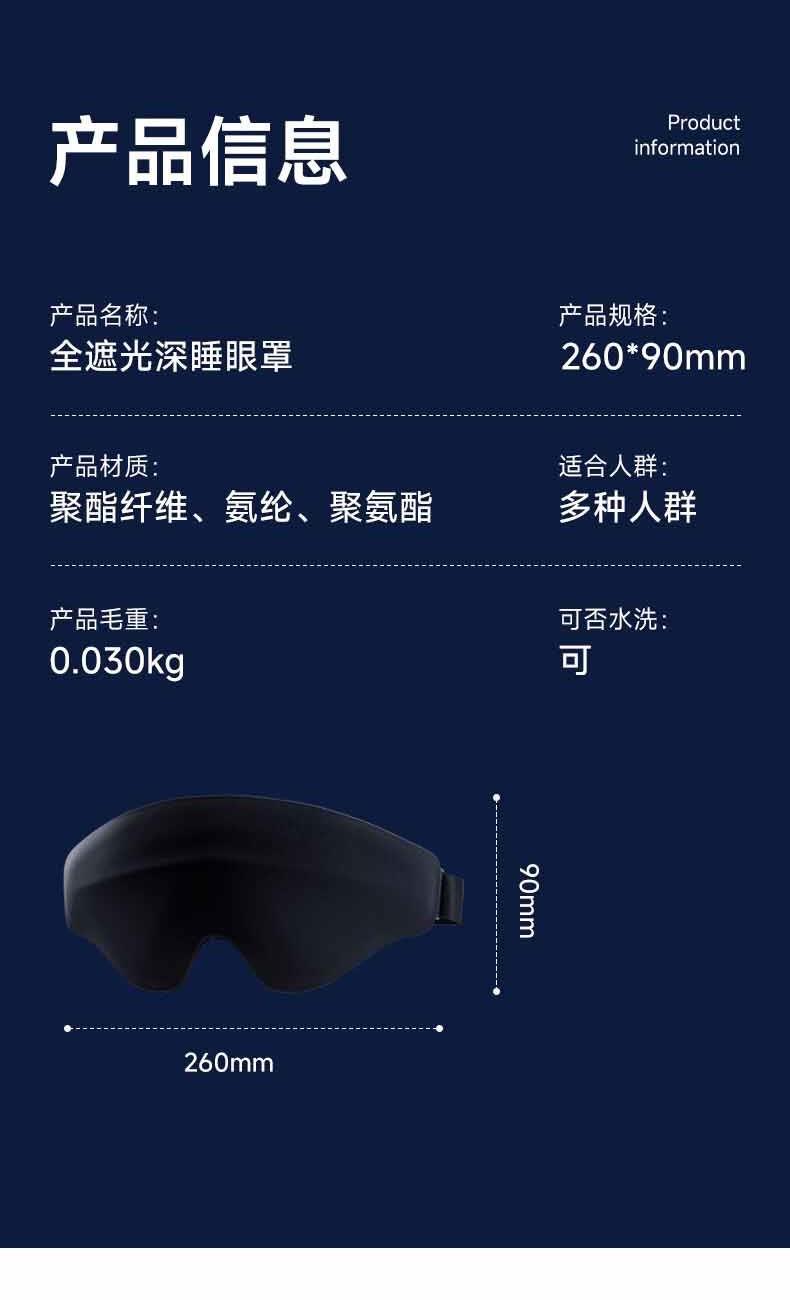 【加宽加大MAX】遮光更全面。 【甄选遮光材质】全遮光,助您轻松入眠 。 【3D内凹空间】分散眼部压力,实现无负担睡眠。 【S型鼻翼设计】贴合鼻翼,360°全遮光。 【轻量化设计】仅重28g,丝毫感受不到任何负重。 【可调节绑带】“1mm”极轻薄,侧睡不勒耳,躺睡不硌头。 【全身可水洗】久用不变形,呵护眼部健康。