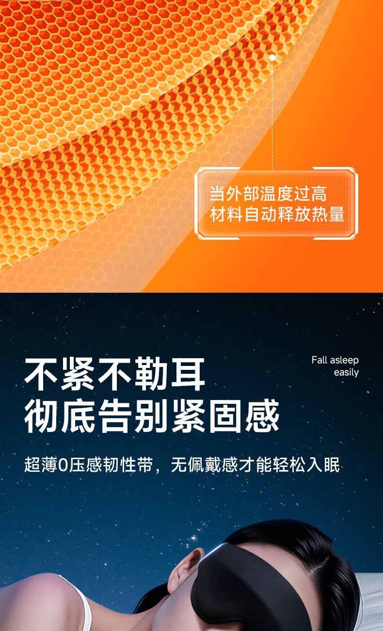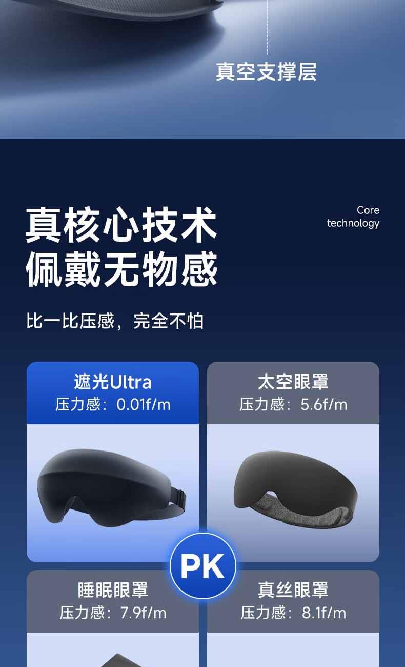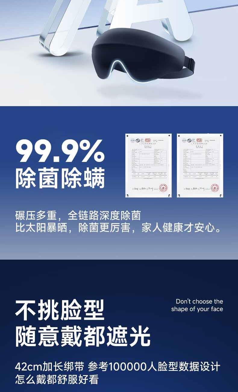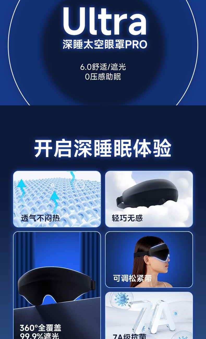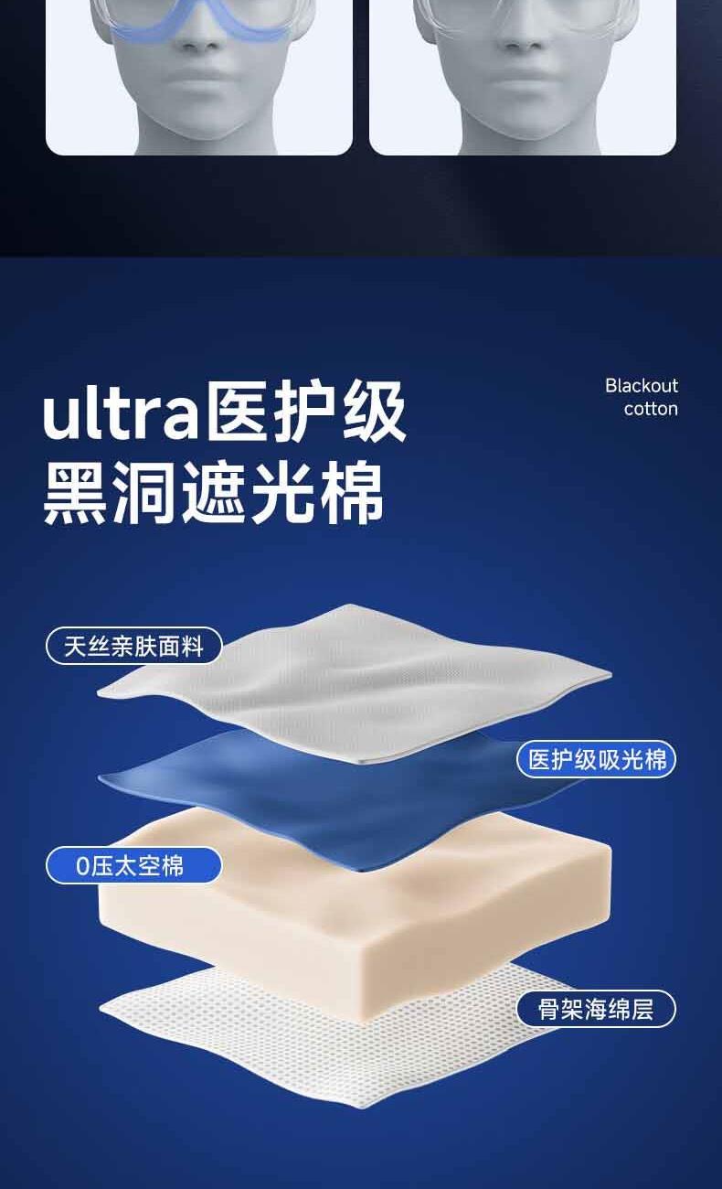 【加宽加大MAX】遮光更全面。 【甄选遮光材质】全遮光,助您轻松入眠 。 【3D内凹空间】分散眼部压力,实现无负担睡眠。 【S型鼻翼设计】贴合鼻翼,360°全遮光。 【轻量化设计】仅重28g,丝毫感受不到任何负重。 【可调节绑带】“1mm”极轻薄,侧睡不勒耳,躺睡不硌头。 【全身可水洗】久用不变形,呵护眼部健康。