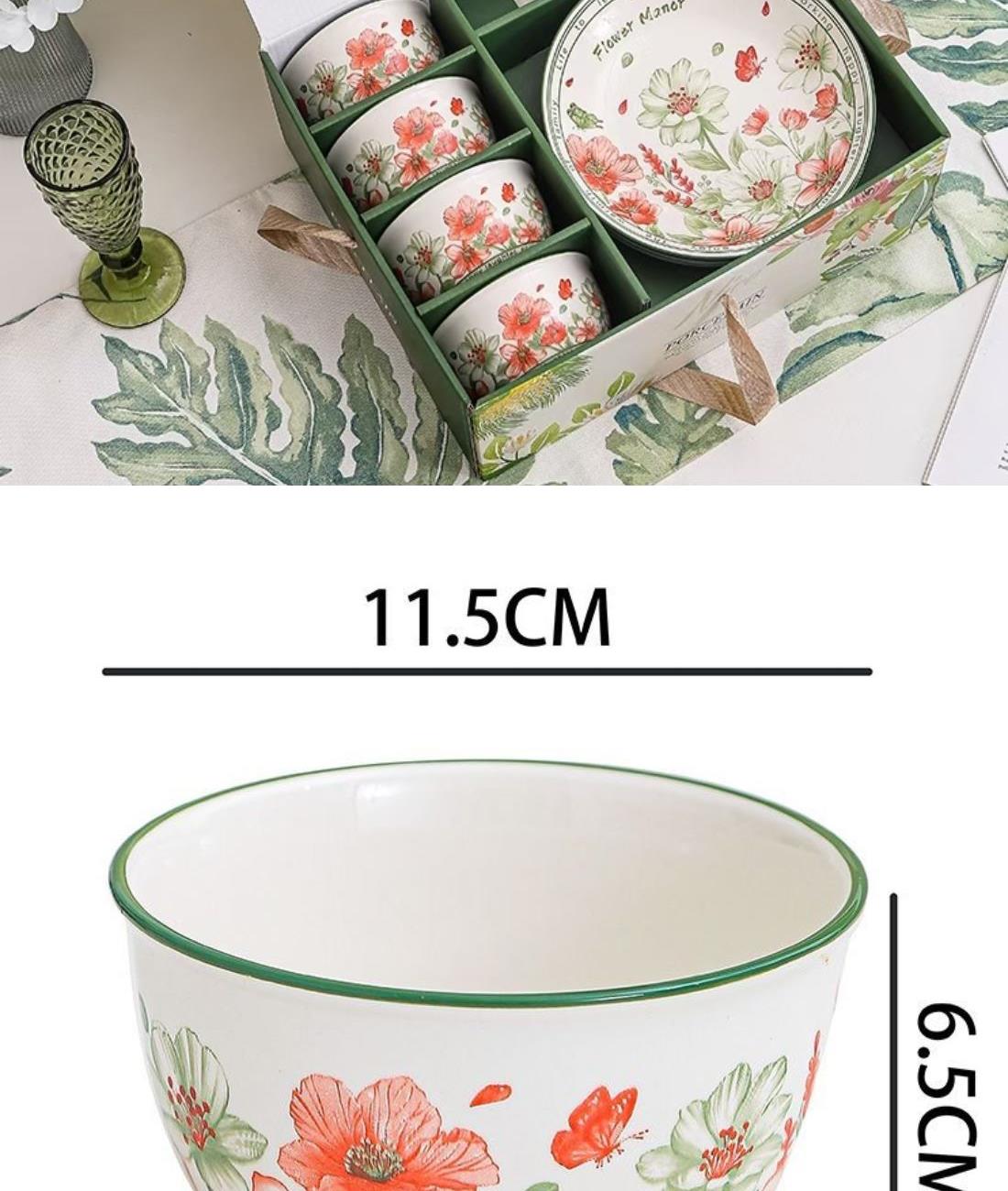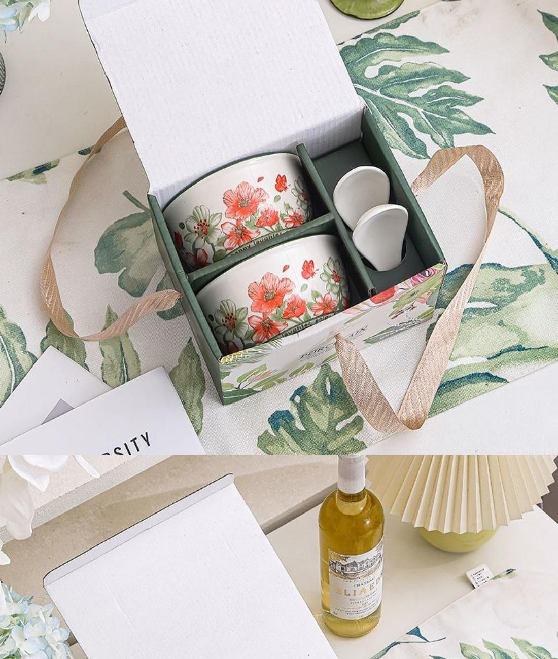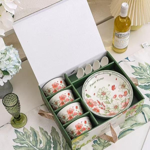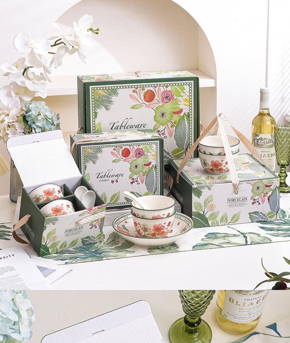 礼盒尺寸:12.1*34*27.8cm 箱尺寸重量:69*56*38CM 20kg 配 法:4碗勺1盘 材 质:新骨瓷 产品特点: 表面透明釉质保护层,可直接与食物接触。不含铅镉元素,安心享受美食滋味! 餐具整理厚实防烫,久经耐用,釉面光滑,清洗方便! 餐具包装美观大方,贴心手提设计,送礼大气又档次