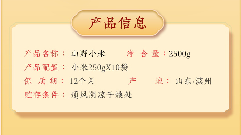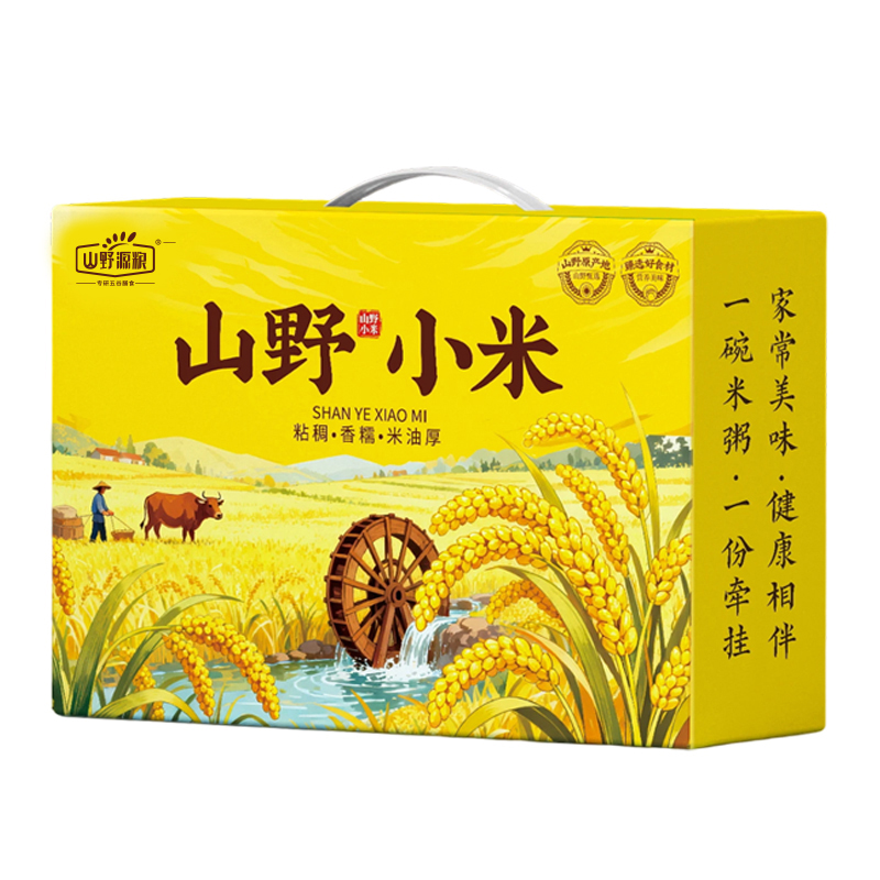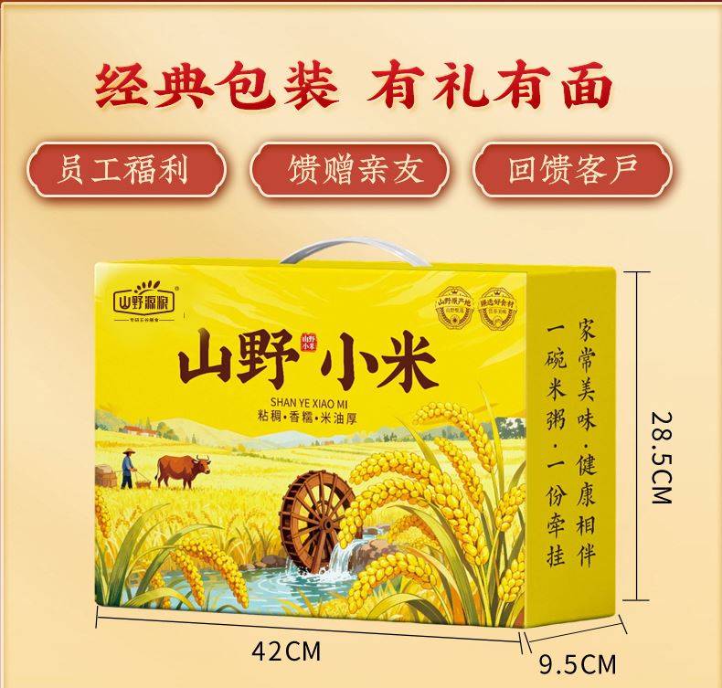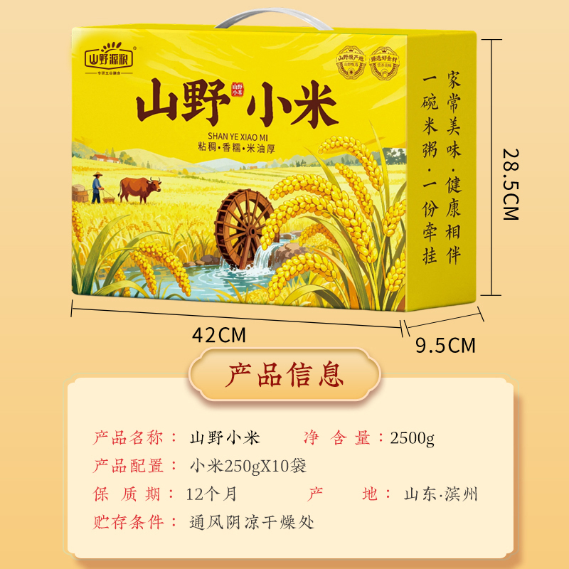 净含量:2500g 礼盒:山野小米 条码:6972761600017 产品规格配置:黄小米(250gx10袋) 盒尺寸:42*28.5*9.5cm 箱重量:18.5kg 箱体积:0.077方 箱尺寸:59.5*43*30