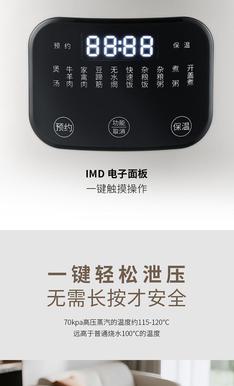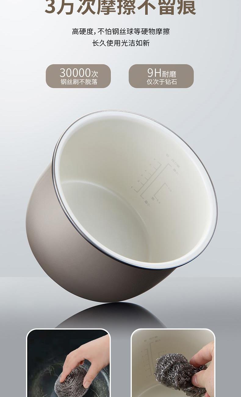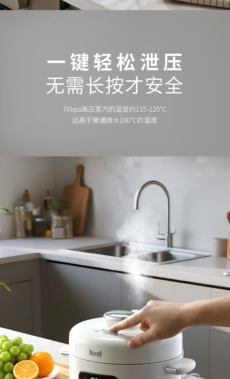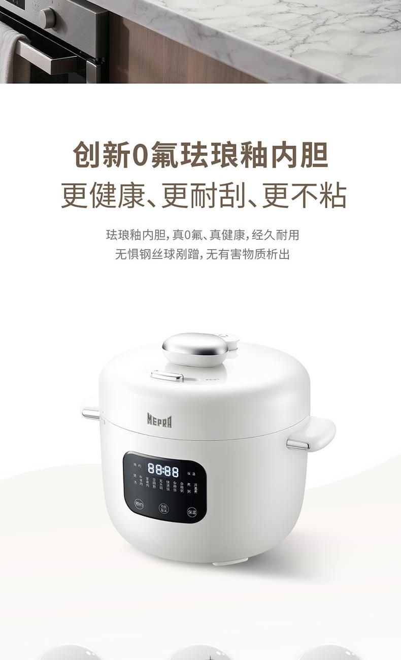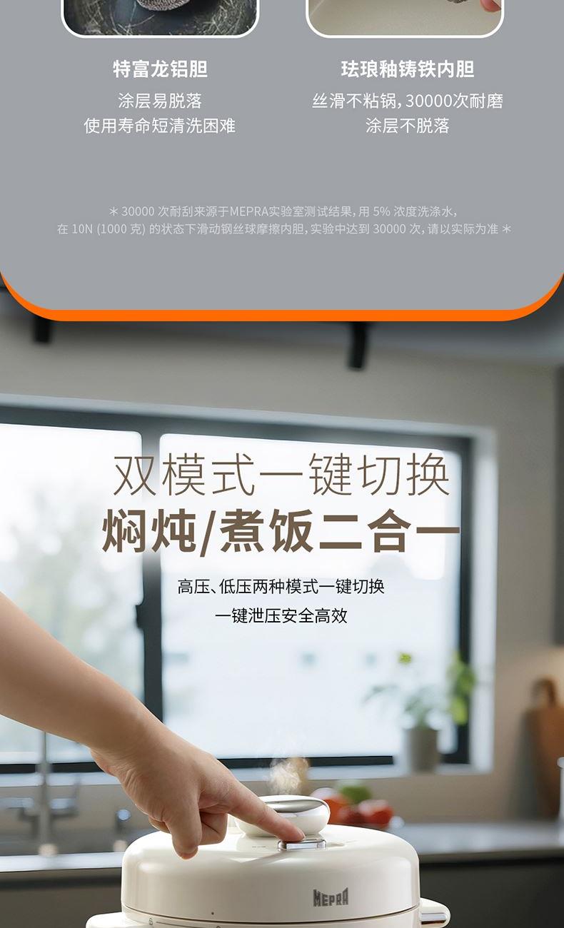 1、0氟铁釜珐琅釉压力锅,抗刮,不粘性能好; 2、铝合金发热盘,受热更均匀; 3、800W大火力&70Kpa高压鲜萃; 4、自动泄压/一键泄压,双模式泄压; 5、30000次耐磨挑战成功,钻石级9H硬度; 6、压力锅/电饭煲/电煮锅三合一,满足不同烹饪需求; 7、10大预设菜单用心做好每一餐; 8、3L精致容量,一人食/多人皆满足; 9、24小时智能预约,晚餐准时赴约。