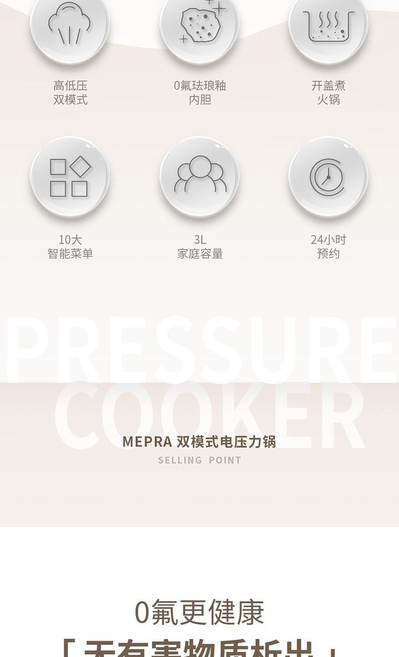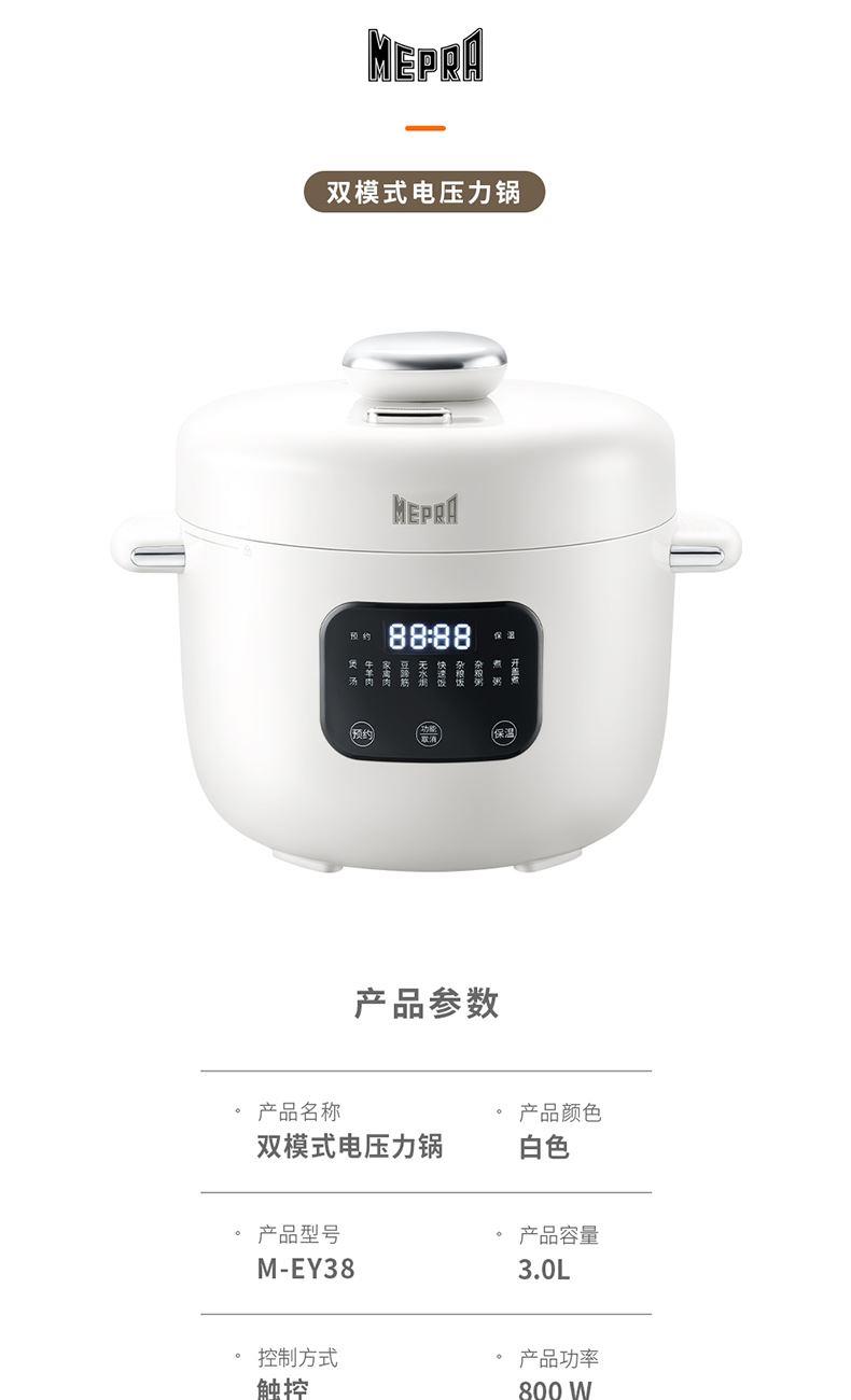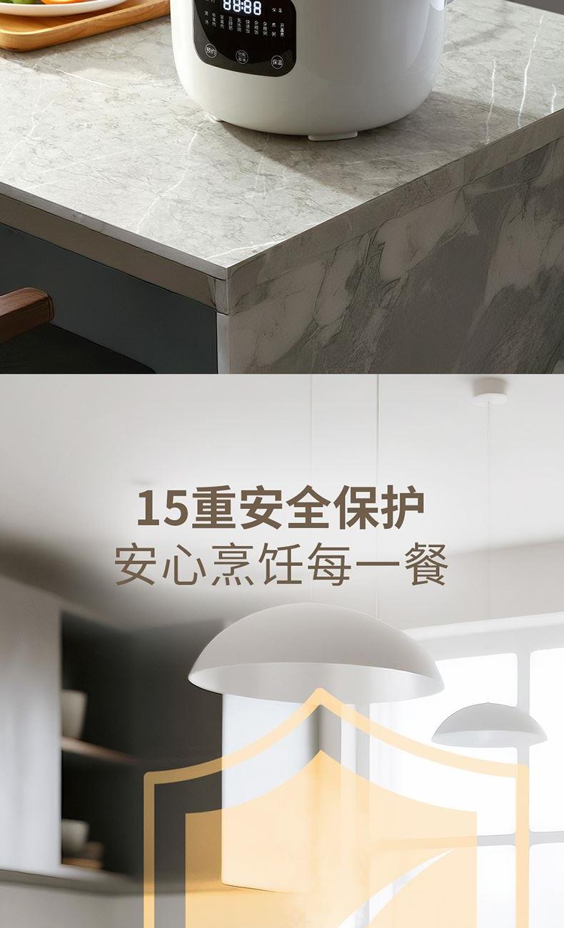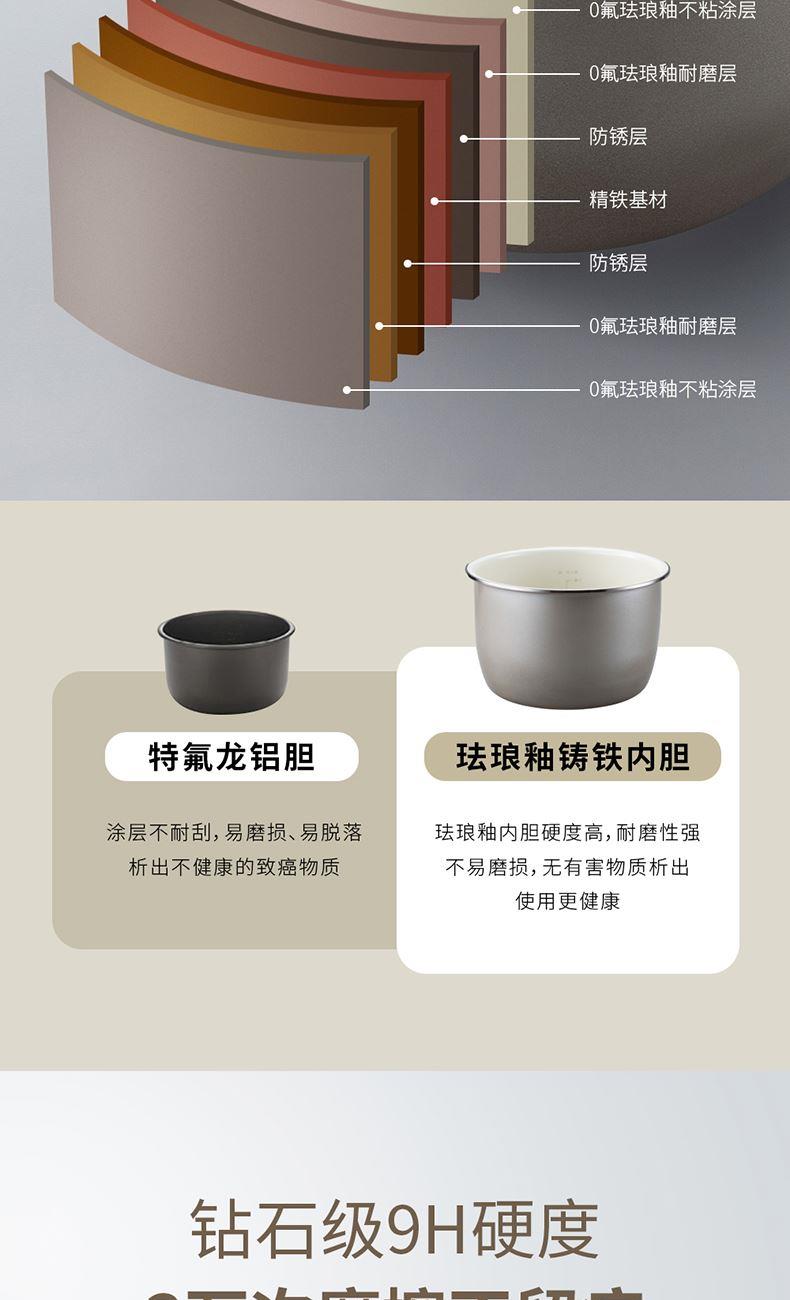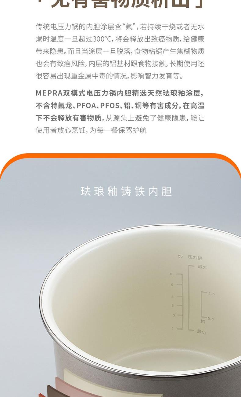 1、0氟铁釜珐琅釉压力锅,抗刮,不粘性能好; 2、铝合金发热盘,受热更均匀; 3、800W大火力&70Kpa高压鲜萃; 4、自动泄压/一键泄压,双模式泄压; 5、30000次耐磨挑战成功,钻石级9H硬度; 6、压力锅/电饭煲/电煮锅三合一,满足不同烹饪需求; 7、10大预设菜单用心做好每一餐; 8、3L精致容量,一人食/多人皆满足; 9、24小时智能预约,晚餐准时赴约。