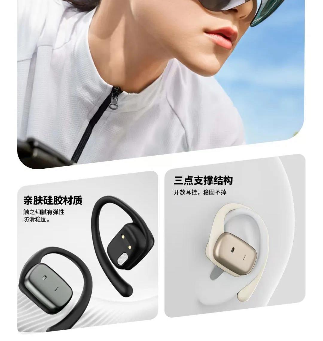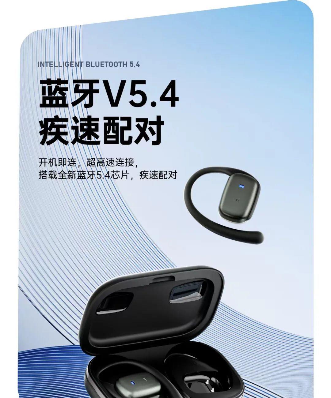 佩戴方式:OWS耳挂式 蓝牙版本:V5.4 通话时间:8小时 待机时间:120天 电池类型:充电仓可充3次 1,OWS开放式立体声蓝牙耳机; 2,采用5.4新方案,连接快,功耗低,信号稳定; 3,采用新定向传音技术,数字声音增强技术,通话听歌更清晰; 4,360°全景ACS音效,音质超好; 5,180°贴合耳廓,佩戴舒适又牢固; 6,内置230毫安电池,超长待机120天; 7,精品礼品盒包装;