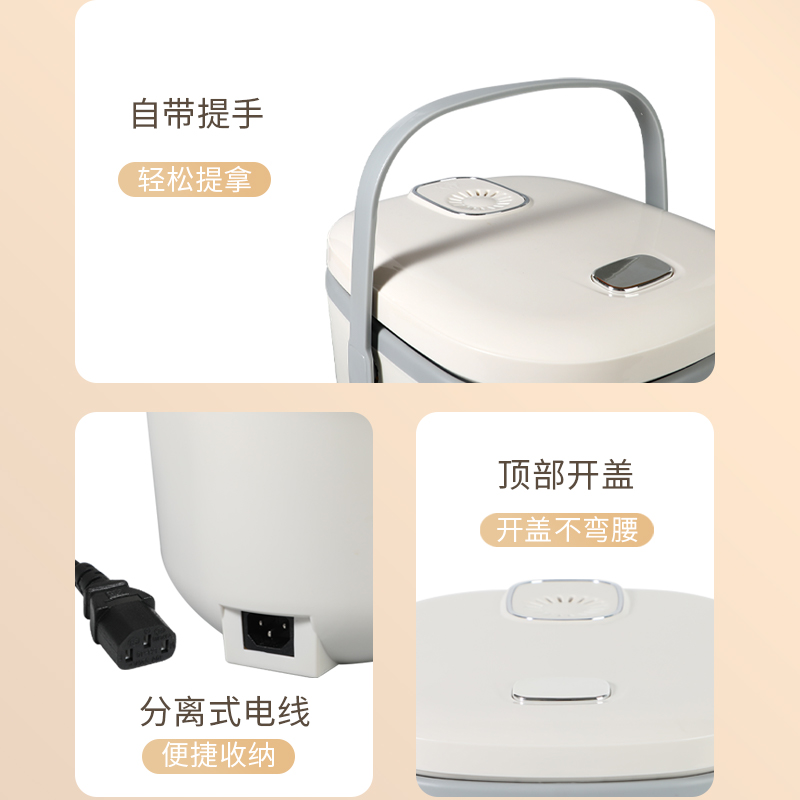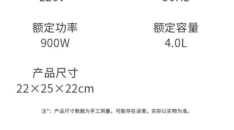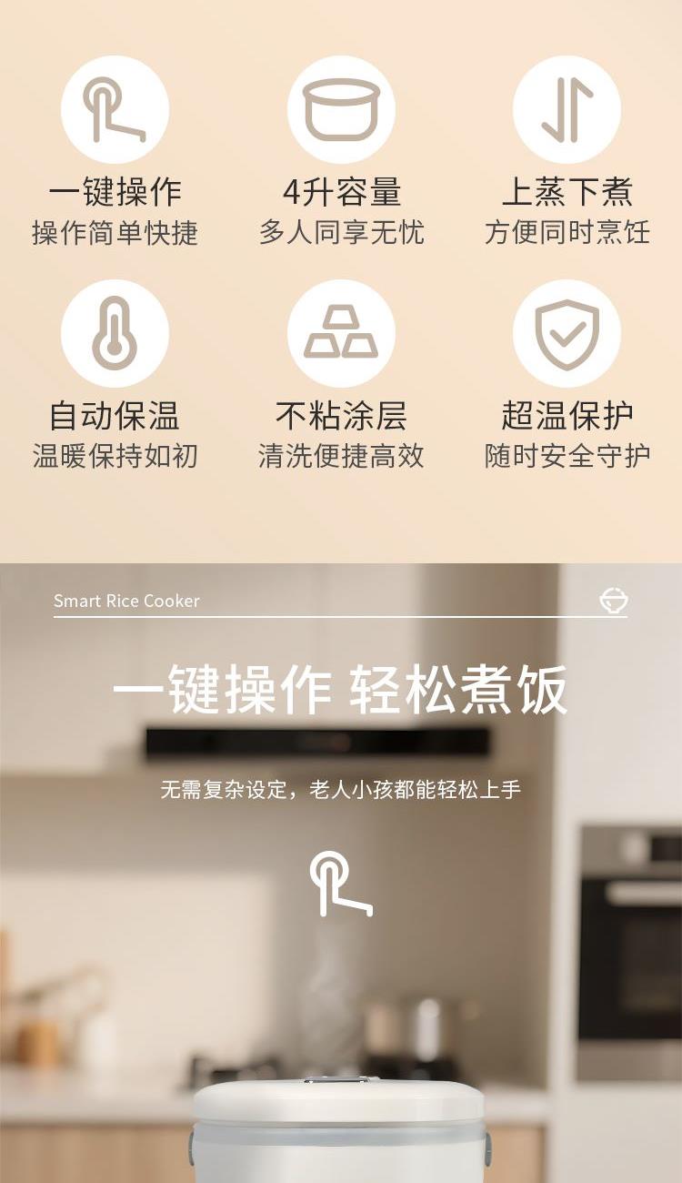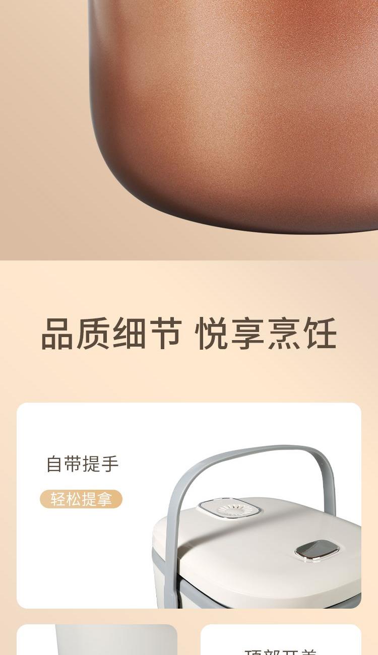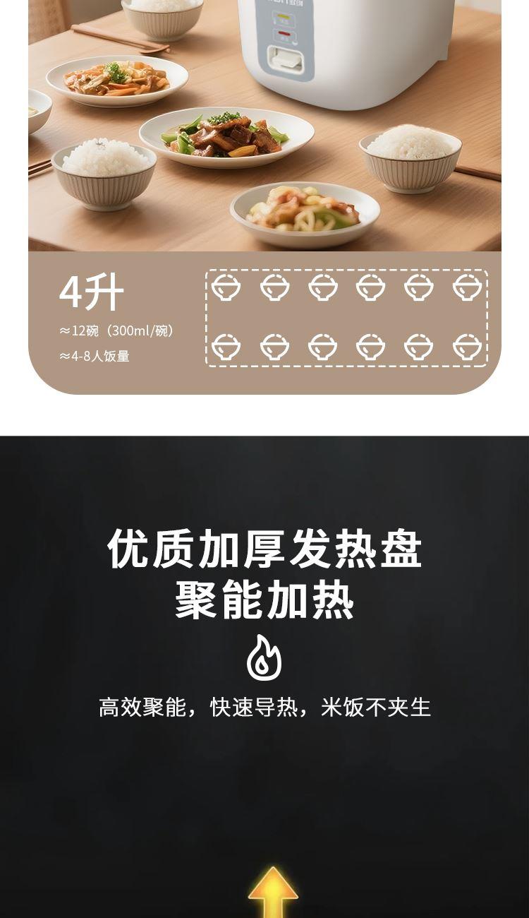 产品参数 电热功率:700W 额定容量:4L 产品净重:2.4kg 产品毛重:3.1kg 整箱毛重:12.5kg 彩盒尺寸:325X275X255mm 外箱尺寸:565X335X535mm 产品特点 1.时尚美学设计,匠心工艺; 2.一键智能操控,老人小孩轻松用; 3.优质双喷不粘涂层内胆,煮饭更健康,持久不粘更耐磨; 4.可拆洗式不锈钢盖板,清洁卫生; 5.4L大容量,满足全家需求; 6.强化工程塑料机身,强度高,使用更长久。