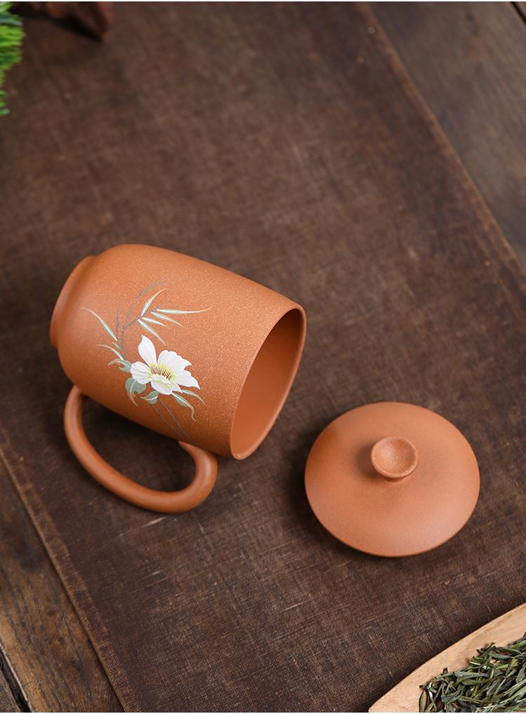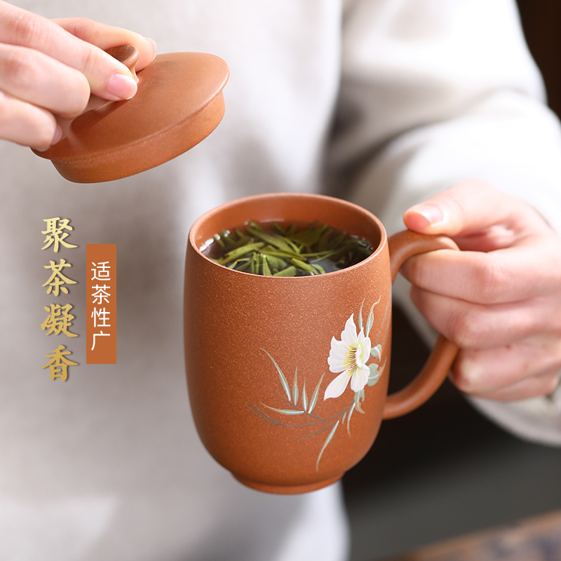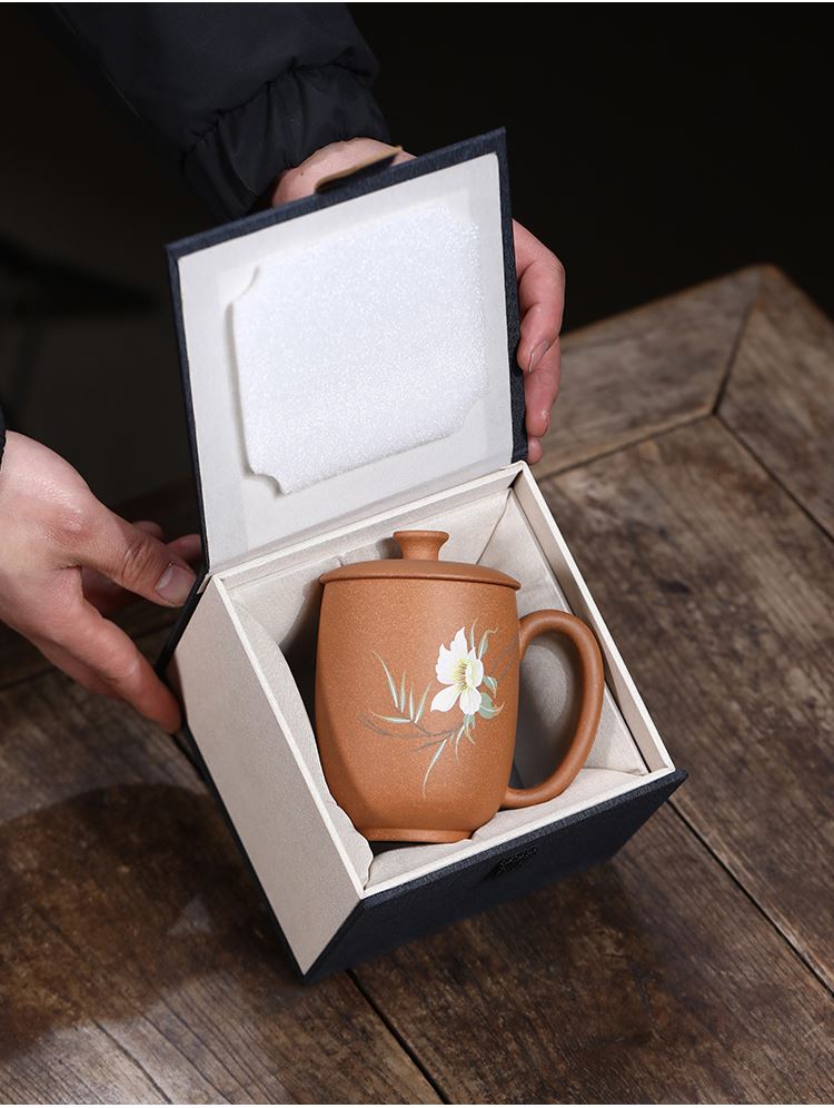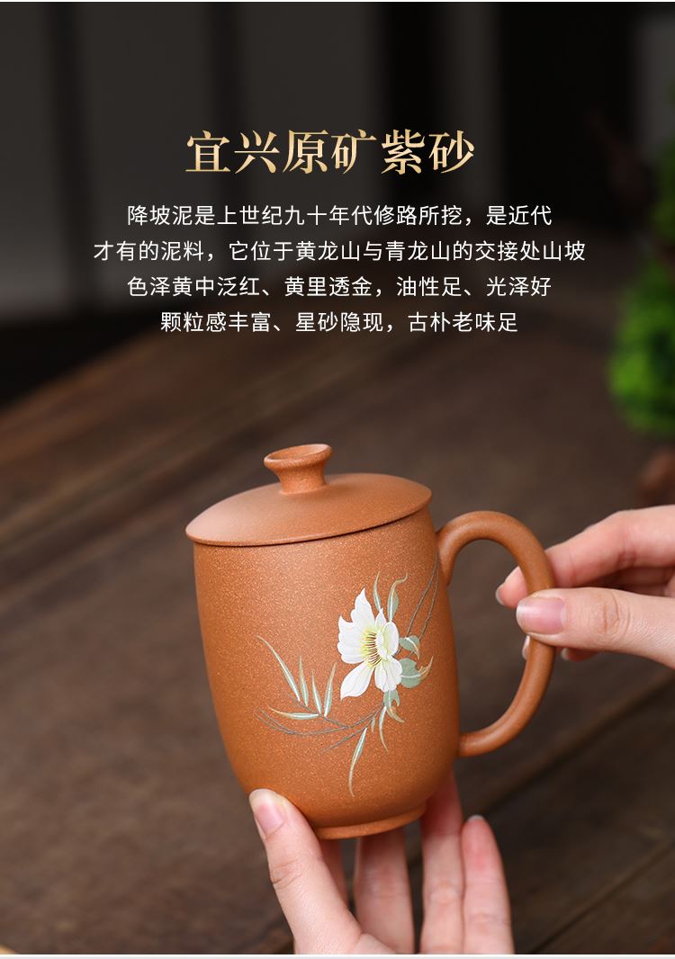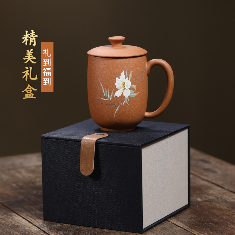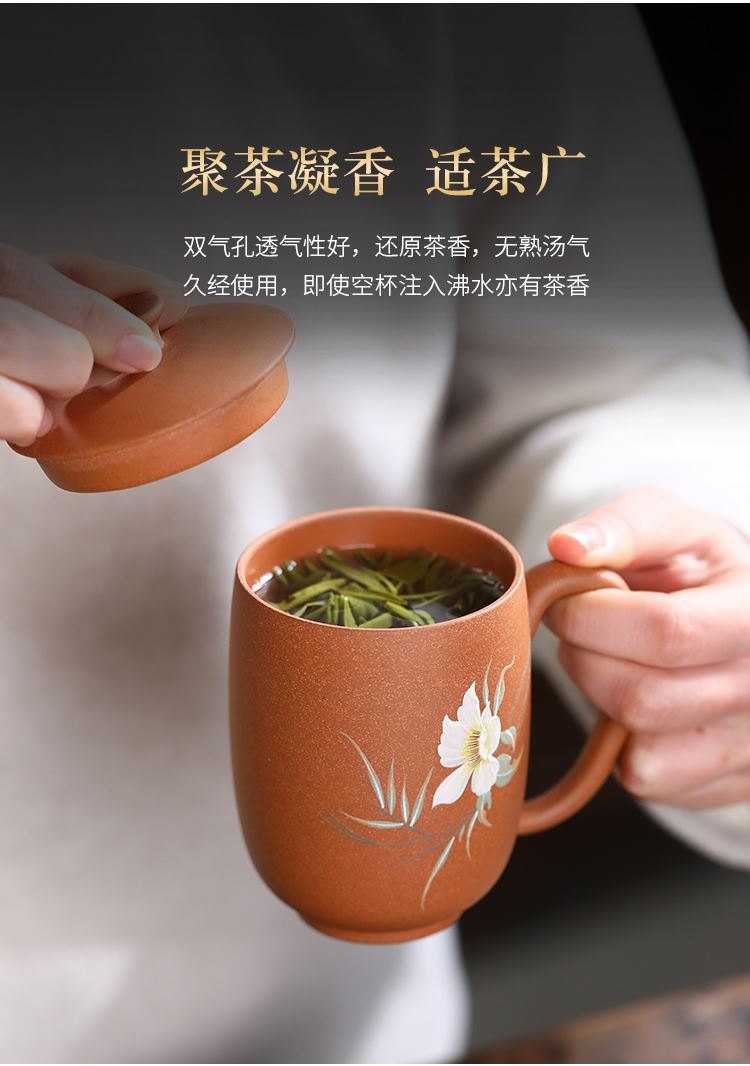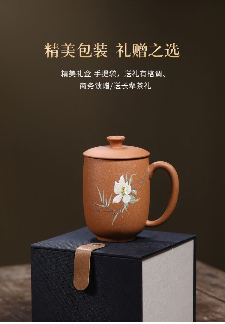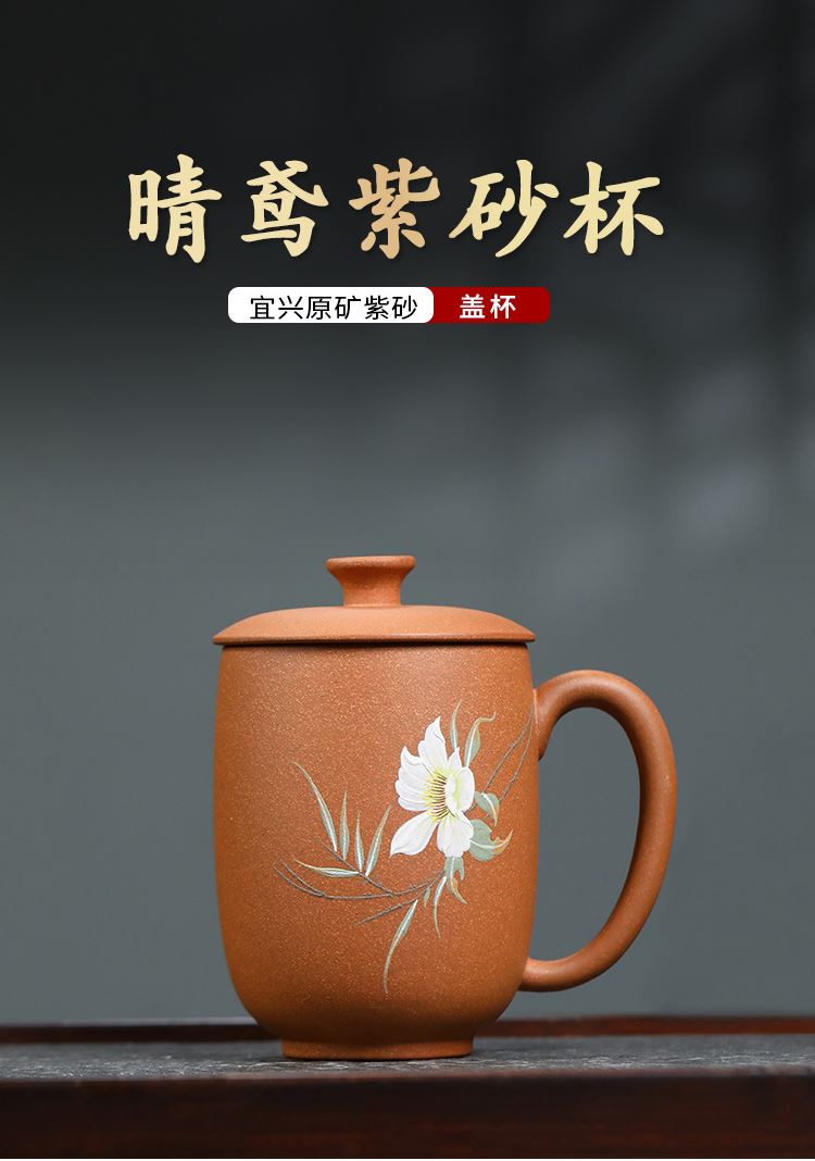 配置清单:茶杯*1 礼盒*1 容量:260ml 材质:紫砂降坡泥 宜兴原矿紫砂泥 权威检测 质量保证 手工泥绘鸢尾花图案 清新雅致 聚香凝香 双气孔 适茶广