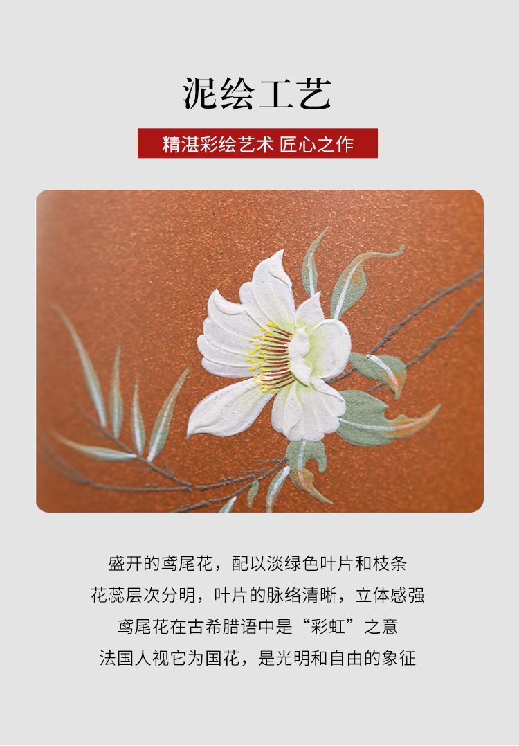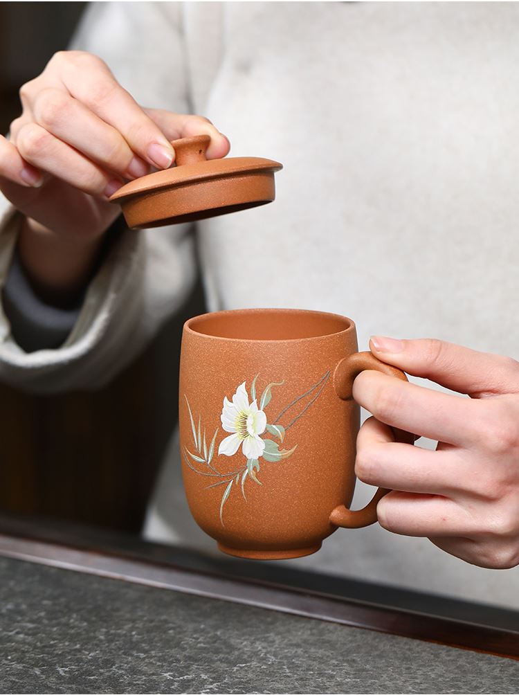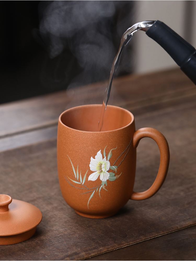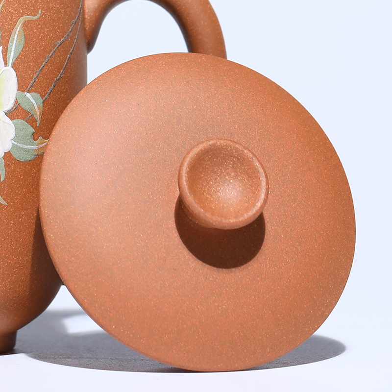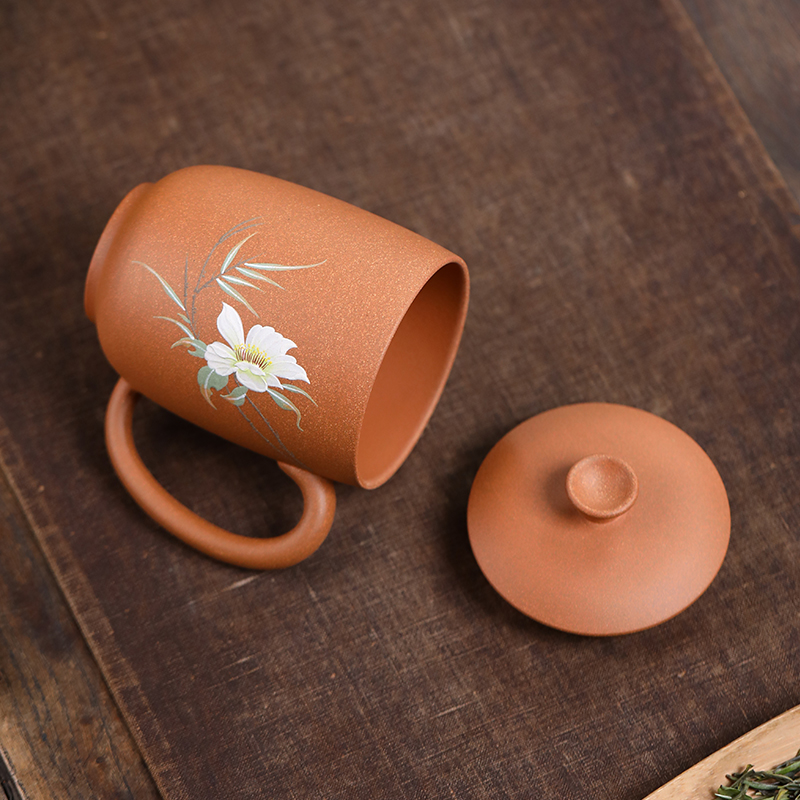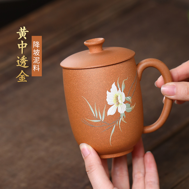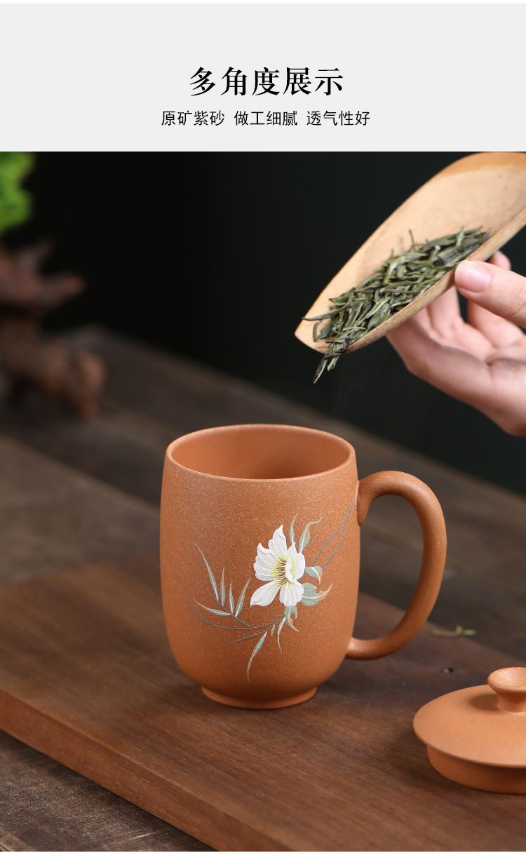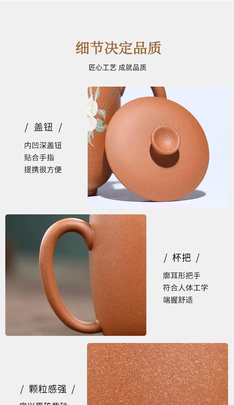 配置清单:茶杯*1 礼盒*1 容量:260ml 材质:紫砂降坡泥 宜兴原矿紫砂泥 权威检测 质量保证 手工泥绘鸢尾花图案 清新雅致 聚香凝香 双气孔 适茶广