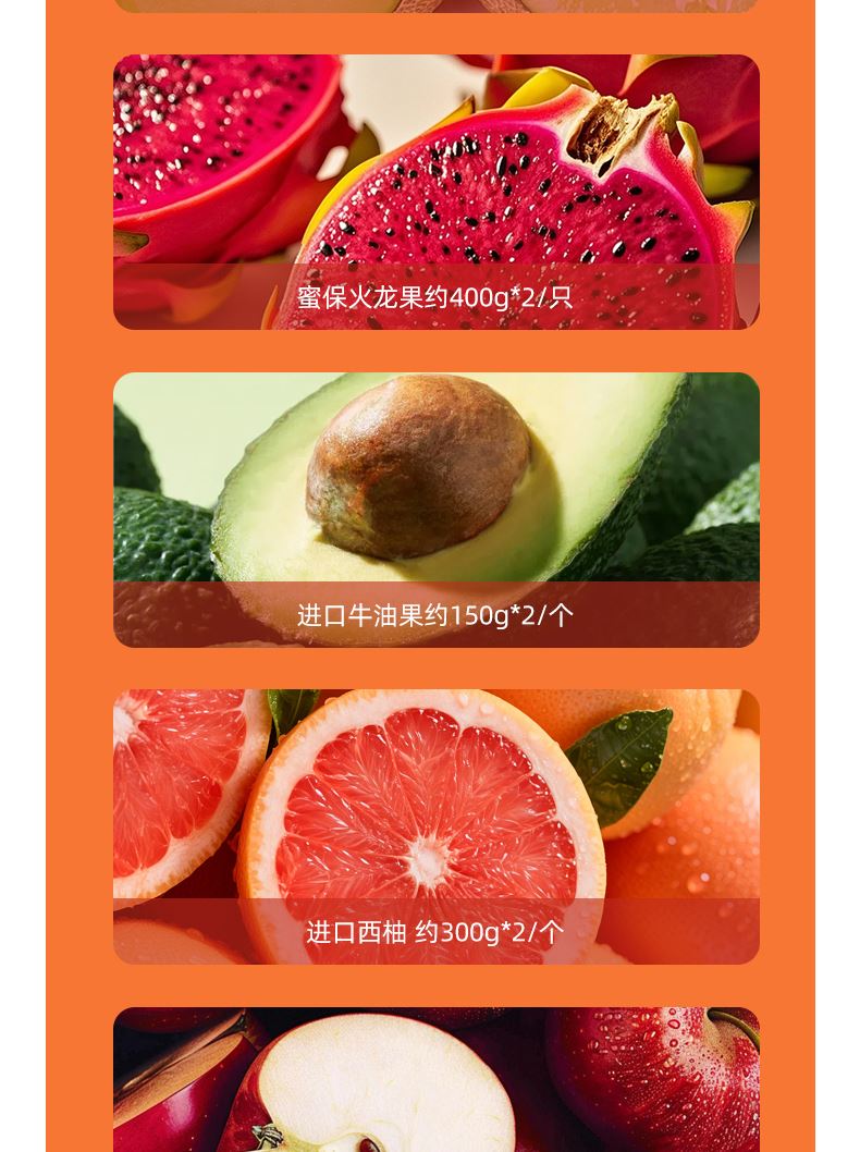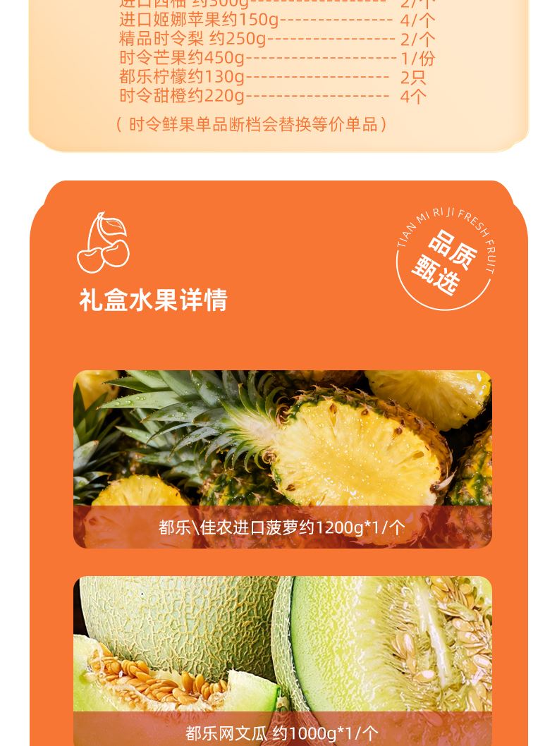"都乐\佳农进口菠萝约1200g*1/个 都乐网文瓜 约1000g*1/个 蜜保火龙果约400g*2/只 进口牛油果约150g*2/个 进口西柚 约300g*2/个 进口姬娜苹果约150g*4/个 精品时令梨 约250g*2/个 时令芒果约450g*1/份 都乐柠檬约130g*2只 时令甜橙约220g*4 ( 时令鲜果单品断档会替换等价单品)"