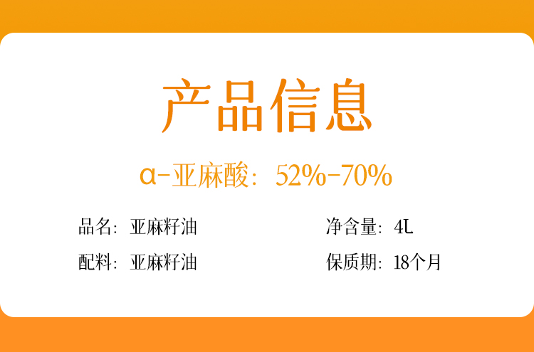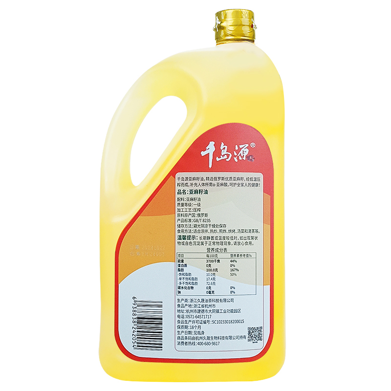 等级:一级 包装形式:桶装 加工工艺:压榨 保质期:540天 包装规格:1桶 亚麻籽油,脱蜡冷压榨食用油,一级亚麻油胡麻油 4L
