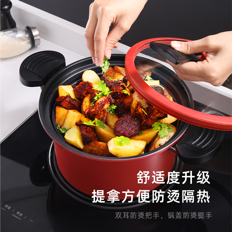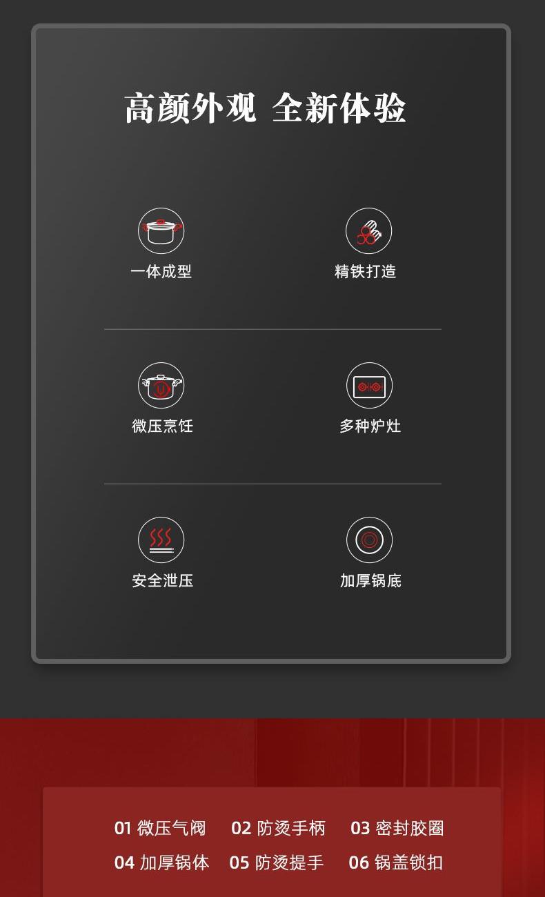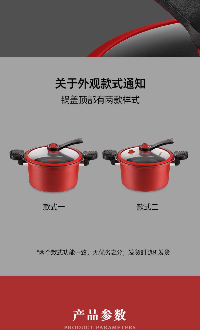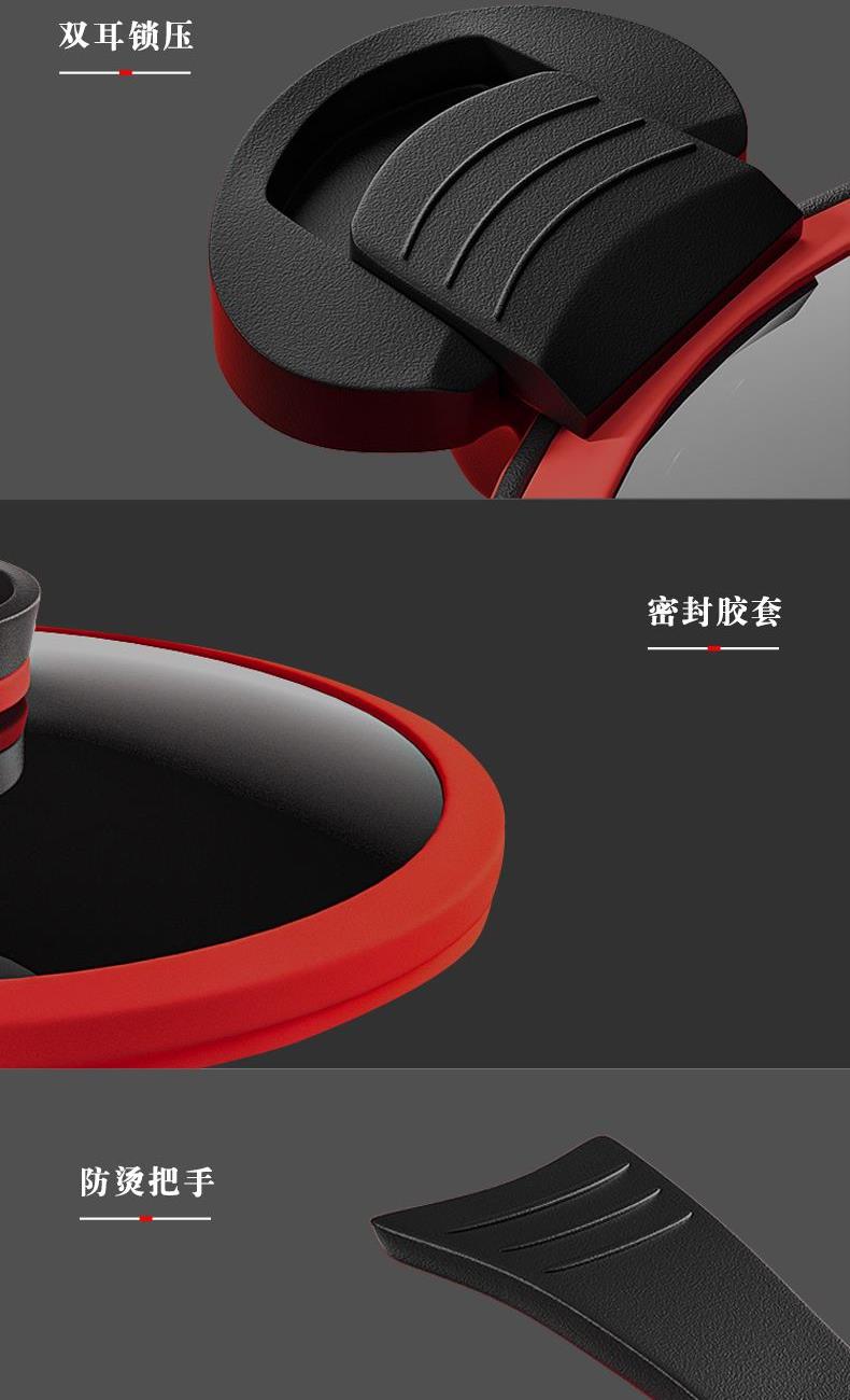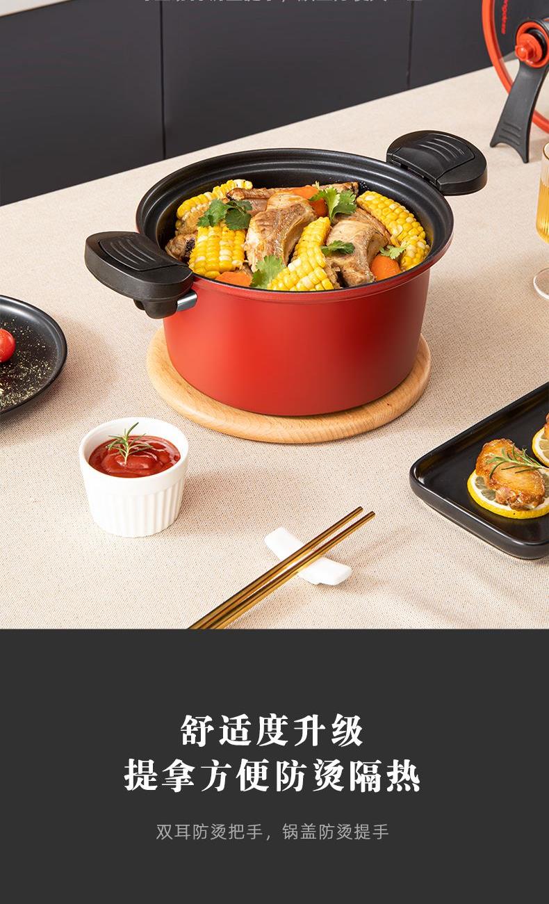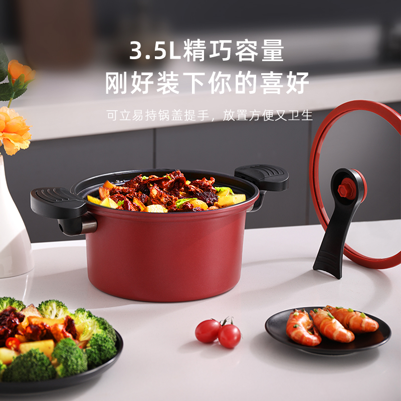 产品口径:22cm 产品容量:3.5L 产品材质:精铁 产品净重:1.8kg 产品毛重:2.6kg 整箱重量:13.6kg 食品级不粘涂层,红色烤漆锅体 微压烹饪,锁住食材新鲜营养 推拉双锁扣耐热双耳推拉锁紧把手,防烫隔热 可视烹煮硅胶密封玻璃可立锅盖,可视烹饪