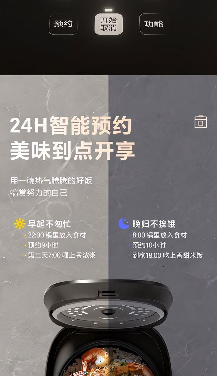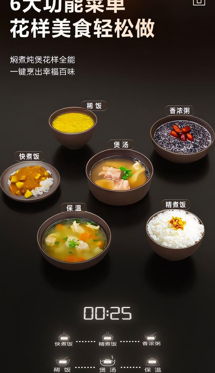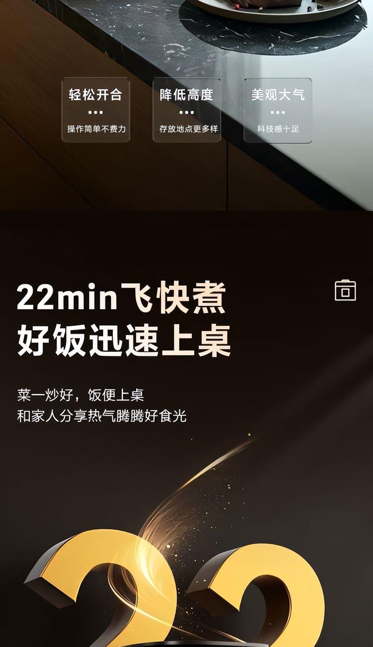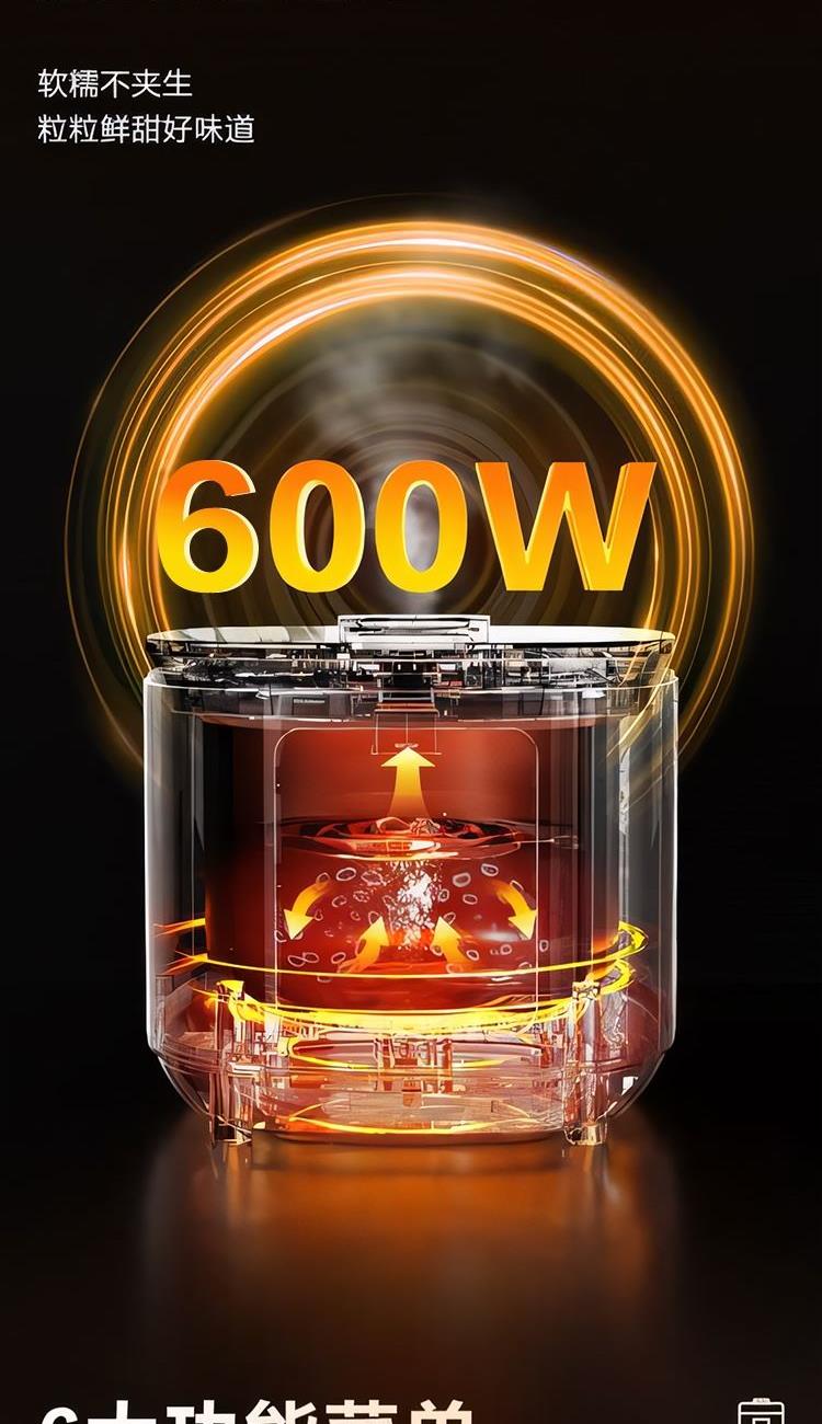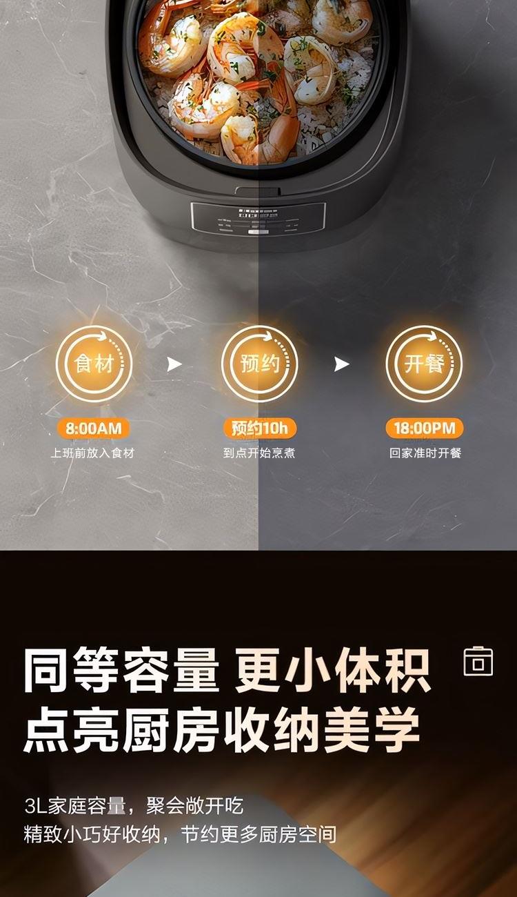 额定功率:600W 额定容量:3.0L 产品毛重:3.0kg 装 箱 数:1台 整箱重量:3.36kg 工作电压:220V~ 额定频率:50HZ 产品净重:2.63kg 产品尺寸:285*248.5*201mm 1. 超薄顶盖设计,科技感十足 2. 5大烹饪功能,极简操作 3. 相同容量,更小体积,空间节约