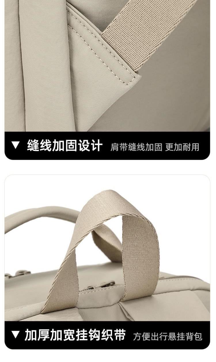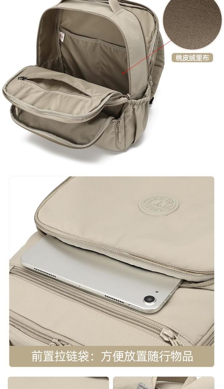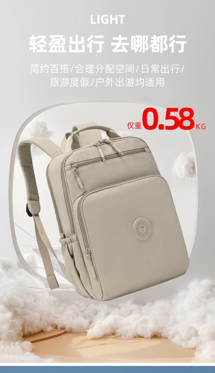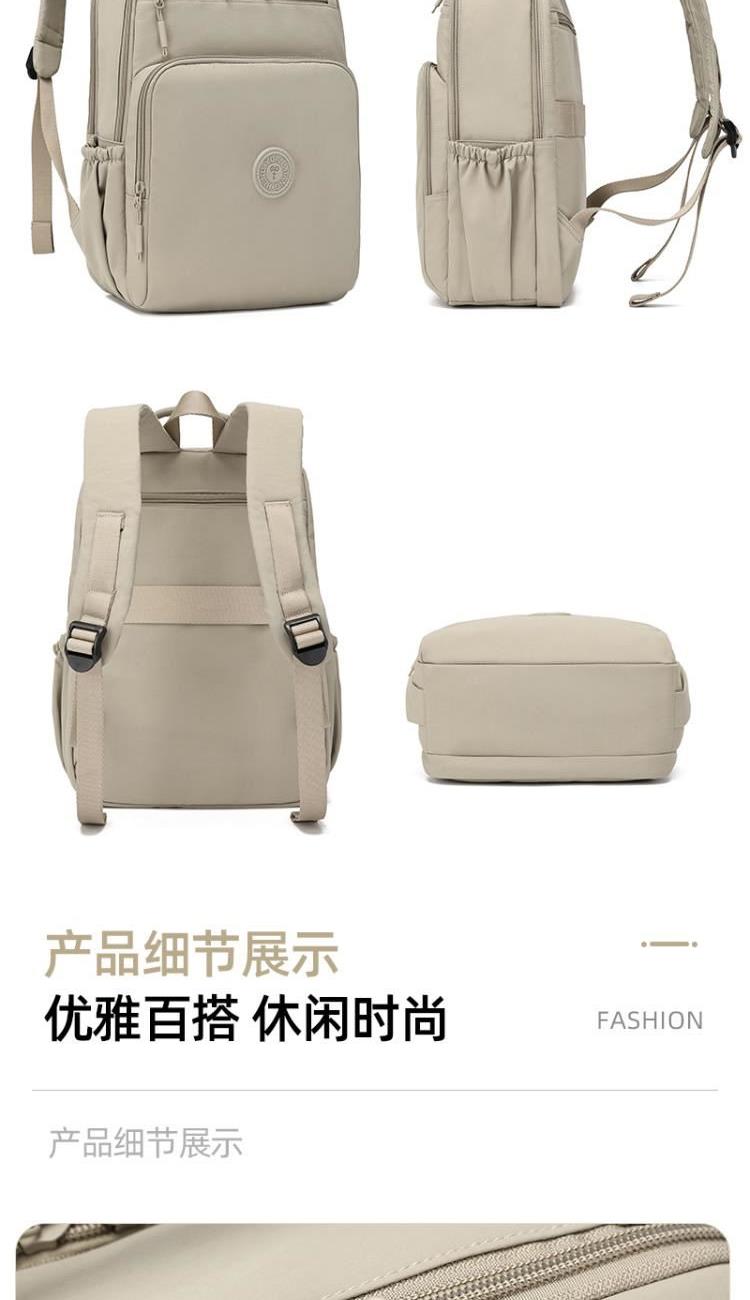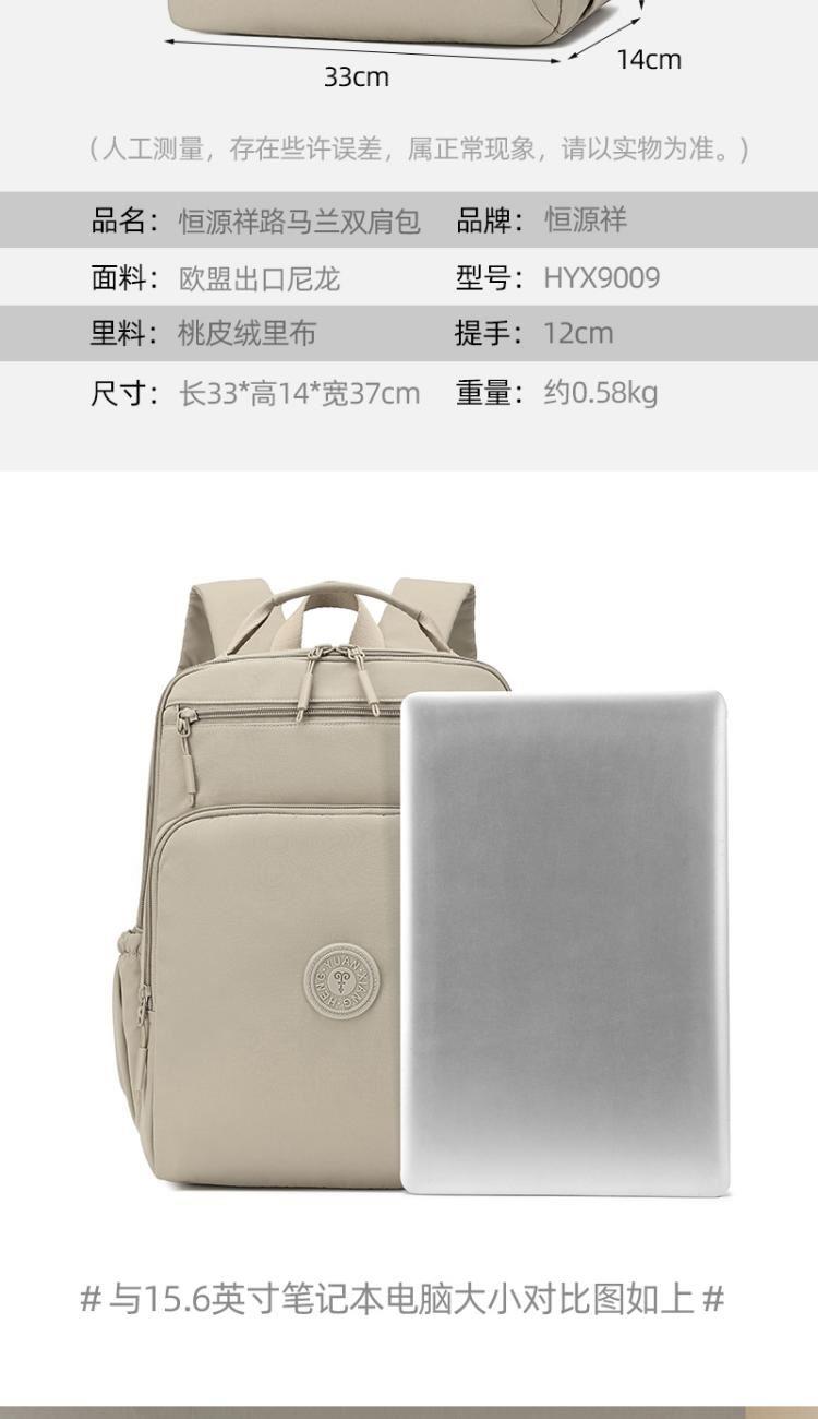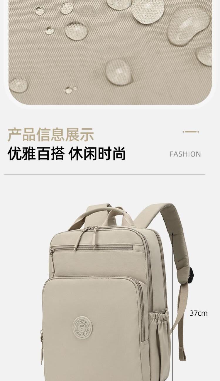 产品型号:HYX9009 产品重量:0.58kg 产品规格:37*33*14cm 产品颜色:卡其色 产品卖点:优选欧美出口畅销防水尼龙材质,时尚、结实; 全配色设计,美观大方; 桃皮绒里布材质 ,柔软,细腻; 五层收纳空间,内置拉链暗袋+手机插袋,功能齐全; 尼龙织带,手感细腻,结实耐用; 背部拉杆织带,两侧水杯雨伞袋,出行更便捷。
