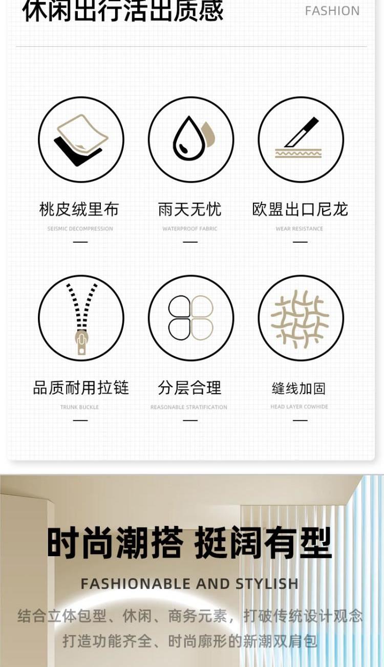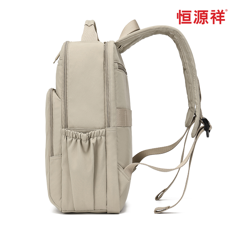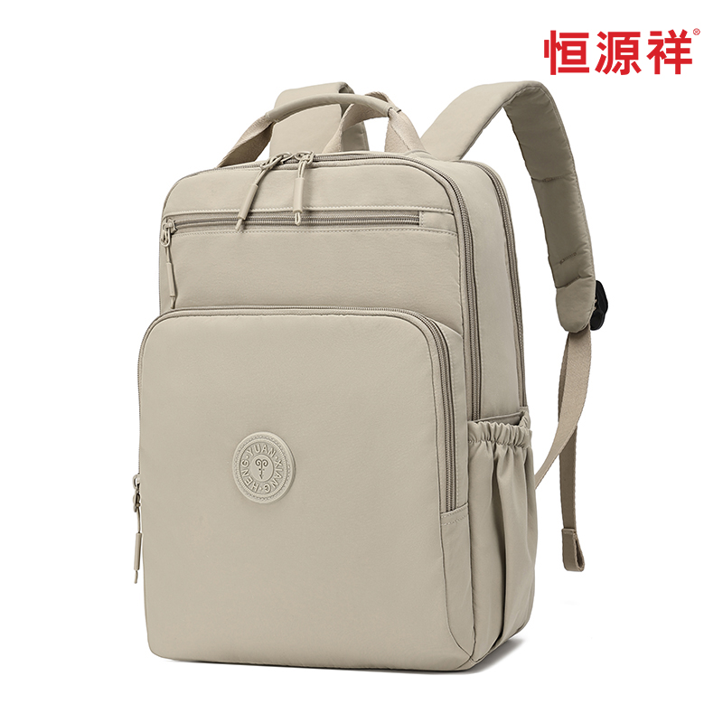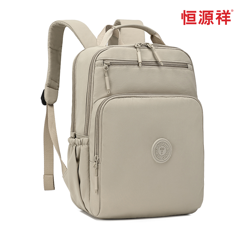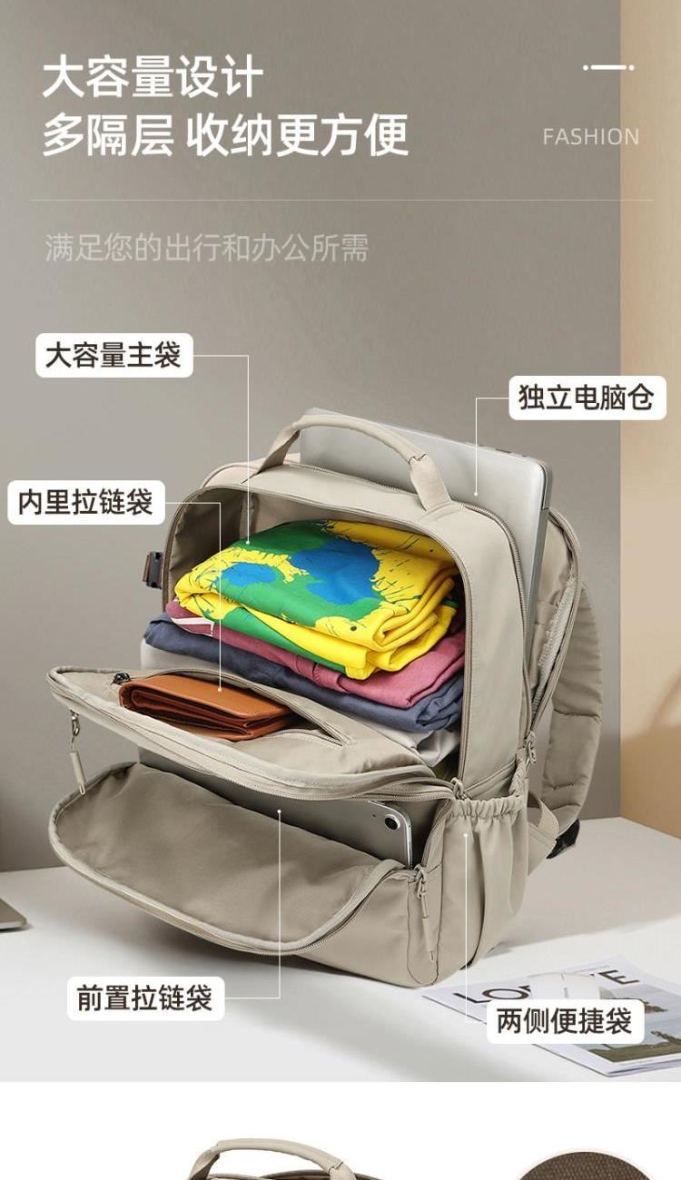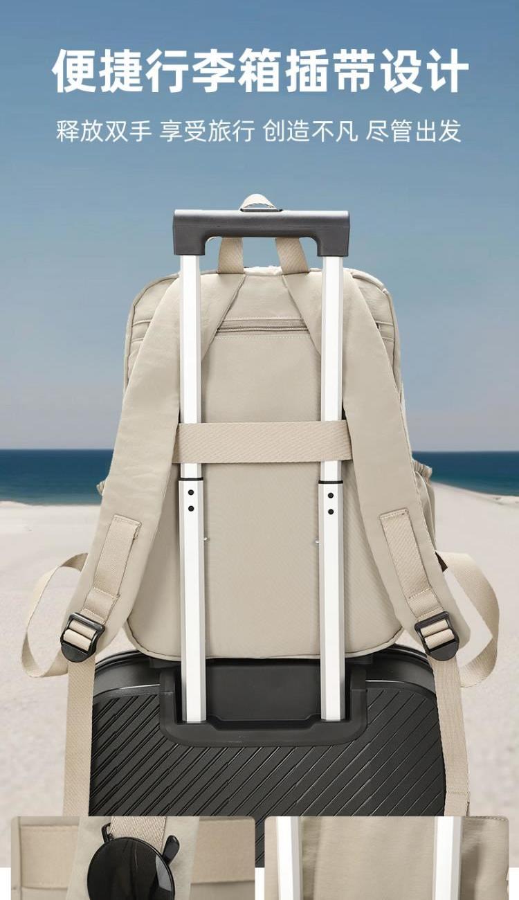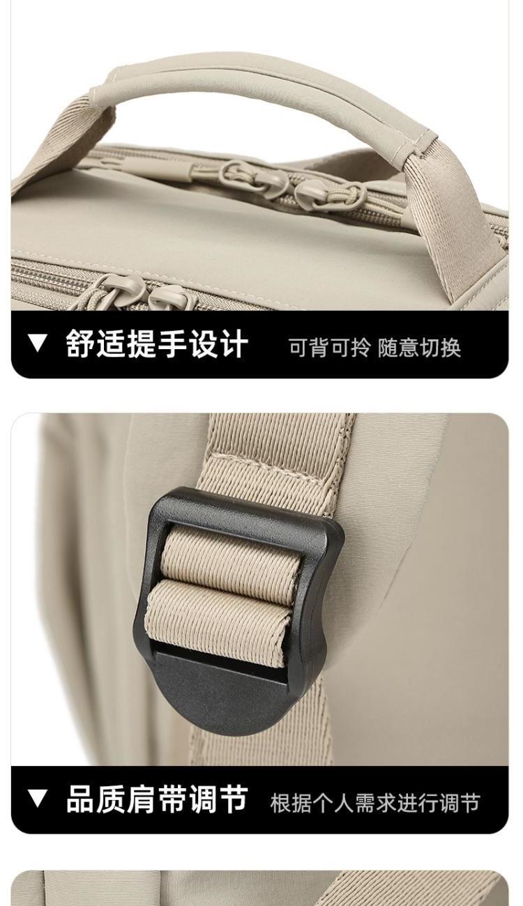 产品型号:HYX9009 产品重量:0.58kg 产品规格:37*33*14cm 产品颜色:卡其色 产品卖点:优选欧美出口畅销防水尼龙材质,时尚、结实; 全配色设计,美观大方; 桃皮绒里布材质 ,柔软,细腻; 五层收纳空间,内置拉链暗袋+手机插袋,功能齐全; 尼龙织带,手感细腻,结实耐用; 背部拉杆织带,两侧水杯雨伞袋,出行更便捷。