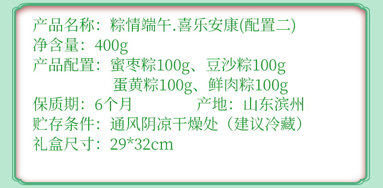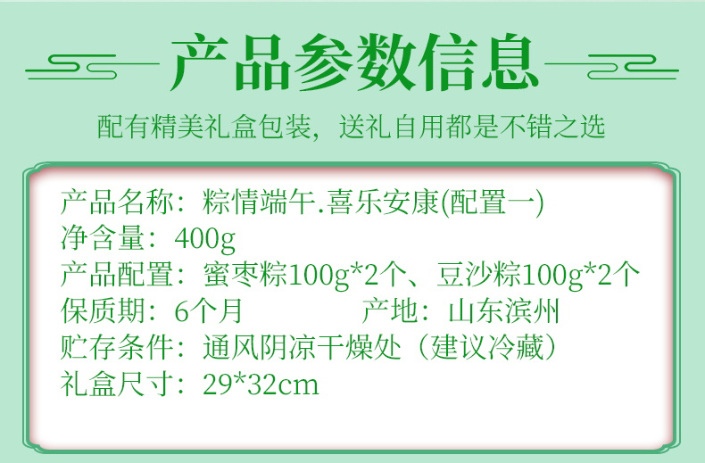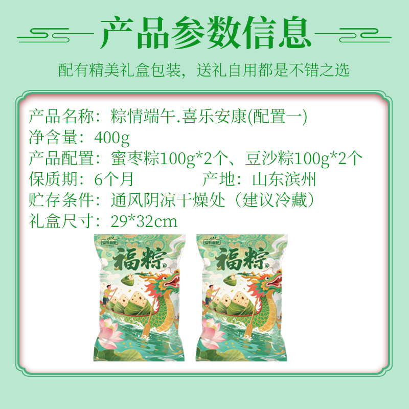 棕情端午喜乐安康 净含量:400g 产品规格配置:蜜枣口味粽子100g*2 豆沙口味粽子100g*2 袋尺寸:29*32cm 箱尺寸:43*40*30.5 箱体箱重量:14.55kg 体积:0.052方