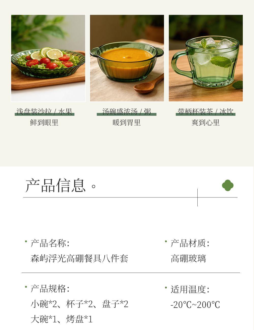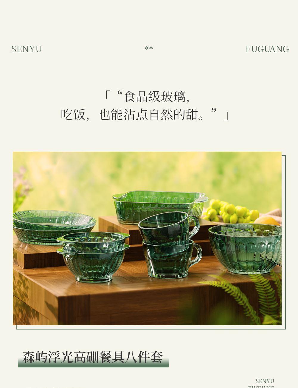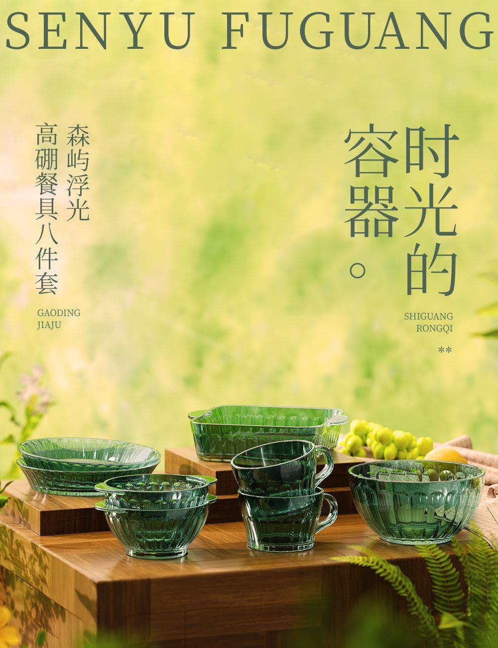 材 质:高硼色料玻璃 产品参数:小碗*2、杯子*2、盘子*2、大碗*1、烤盘*1 产品卖点:1.它是原色玻璃:不是表面涂层,杜绝铅镉等重金属析出。 2.它是高硼硅材质:能从冰箱直接进烤箱,不炸裂,不娇气。 3.它是顶配厚度:竖纹肌理,重工加厚,手感无与伦比。 只服务懂行、追求极 致生活品质的客户。礼盒发售中,详情私信。