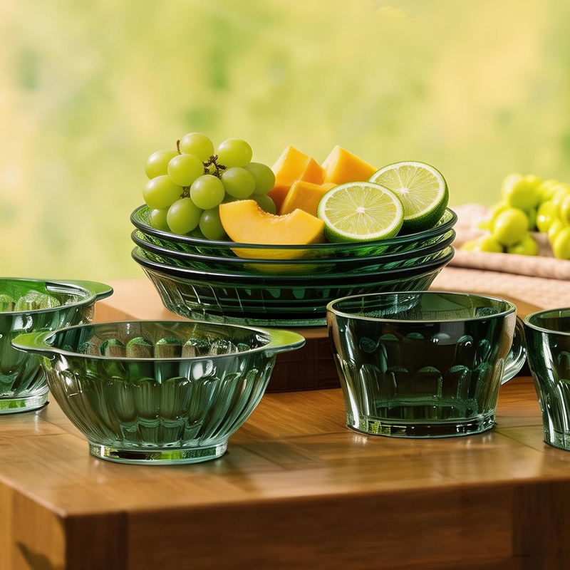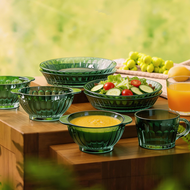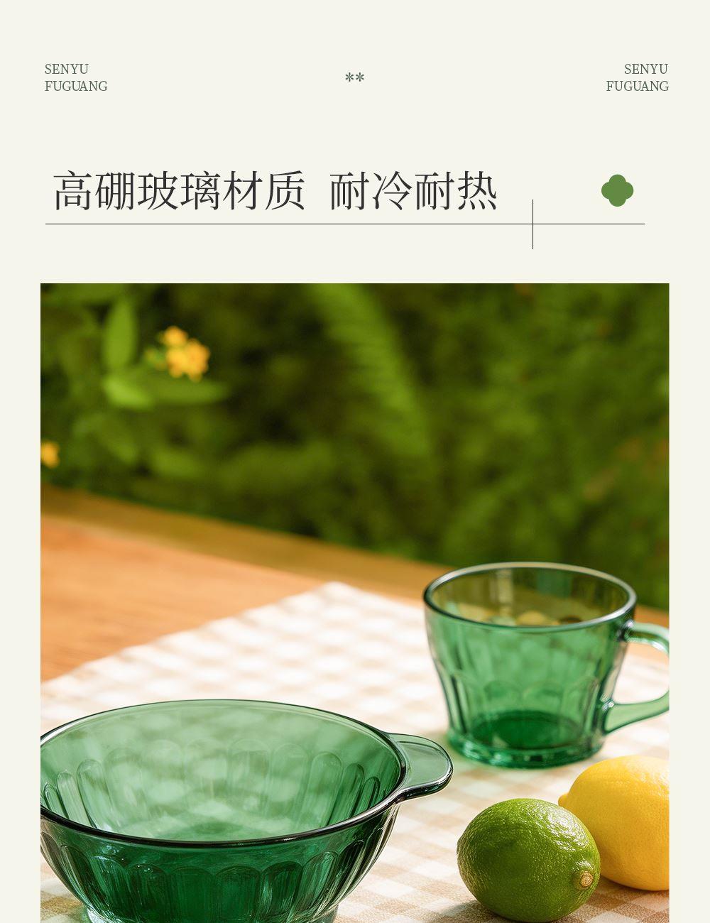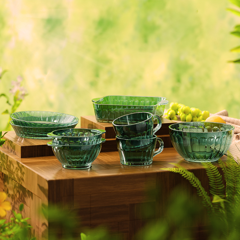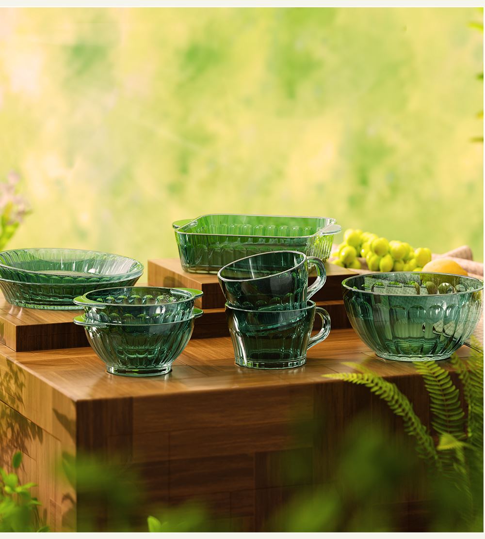 材 质:高硼色料玻璃 产品参数:小碗*2、杯子*2、盘子*2、大碗*1、烤盘*1 产品卖点:1.它是原色玻璃:不是表面涂层,杜绝铅镉等重金属析出。 2.它是高硼硅材质:能从冰箱直接进烤箱,不炸裂,不娇气。 3.它是顶配厚度:竖纹肌理,重工加厚,手感无与伦比。 只服务懂行、追求极 致生活品质的客户。礼盒发售中,详情私信。