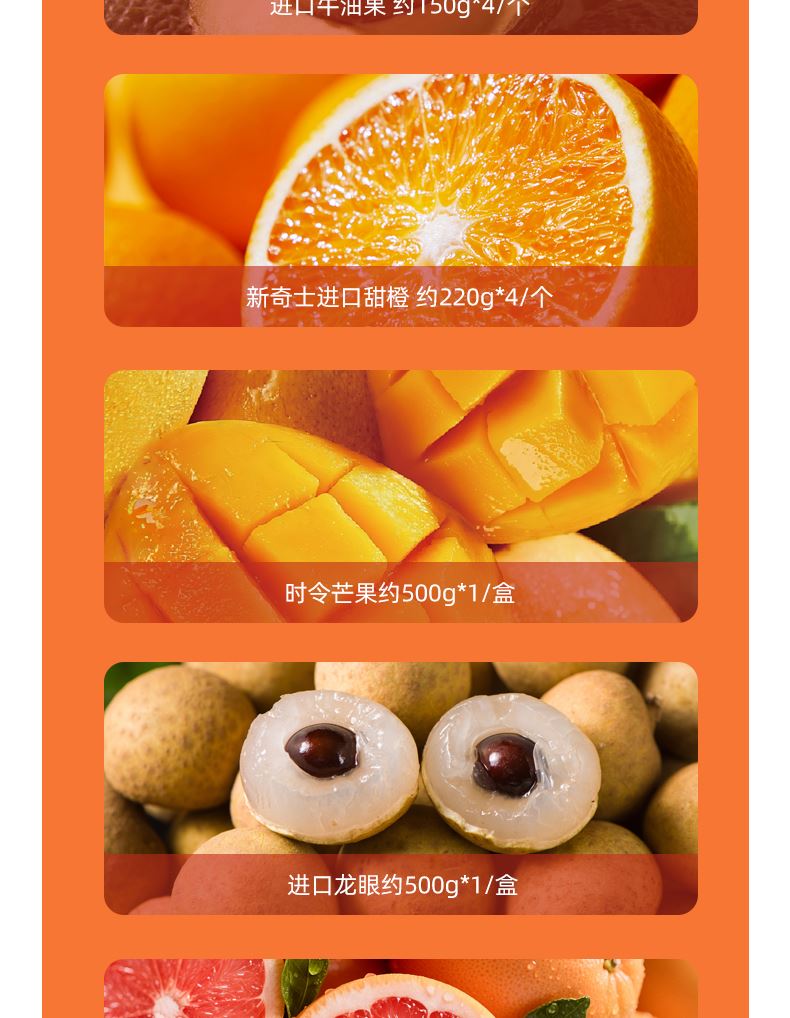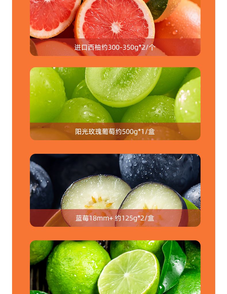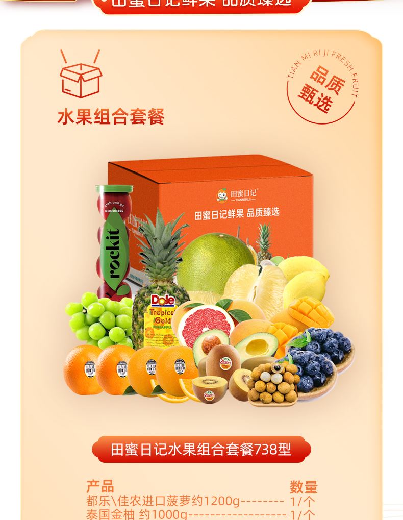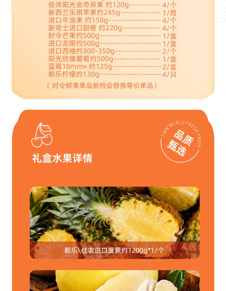 "都乐\佳农进口菠萝约1200g*1/个 泰国金柚 约1000g*1/个 佳沛阳光金奇异果 约120g*4/个 新西兰乐琪苹果约245g*1/筒 进口牛油果 约150g*4/个 新奇士进口甜橙 约220g*4/个 时令芒果约500g*1/盒 进口龙眼约500g*1/盒 进口西柚约300-350g*2/个 阳光玫瑰葡萄约500g*1/盒 蓝莓18mm+ 约125g*2/盒 都乐柠檬约130g*4/只 ( 时令鲜果单品断档会替换等价单品)"