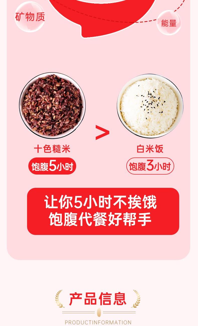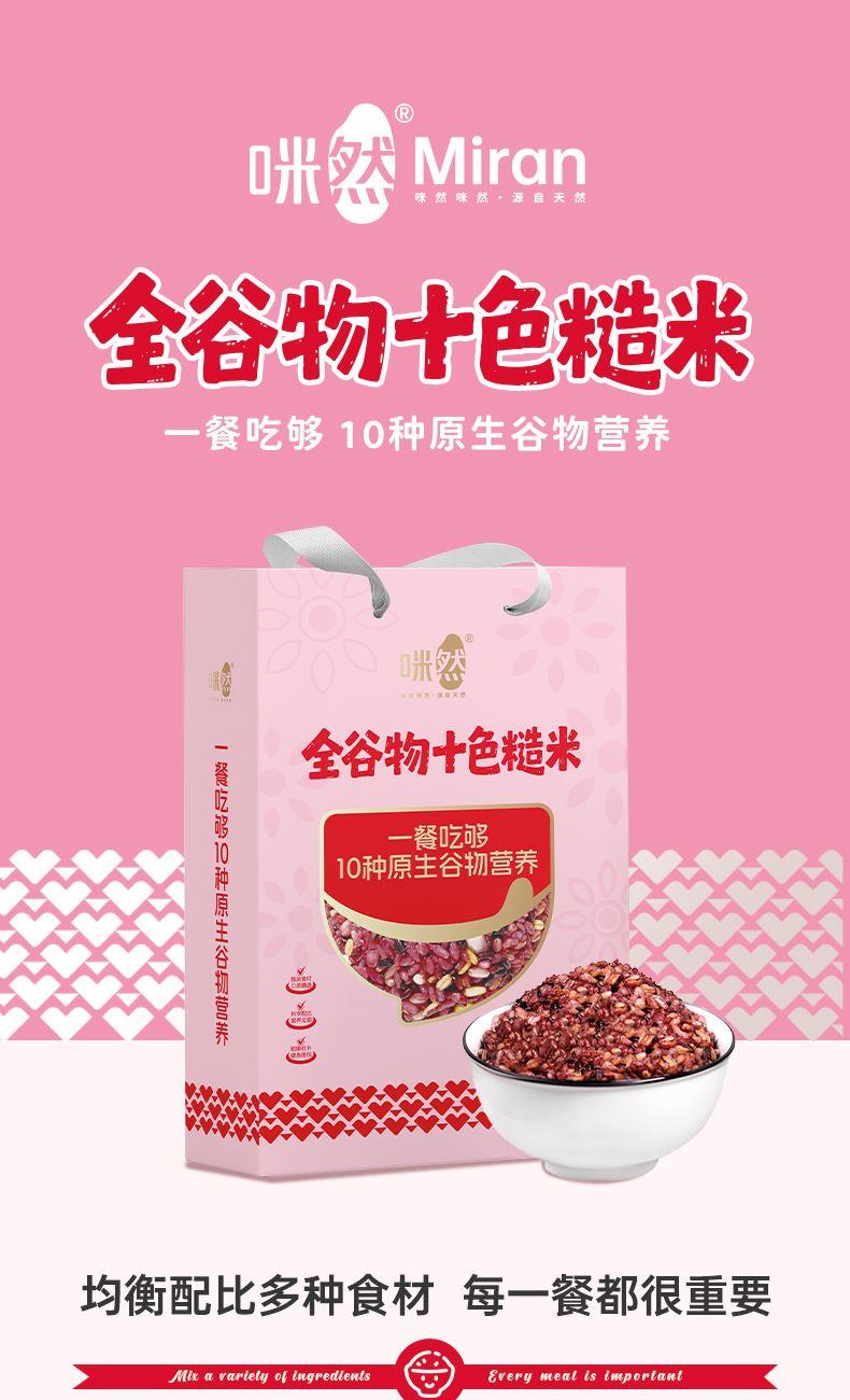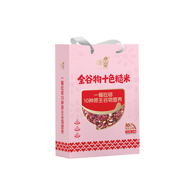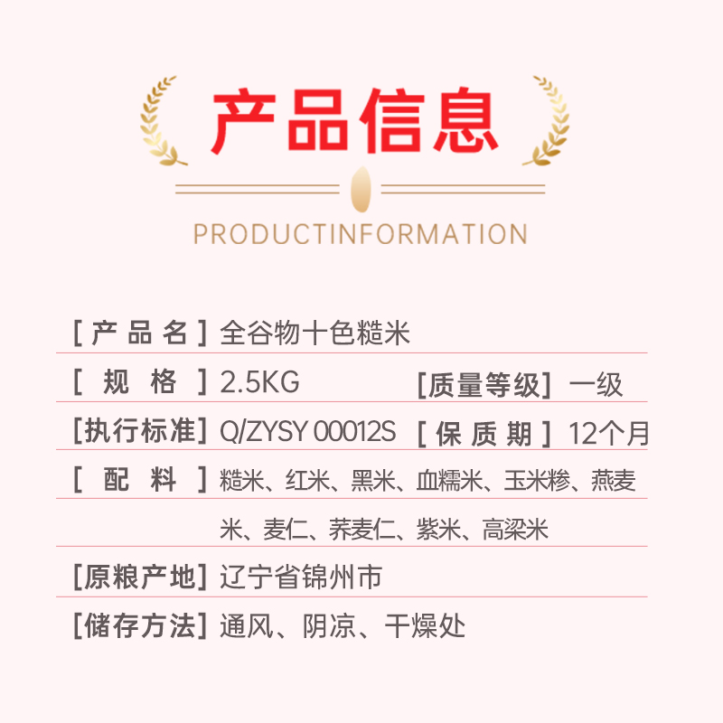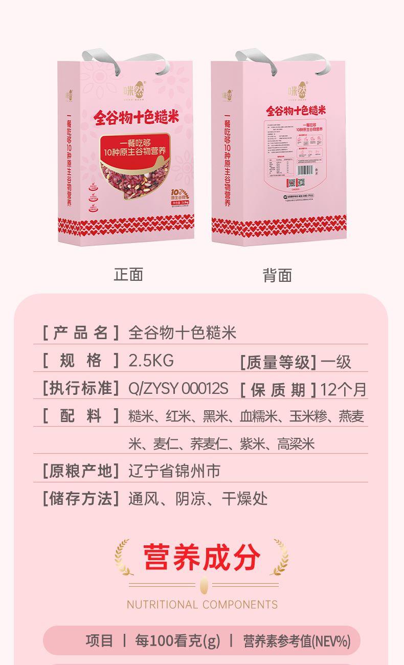 产 品 : 咪然全谷物十色糙米2.5kg 执行标准 : Q/ZYSY 00012S 保 质 期 :12个月 产 地 : 辽宁省锦州市 箱 规 :8*2.5kg 内配:糙米、红米、黑米、血糯米、玉米糁、燕麦米、麦仁、荞麦仁、紫米、高梁米