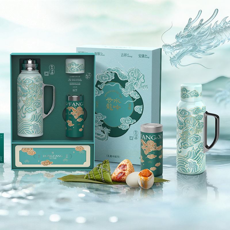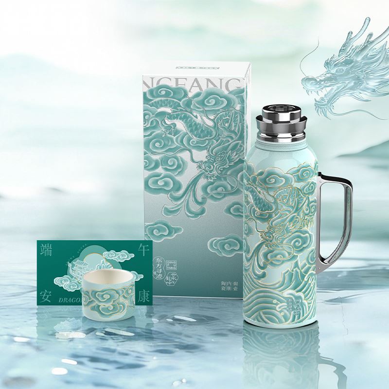 配置 · ① 陶瓷内胆焖壶×1把(820ml) (SUS-316内胆丨304外壳丨内胆/杯盖内壁喷瓷) ② MiNi保温杯×1只(200ml) (SUS-316内胆) ③ 发芽糙米粽×2只(100g/只) ④ 超大海鸭蛋×2只(80g/只) ⑤ 端午礼卡×1份 ⑥ 云水龙吟礼盒×1套(含袋) 尺寸 · 380×275×95mm