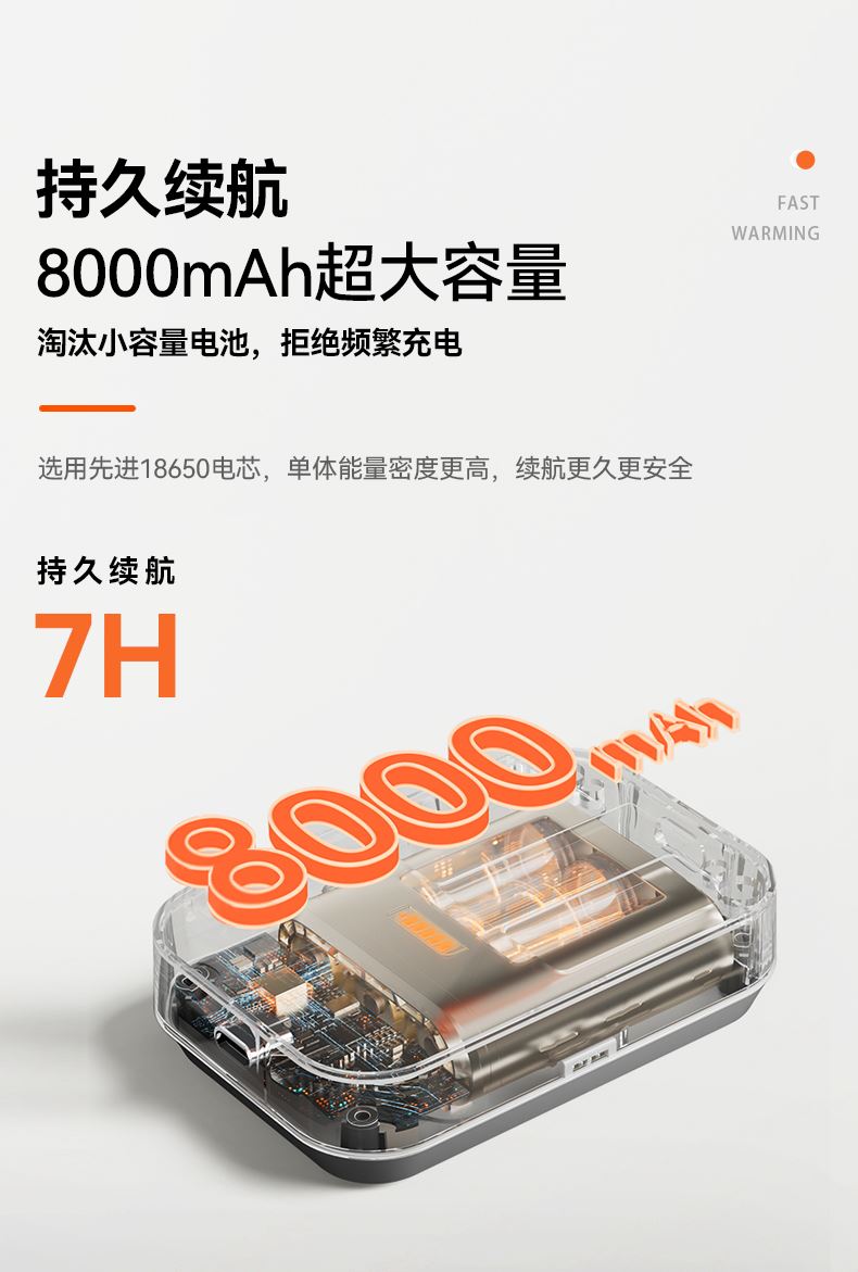 主打艾灸热敷 【大面积热敷】:石墨烯发热片 5秒速热,发热面积高达21000mm²,腰部全覆盖,此款升级腰部、腹部都有发热效果。 【药草滋养】:陈艾红花 艾灸熏蒸,暖腰祛湿 【高频震动】:高频震动马达7000转/分,三档模式,多重享受 【超长续航】:8000毫安超大容量,无需频繁充电。
