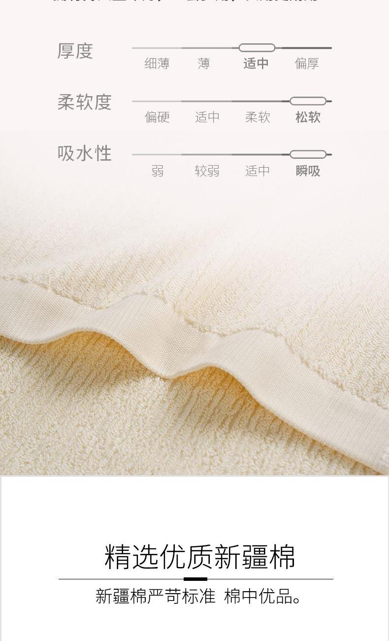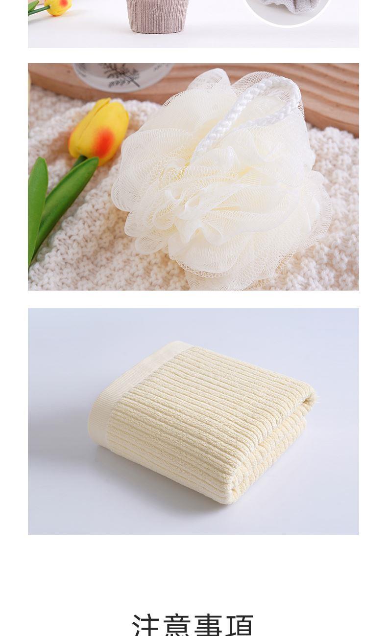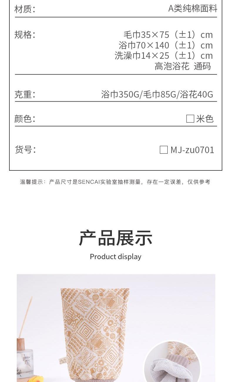 规 格:浴巾70×140(±1)cm 毛巾35×75(±1)cm 洗澡巾14×25(±1)cm 高泡浴花 通码 克 重:浴巾350g/毛巾85g/浴花40g 材 质:A类纯棉 颜 色:米色 包装尺寸:42×31×7cm