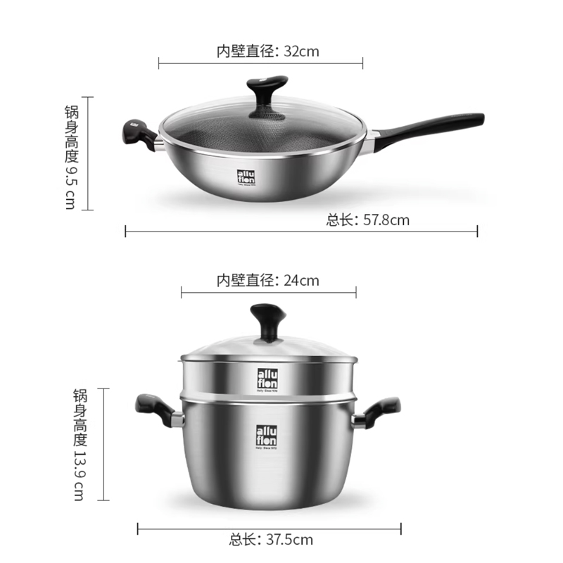 规格:24cm汤蒸锅+32cm炒锅 材质:铝合金 入箱:2套 单个尺寸:605*410*560 1、全屏晶刚纹、超强耐用 2、三层复合钢锅身、坚固耐用 3、锅内无铆钉杜绝藏污纳垢 4、欧式鼓型锅身、简约、上蒸下煮。