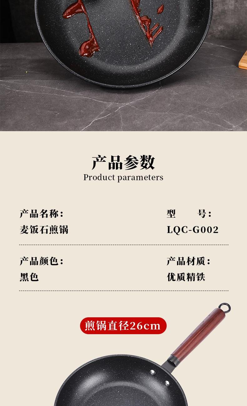 规 格:26cm煎锅 产品材质:优质精铁 适用灶具:煤气明火,电陶炉 包装尺寸:L27.8*W7.8*H47.5CM 1、采用麦饭石工艺以及优质精铁打造锅身,采用耐高温不沾涂层工艺,油烟少,不粘效果强。 2、煎牛排、煎蛋、煎鱼;煎炒两用,功能强大。