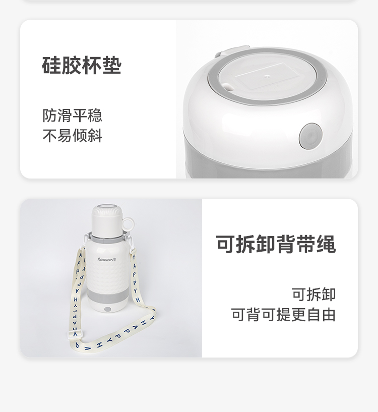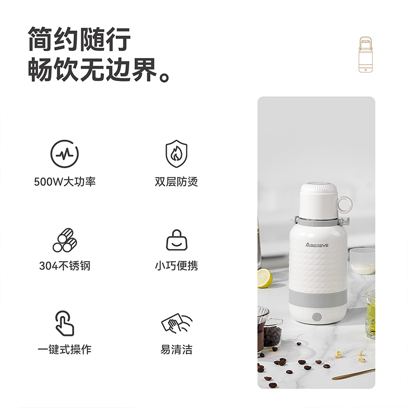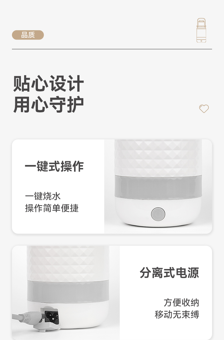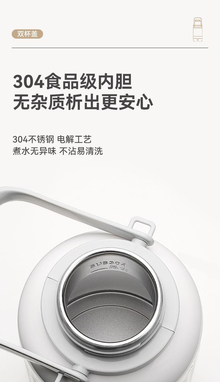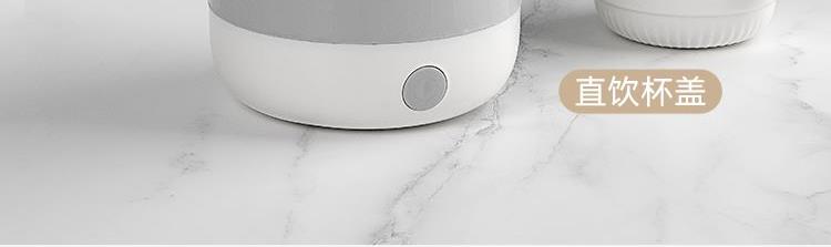 产品颜色:白色 产品材质:PP+304不锈钢 额定电压:220v 额定频率:50Hz 额定功率:500w 额定容量:1.1L 产品净重:0.65kg 产品毛重:0.85kg 产品尺寸:109*109*202mm 包装尺寸:138*138*278mm 外箱尺寸:595*448*555mm ◁1100ml大容量,满足畅饮需求 ◁ 一杯双盖,食品级硅胶吸管+食品级304不锈钢,一壶多用 ◁大功率500W功率设计,烧水快 ◁操作面板一键式操作,指示灯显示,简单明了 ◁设有挎绳方便外出携带+电源线分体方便收纳
