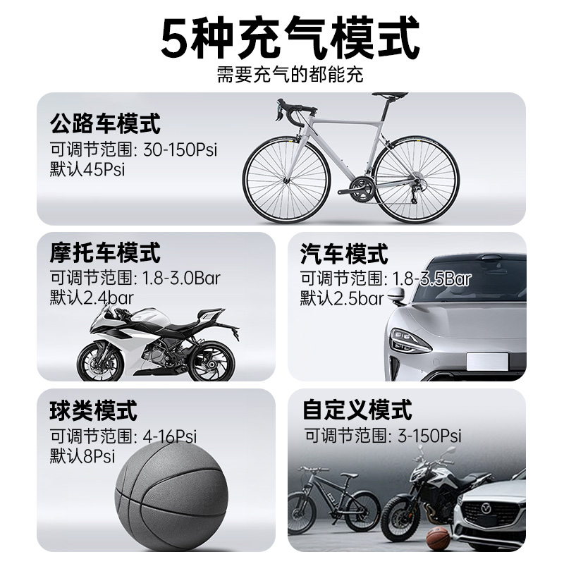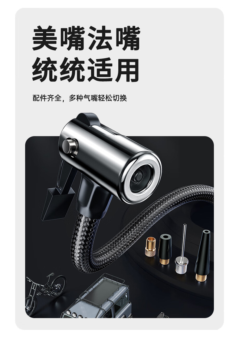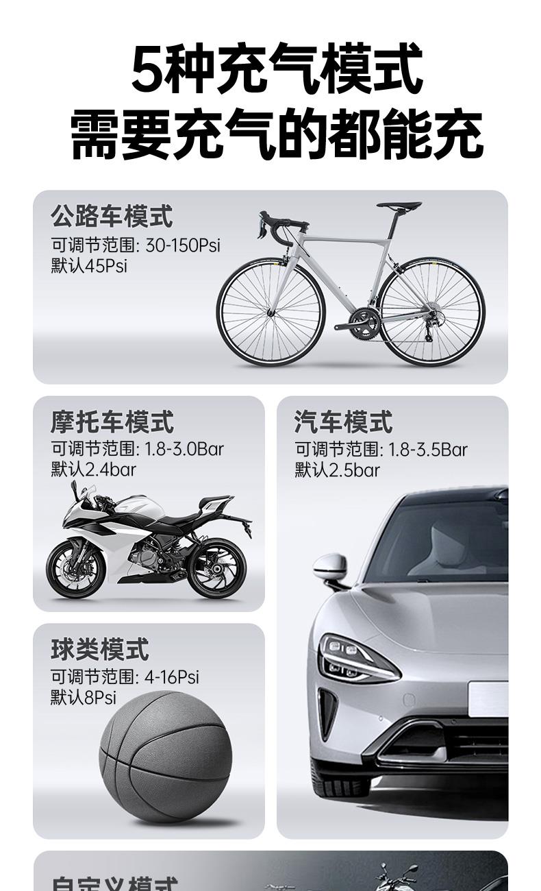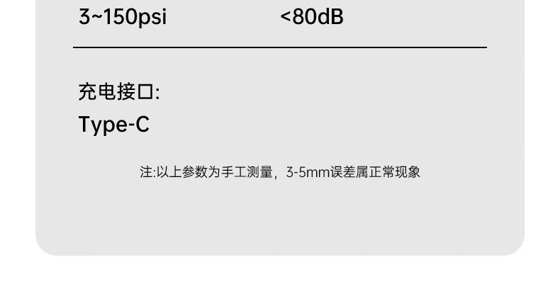 产品颜色:灰色 类型:无线款 材质:ABS +PC 充电时长:2-3小时 电池容量:600mAh*3 工作时长:15-30分钟 产品配件:充气泵(内置电池)× 1;气管×1;USB-A转Type-C数据线 × 1 ;产品说明书 × 1 ;配件包 × 1 适用:汽车/电动车/球类/自行车可用,2.5个压或以下的轮胎适用 产品尺寸:80*42*91mm 包装尺寸:140*52*132mm 整箱数量:20 单品重量:290克