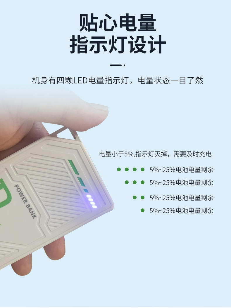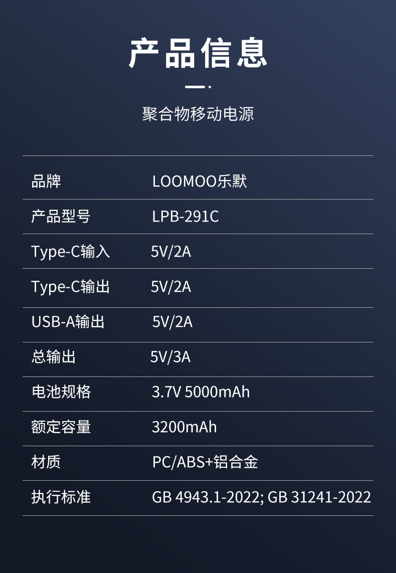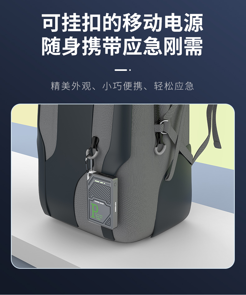 TYPE-C输入:5V=2A Type-C输出:5V=2A USB-A输出:5V=2A 总输出:5V=3A 电池规格: 3.7V 5000mAh 额定容量:3200mAh 材质:PC/ABS+铝合金 颜色: 白.灰 高颜值可挂扣即插即用的小型“能量站”小体积 大用处,你的专属应急移动电源。可上飞机。