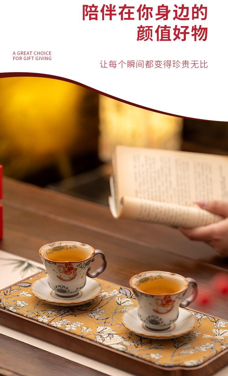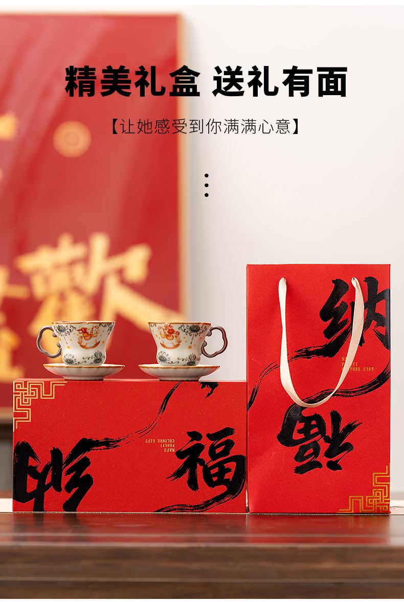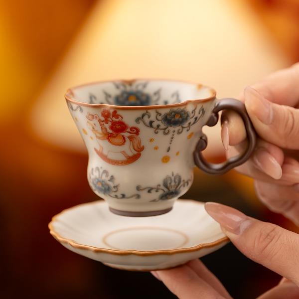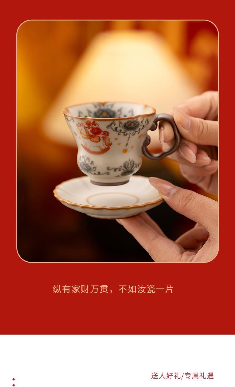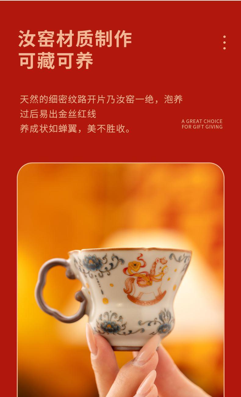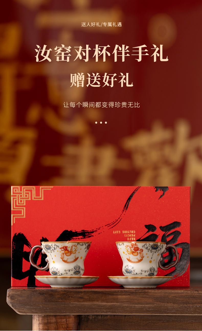 配 制:2杯 2碟 1礼盒 手提袋 材质:汝黄瓷 规格:杯子 6*9cm 碟子直径9.3cm高1.8cm 容量:70ml 推荐说明:马上有钱,马到成功杯子摆件套装。亚黄汝瓷,玛瑙入釉,蝉翼开片,家有千财万贯,不如汝窑一片。技术新品。画面堆料技术,富有立体浮雕质感,真实感强。杯身开片,可养瓷。