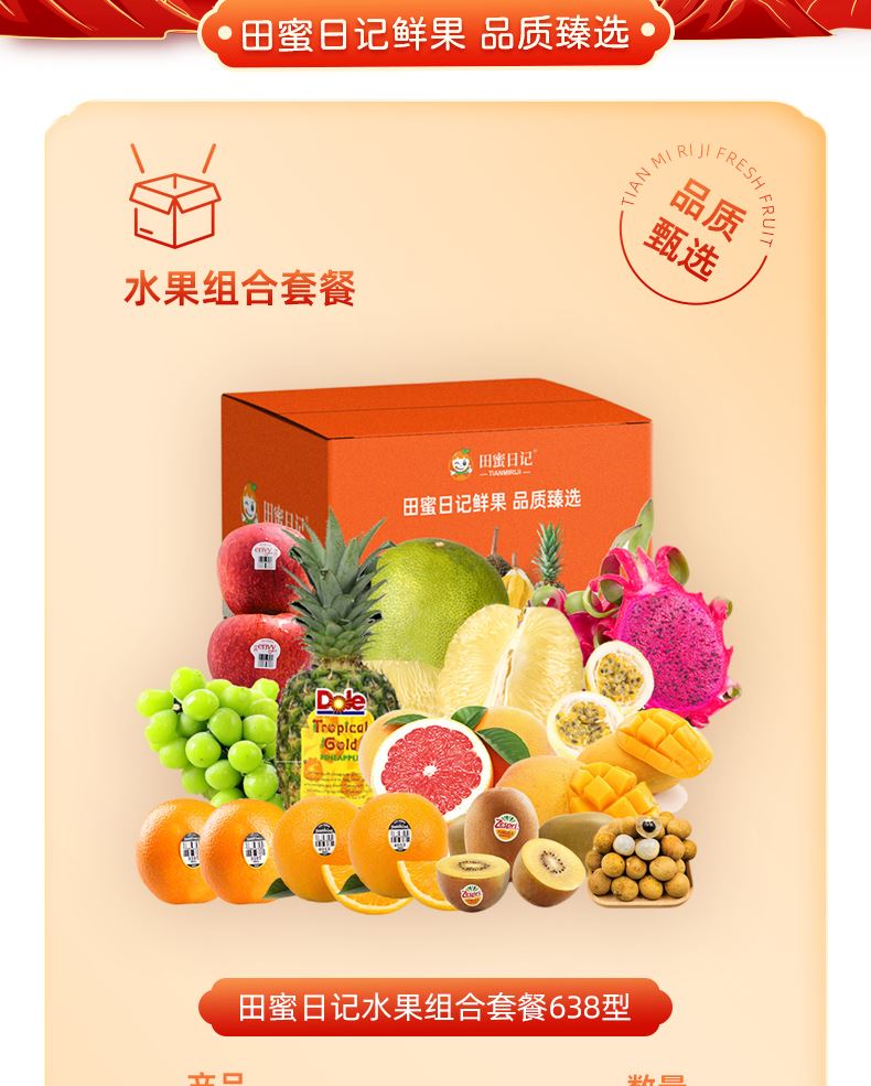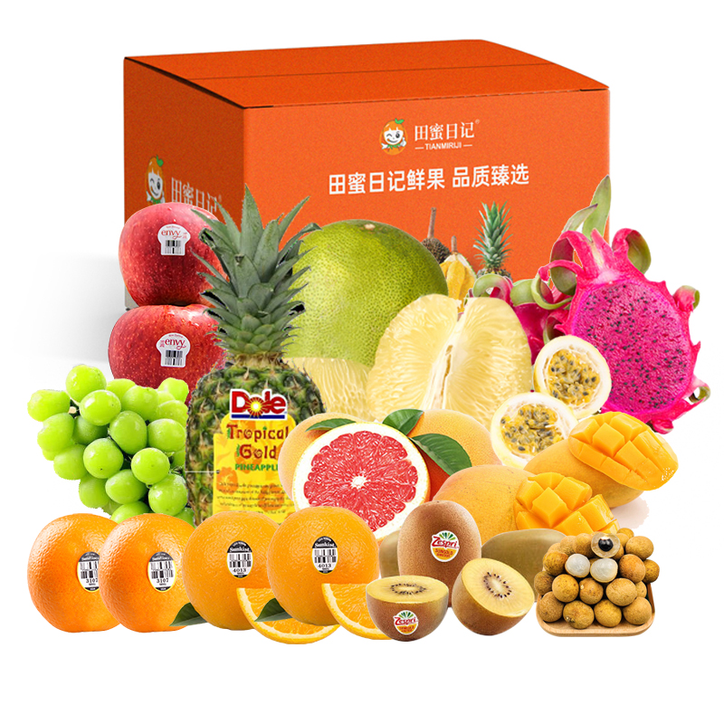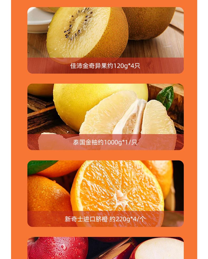 "都乐\佳农进口菠萝约1200g*1/个 佳沛金奇异果约120g*4只 泰国金柚约1000g*1/只 新奇士进口脐橙 约220g*4/个 进口爱妃苹果 约220g*2/个 进口西柚约300-350g*2/个 进口龙眼约500g*2/盒 都乐百香果约70g*4/个 蜜保火龙果约400g*2/个 时令芒果约500g*1/盒 阳光玫瑰葡萄约500g*1盒 ( 时令鲜果单品断档会替换等价单品)"
