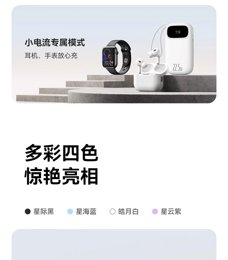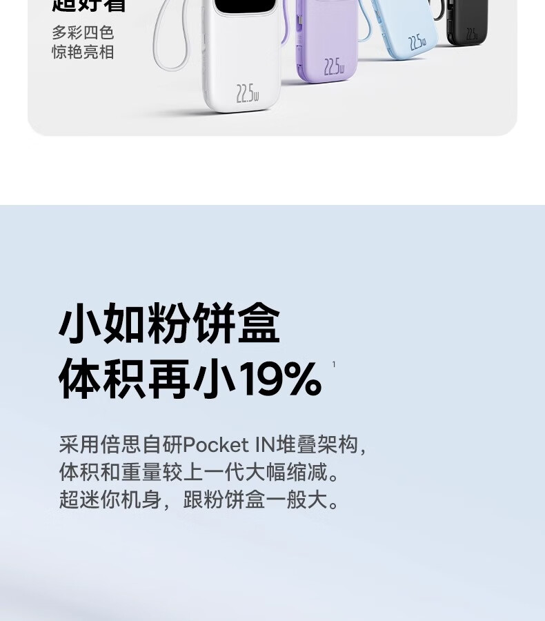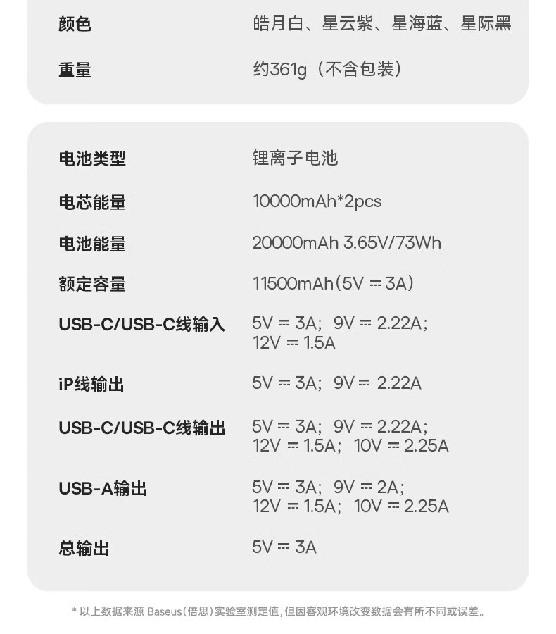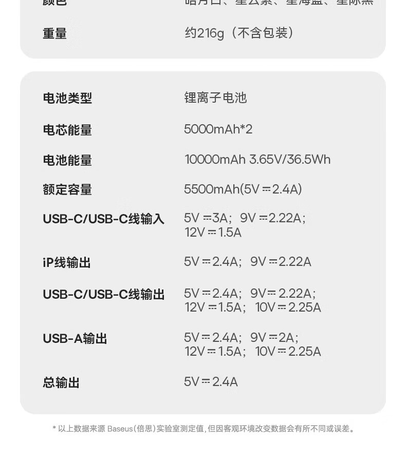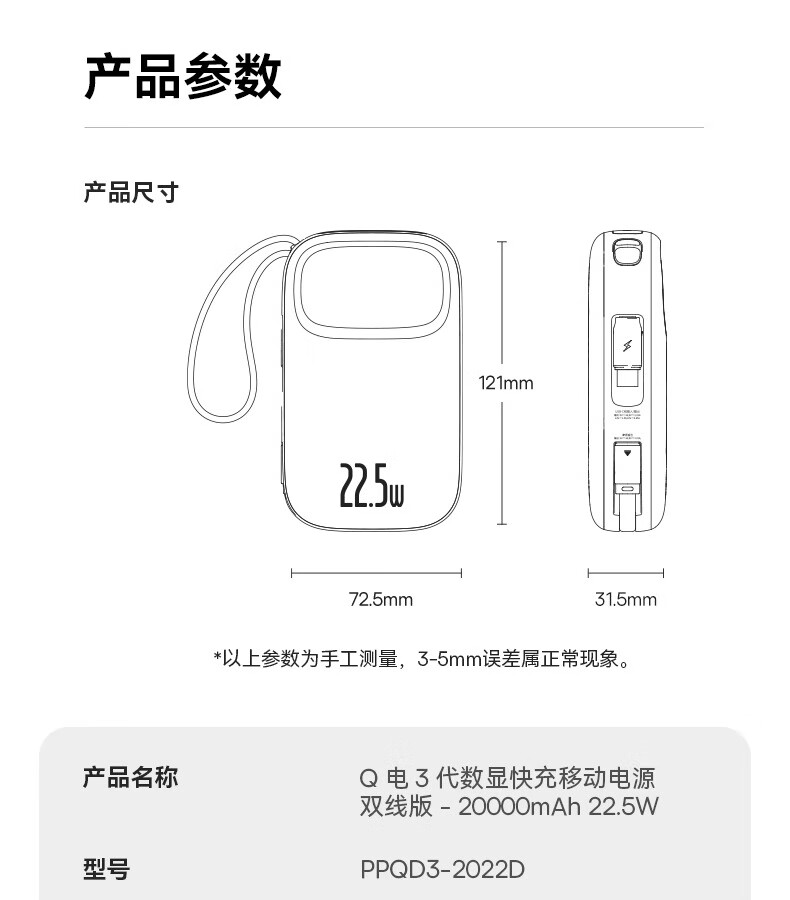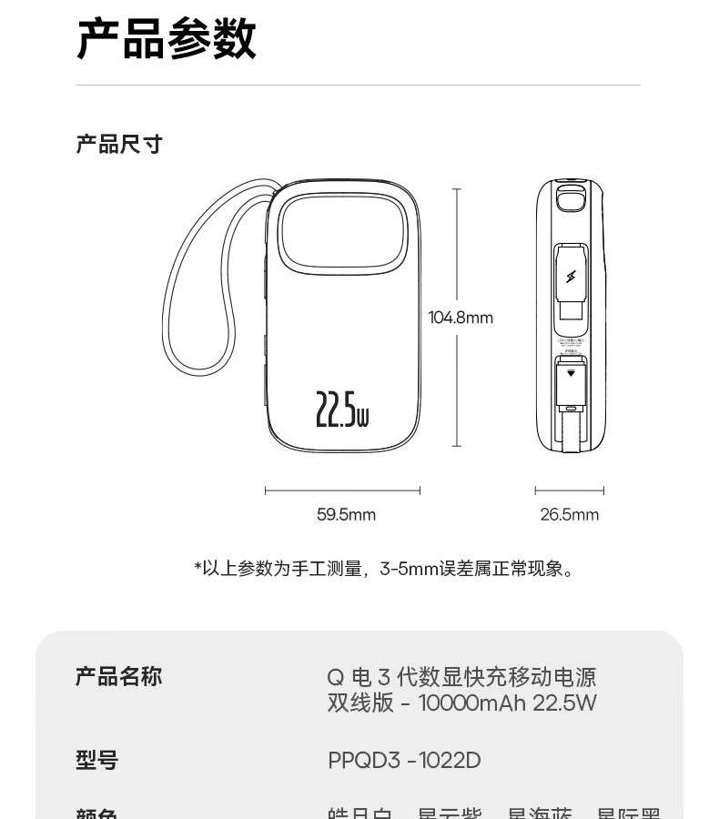 型号:PPQD3 -1022D 电芯类型:锂离子电池 颜色编码:P10081200212-02 皓月白 P10081200312-02星海蓝 P10081200512-02星云紫 P10081200122-01星际黑 包装尺寸:13*8.5*3.1cm 产品尺寸:10.1*5.5*2.5cm 产品净重:216g 输入方式:Type-c输入 电池容量:10000mAh 额定能量:36.5Wh 额定容量:5500mAh