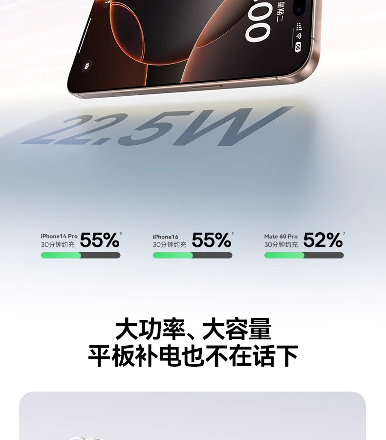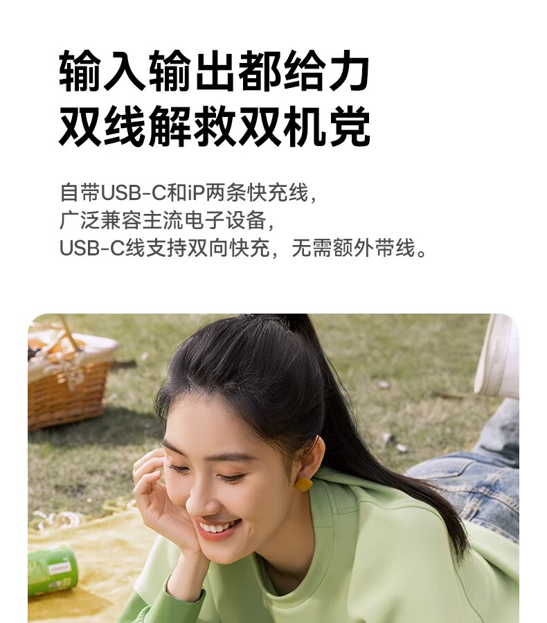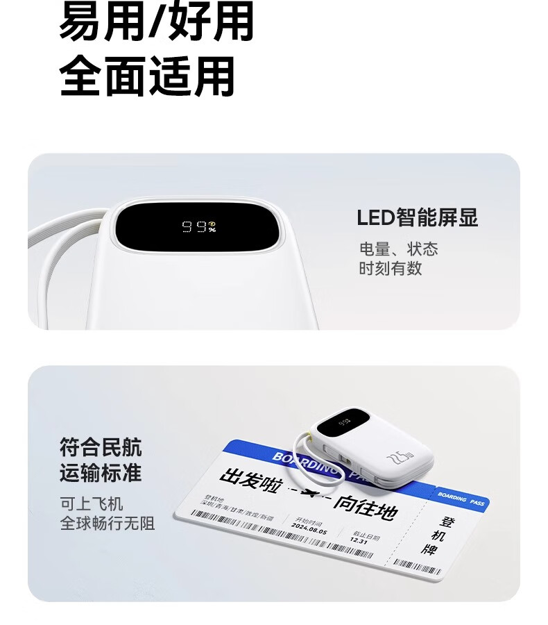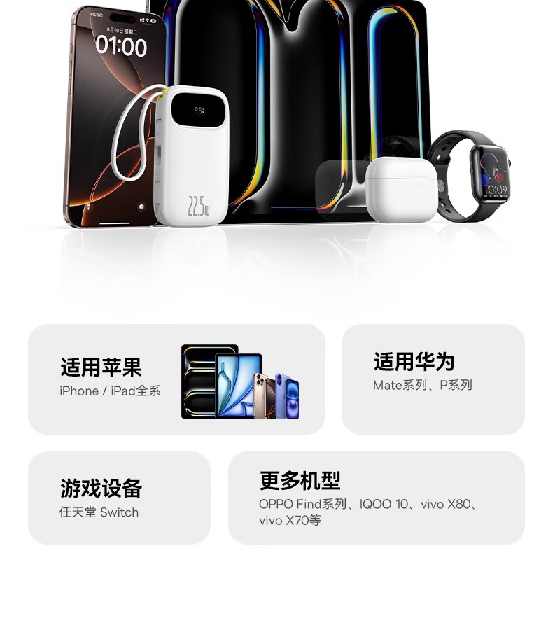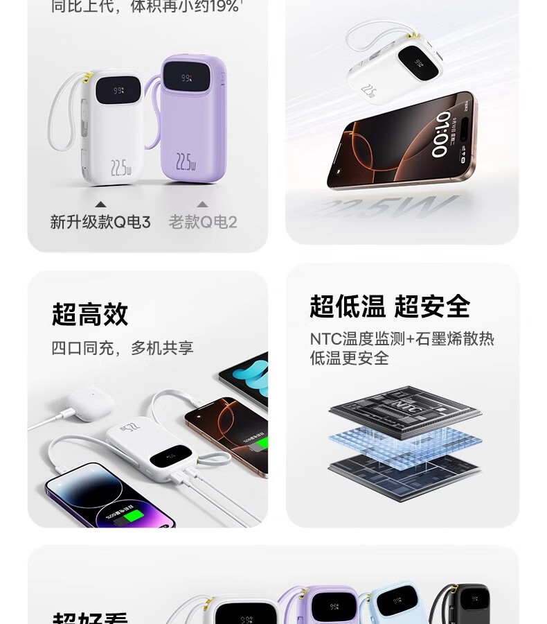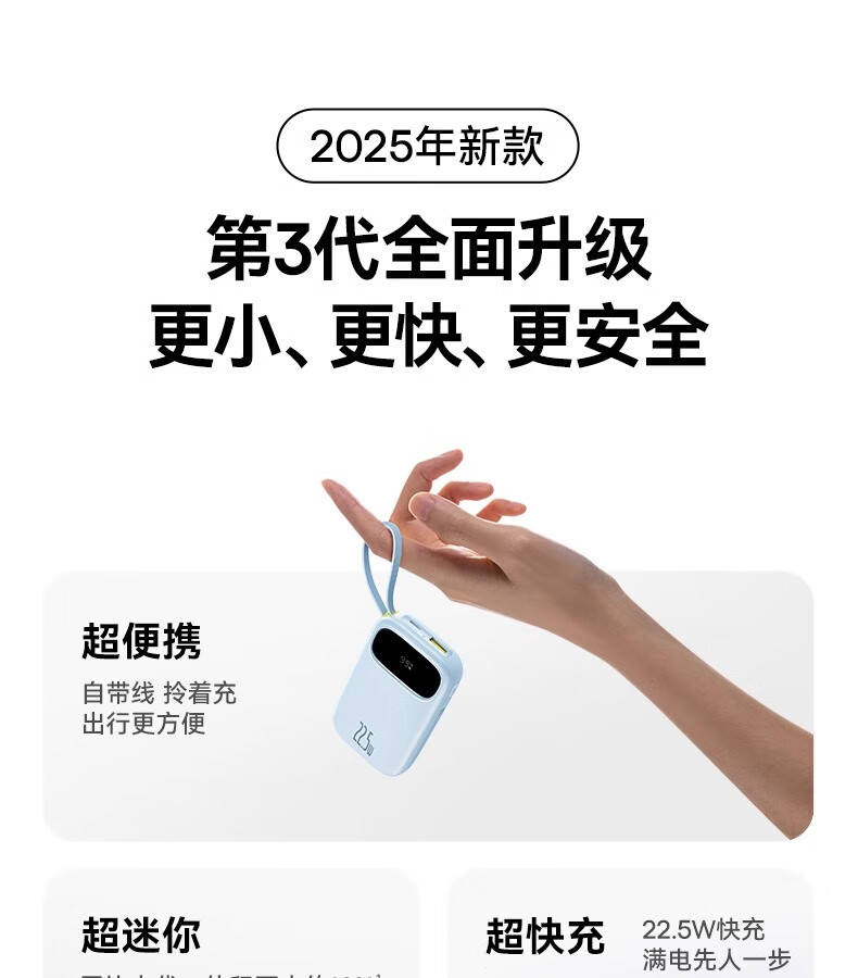 型号:PPQD3 -1022D 电芯类型:锂离子电池 颜色编码:P10081200212-02 皓月白 P10081200312-02星海蓝 P10081200512-02星云紫 P10081200122-01星际黑 包装尺寸:13*8.5*3.1cm 产品尺寸:10.1*5.5*2.5cm 产品净重:216g 输入方式:Type-c输入 电池容量:10000mAh 额定能量:36.5Wh 额定容量:5500mAh