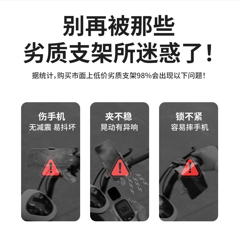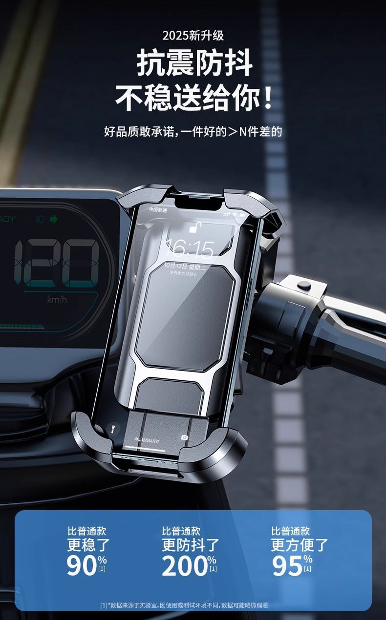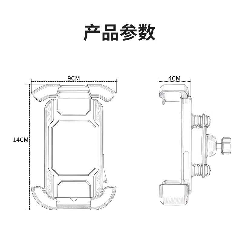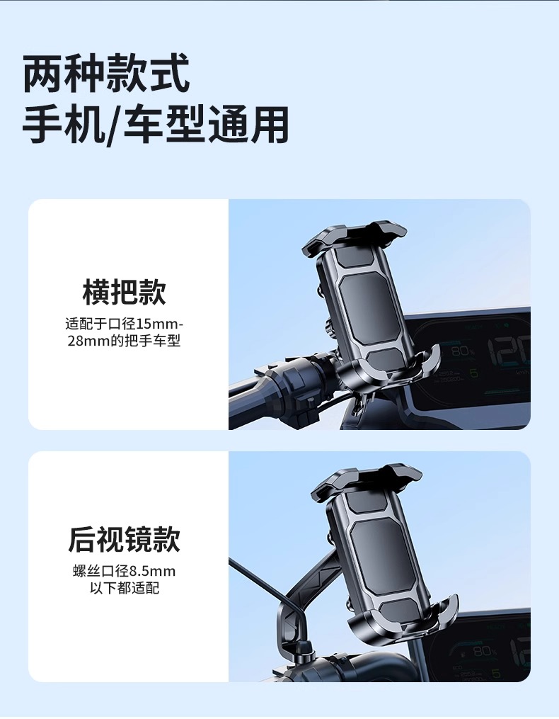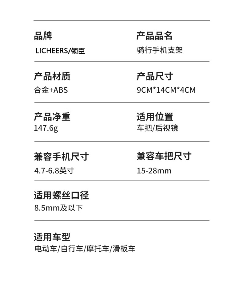 产品颜色:黑色 材料:合金+ABS 适用位置:后视镜(电动车/自行车/摩托车) 兼容车把手尺寸:15-28mm 适用:兼容4.7-6.8英寸的手机 产品尺寸:9*140*40mm 包装尺寸:95*83*139mm 整箱数量:60 单品重量:147.6g