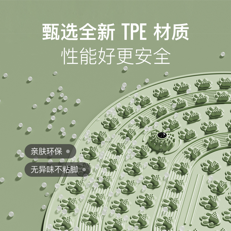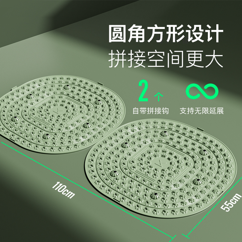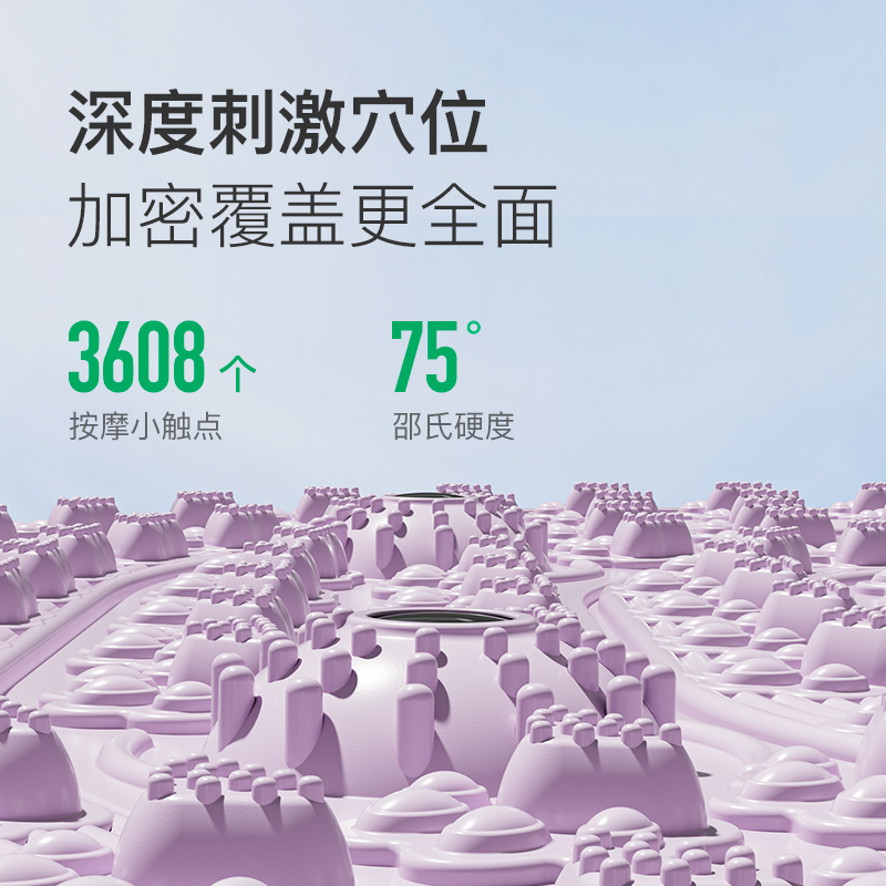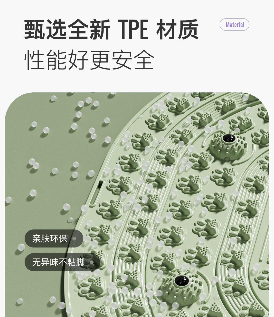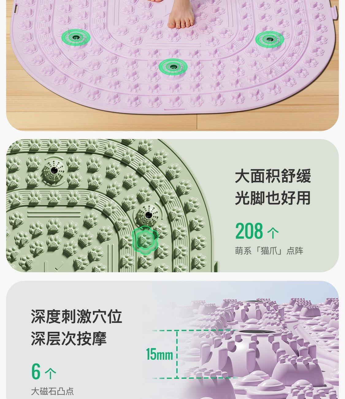 尺寸:55*55cm 颜色:绿色,粉色,紫色,灰色: 材质:TPE;环保无毒材质 方形圆角加大加密设计 287个仿「猫爪」 设计双分区多功能按摩 75°科学刺激硬度 支持无限串联拓展 3068个加密按摩凸点 可做浴室防滑垫