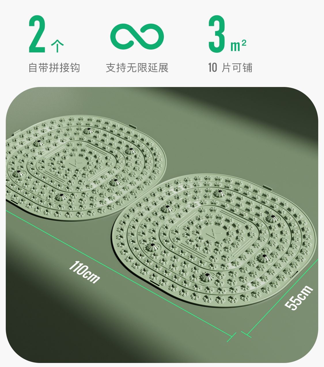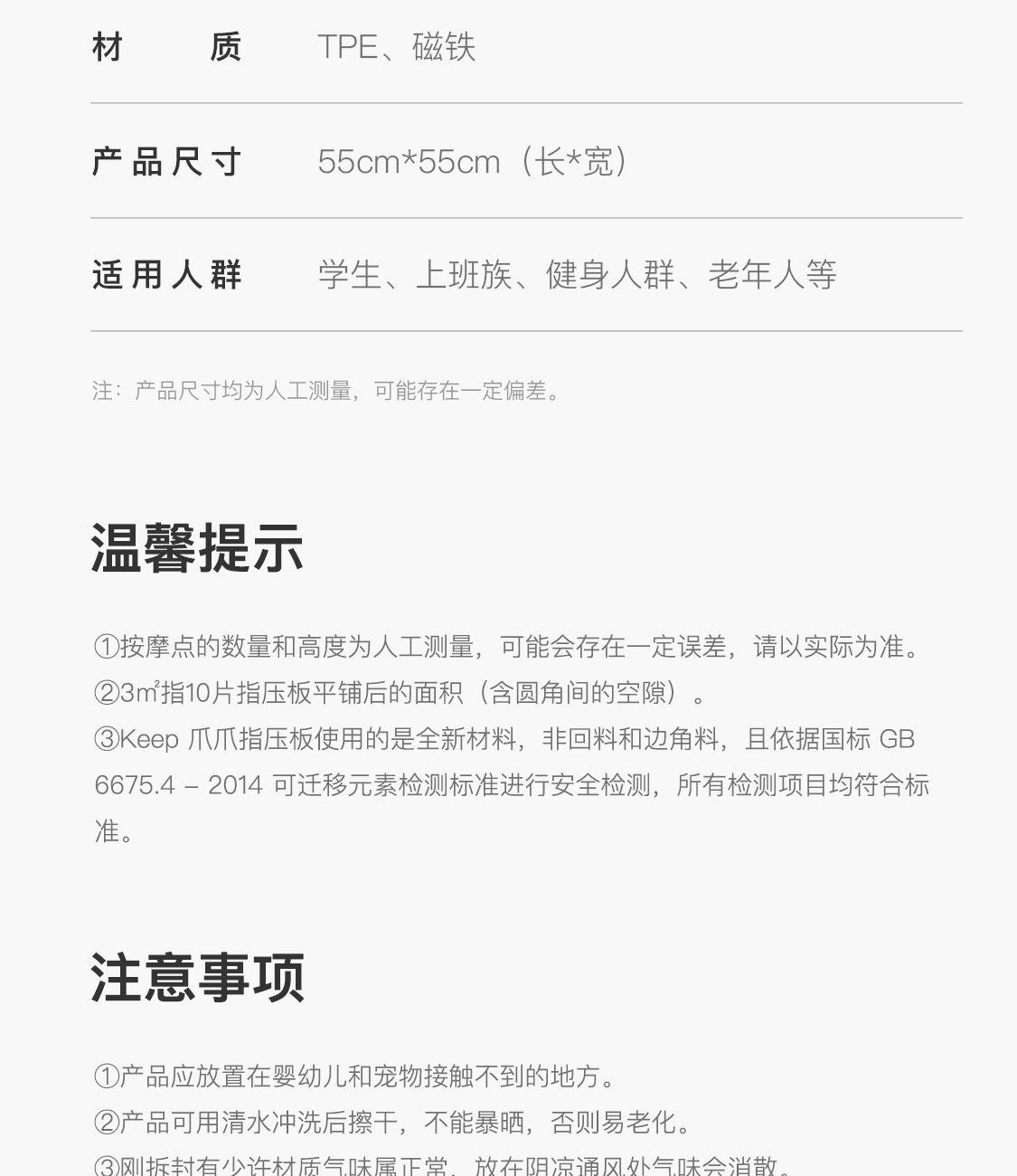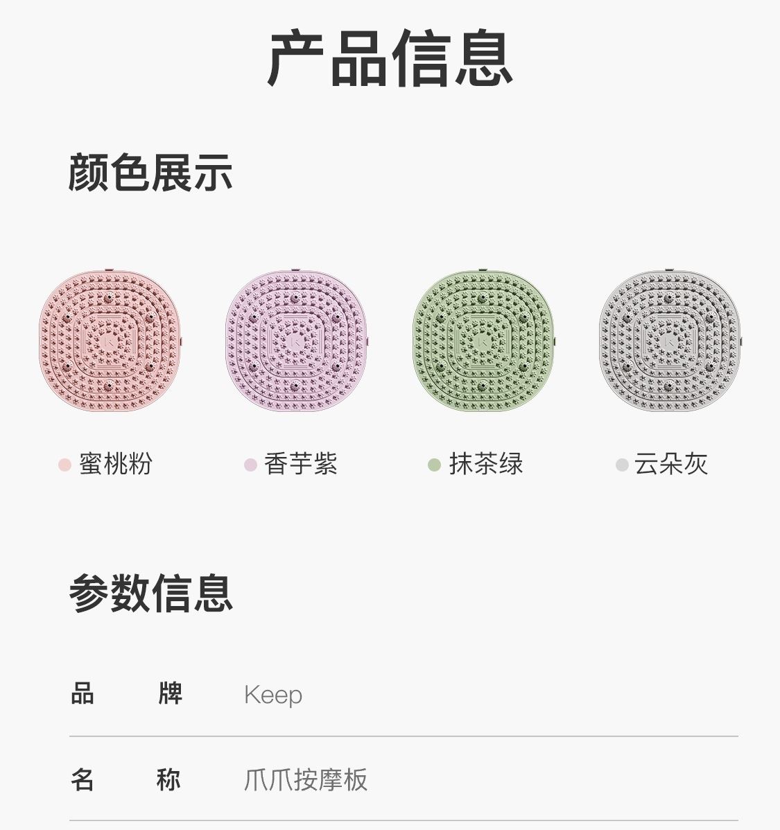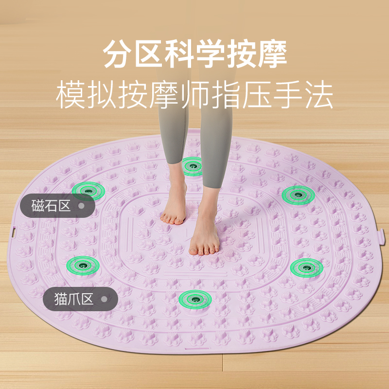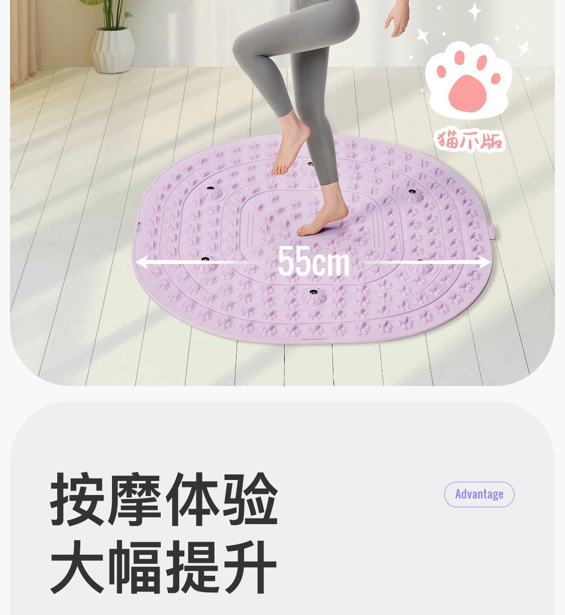 尺寸:55*55cm 颜色:绿色,粉色,紫色,灰色: 材质:TPE;环保无毒材质 方形圆角加大加密设计 287个仿「猫爪」 设计双分区多功能按摩 75°科学刺激硬度 支持无限串联拓展 3068个加密按摩凸点 可做浴室防滑垫