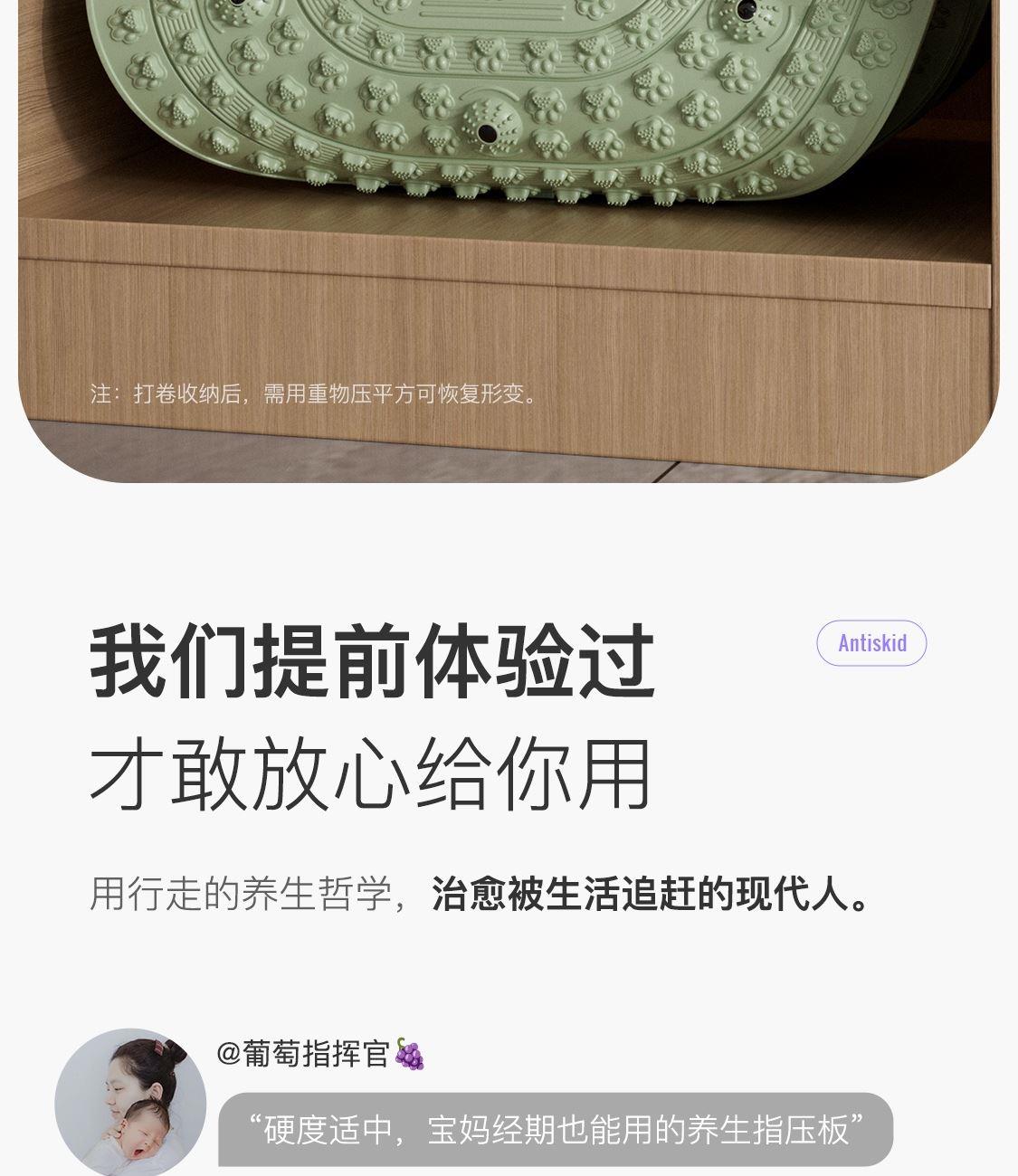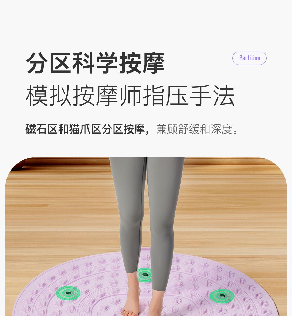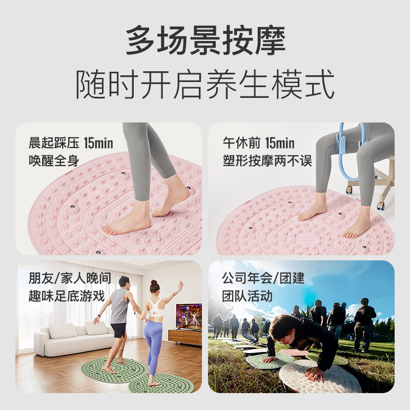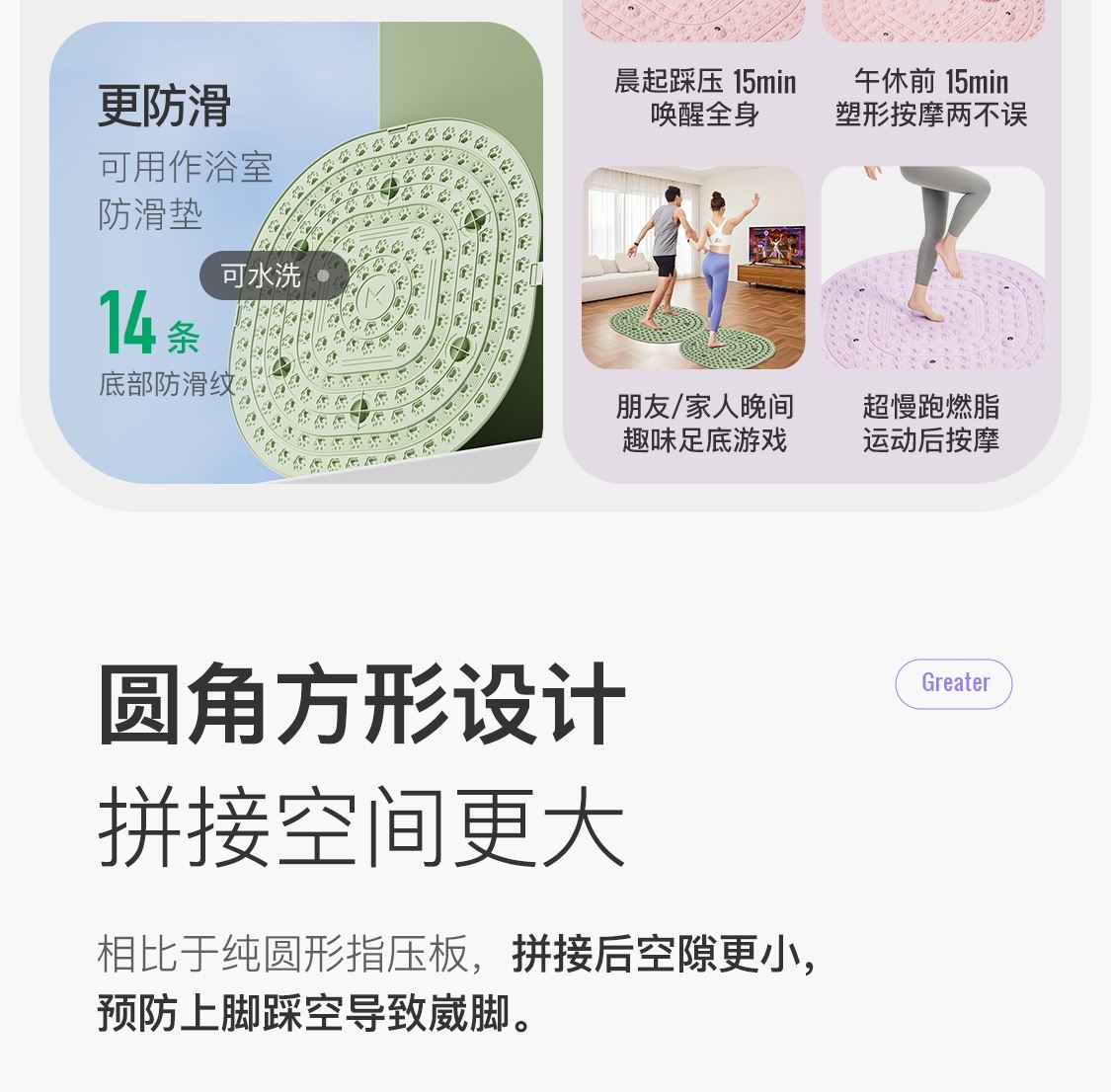 尺寸:55*55cm 颜色:绿色,粉色,紫色,灰色: 材质:TPE;环保无毒材质 方形圆角加大加密设计 287个仿「猫爪」 设计双分区多功能按摩 75°科学刺激硬度 支持无限串联拓展 3068个加密按摩凸点 可做浴室防滑垫
