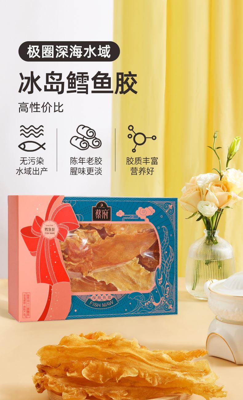 蔡府7A鳕鱼胶150g 规格:150g 包装尺寸:30*23*7.5cm 极圈冰岛鳕鱼胶,深海无污染水域出产 15年鱼龄大鱼,活鱼取胶;精选公肚,个大肉厚,泡发率2-3倍; 陈年好胶,表面干爽,无油脂无血丝,胶体肥美厚实; 天然金黄色,无漂白、无熏硫、无添加,色泽晶莹,呈半透明; 体态完整,个头匀称,胶身通透,纹理清晰; 丰富胶原蛋白,肉质细腻,口感糯滑; 适合全家滋补选择,或轻奢送礼需求。