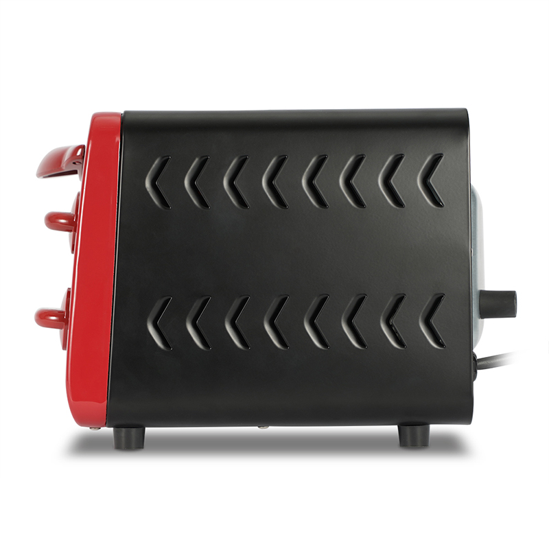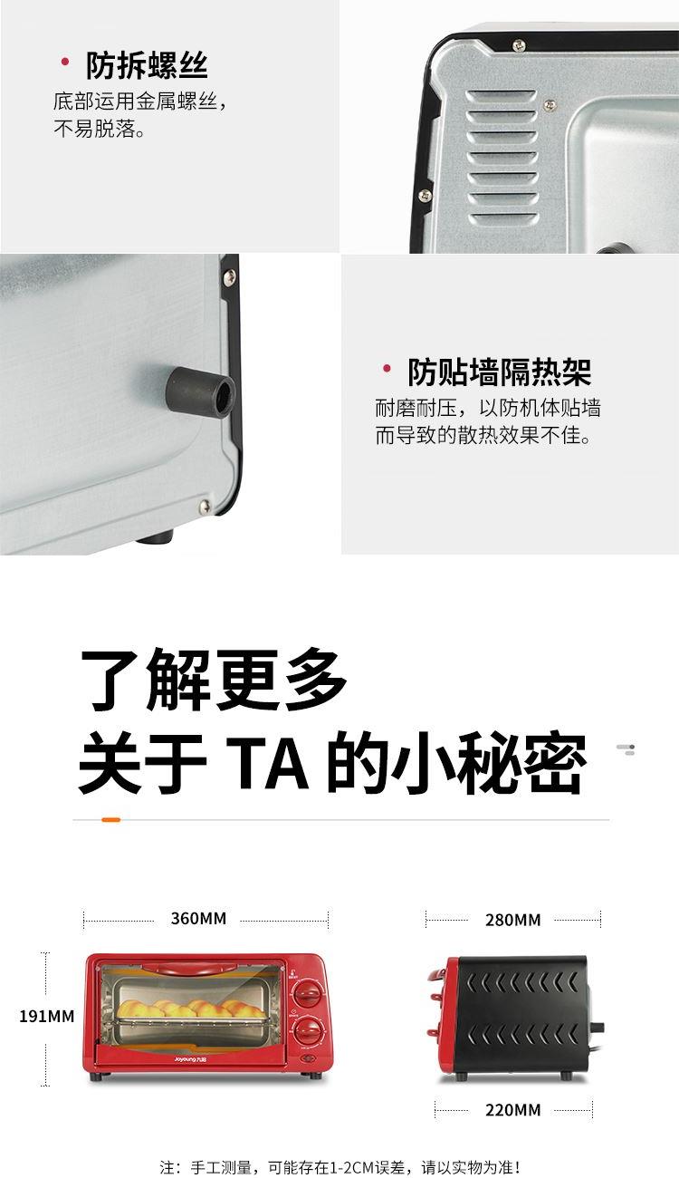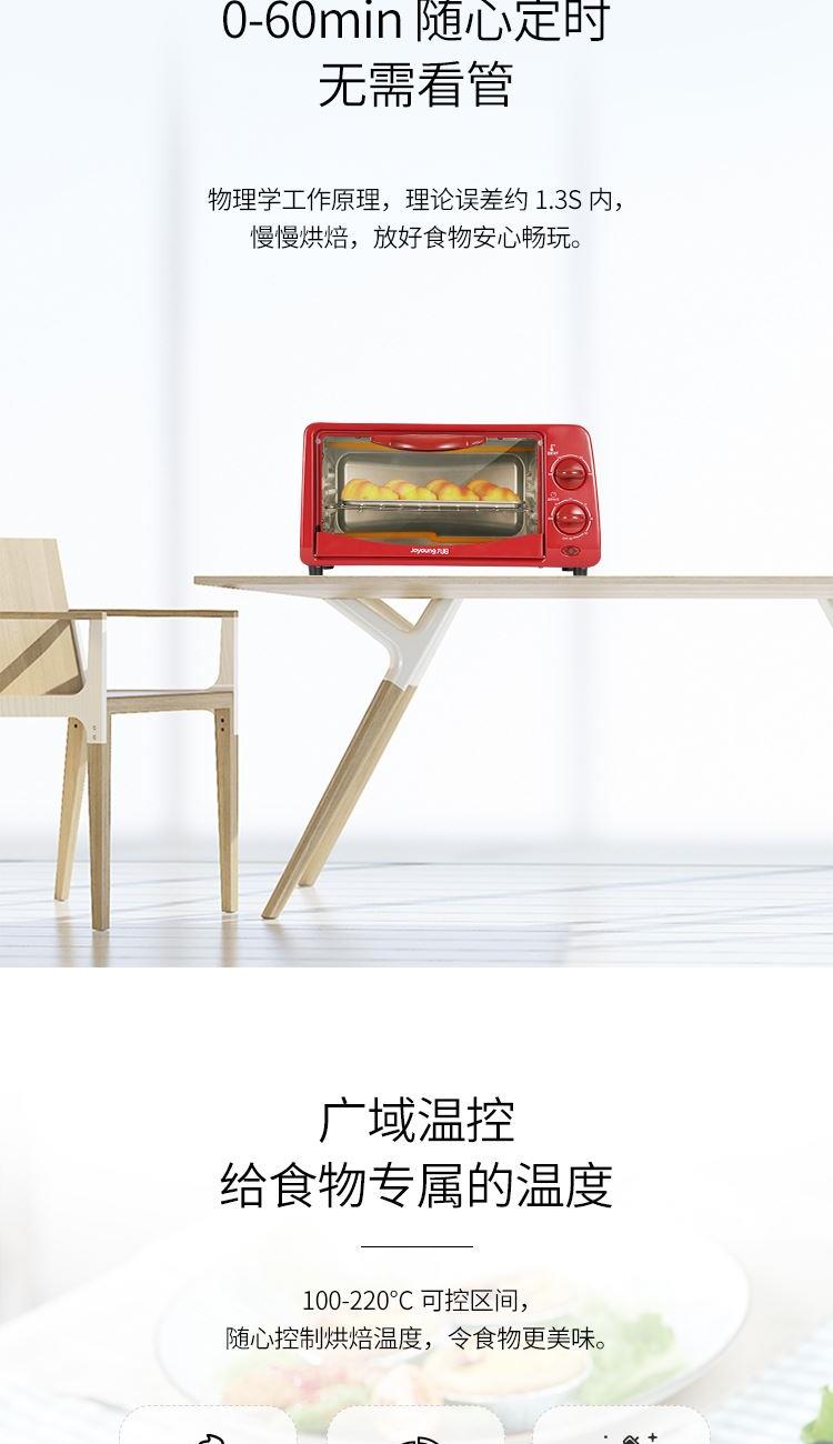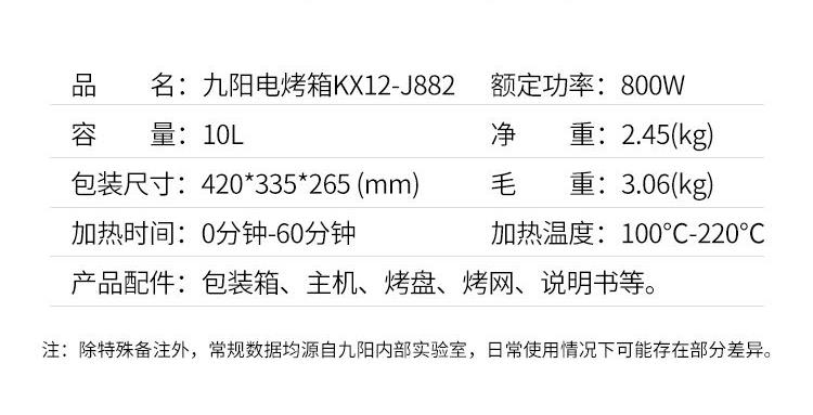 "1、内腔、烤盘均采用健康材质; 2、背面多个散热孔,快速散热; 3、60min定时,220℃控温; 4、玻璃视窗,可视烹饪,可拆洗屑盘; 5、功率800W,容量10L。"