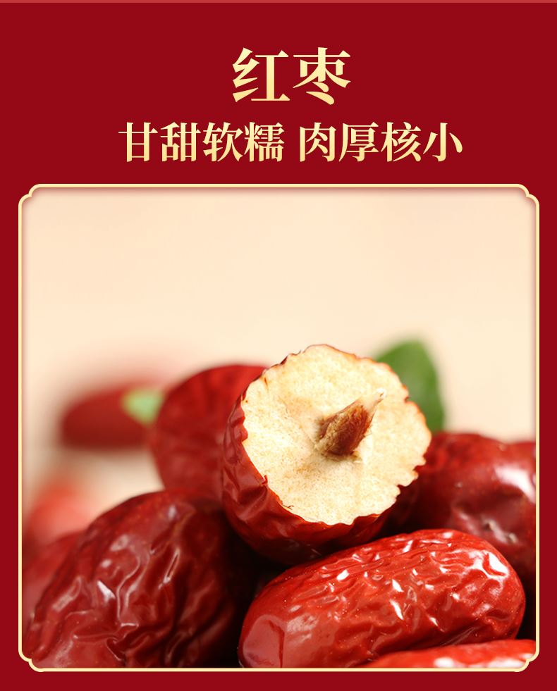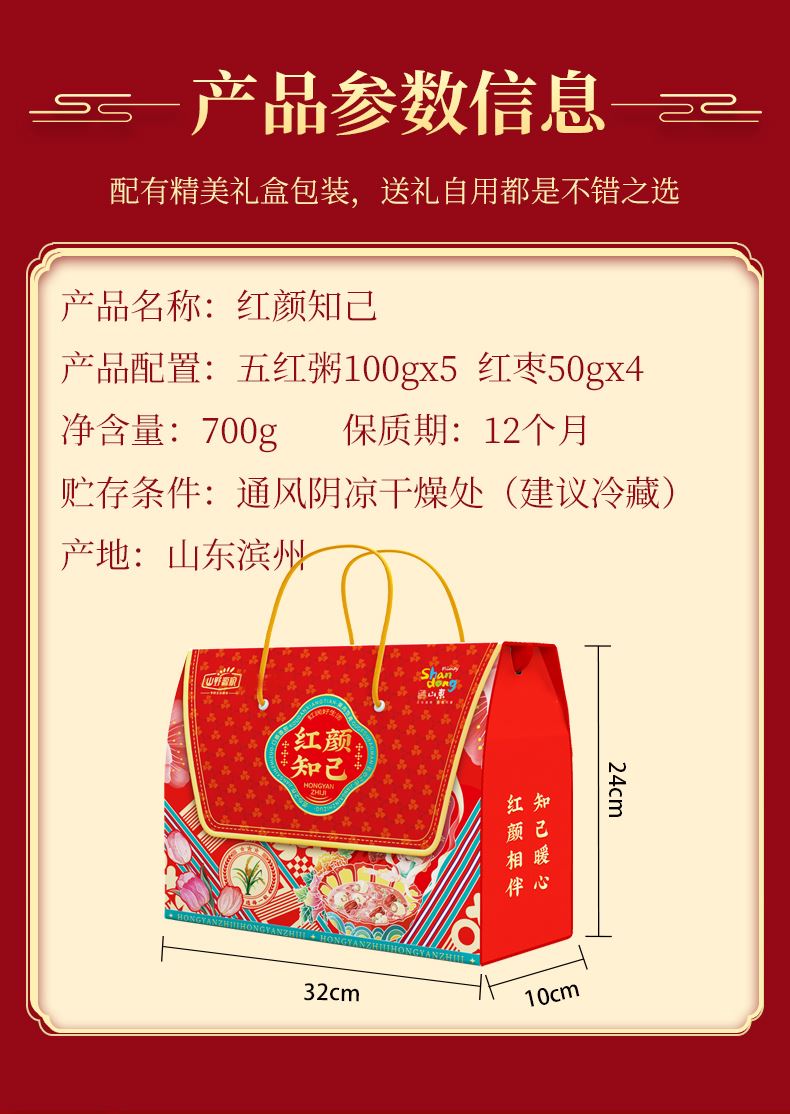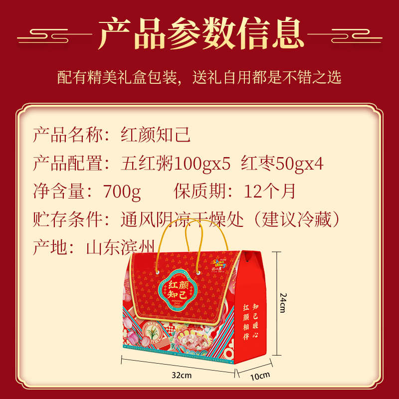 配置:五红粥100g*5, 红枣50g*4 净重:0.7kg 粥配料:红米\香米\血糯米\赤小豆\红花生\红枸杞 盒尺寸:32*10*24 箱重量:11.7kg 箱尺寸: 63*34*50 箱体积:0.107方