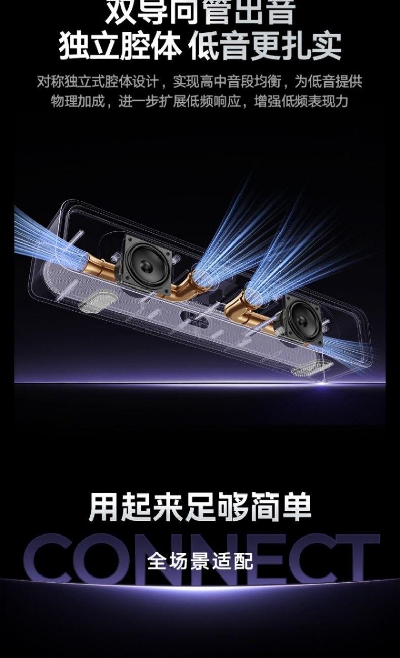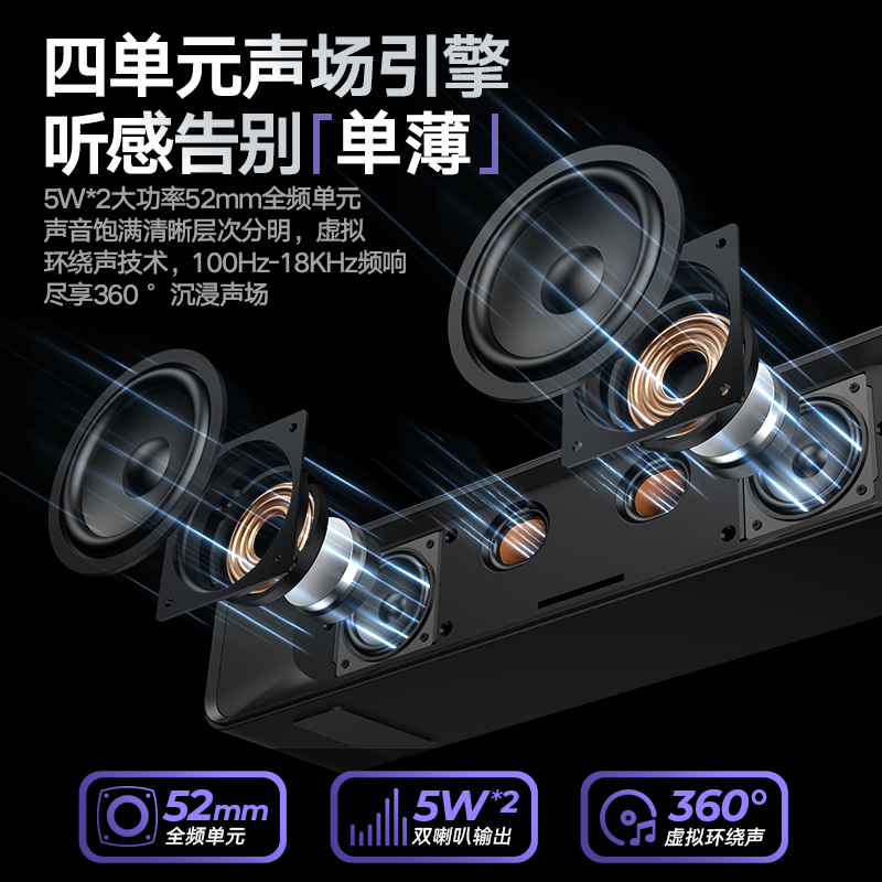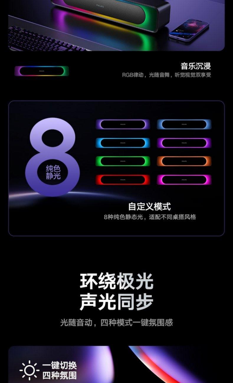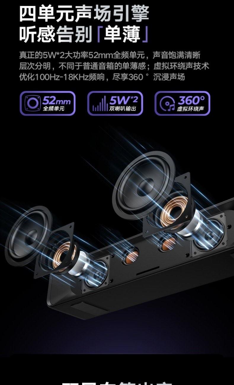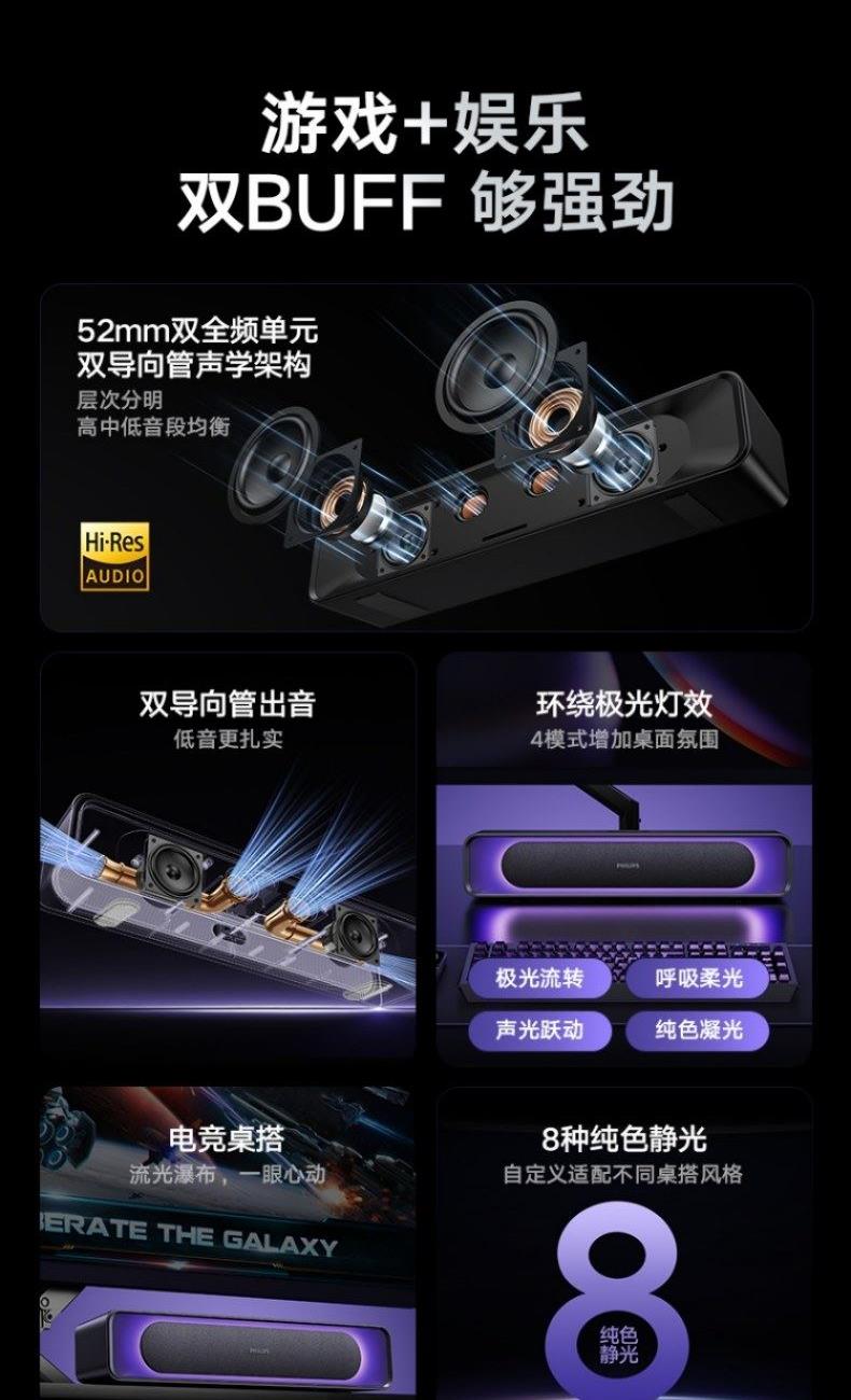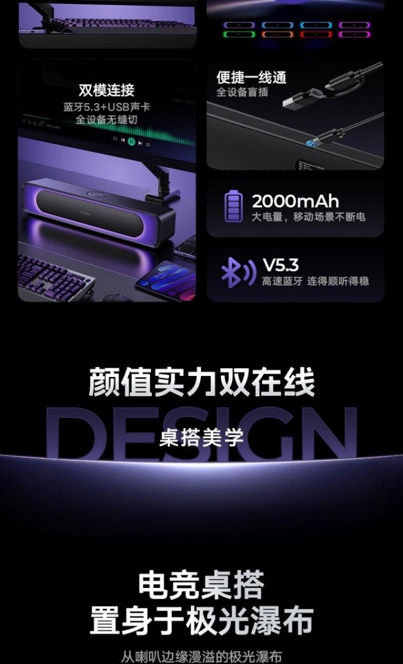 输出功率:5W*2 蓝牙:V5.3 喇叭尺寸: 52mm*2 外磁喇叭 双导向管 频响范围:100Hz-18KHz 电池:2000mAh/3.7V •双导向管出音,低音更扎实 •环绕极光灯效,4模式增加桌面氛围 •电竞桌搭,流光瀑布,一眼心动 •8种纯色静光,自定义适配不同桌搭风格 •双模链接(蓝牙5.2+USB声卡)全设备无缝切 •2000mAh大电量,移动场景不断电