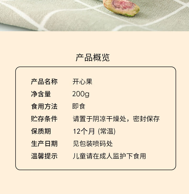 吉潮瑞鲜开心果200克*1袋 开心果200g 食用方法即食贮存条件请置于阴凉干燥处,密封保存保质期生产日期温馨提示 12个月(常温)