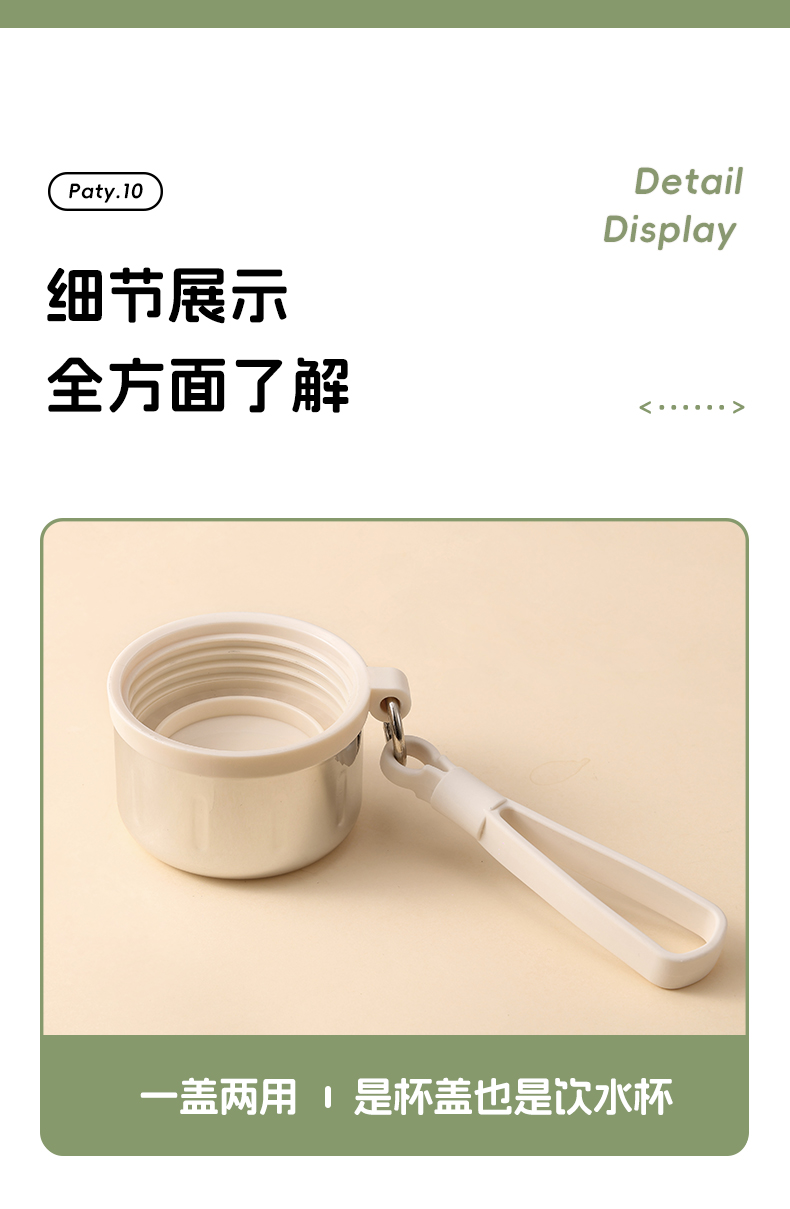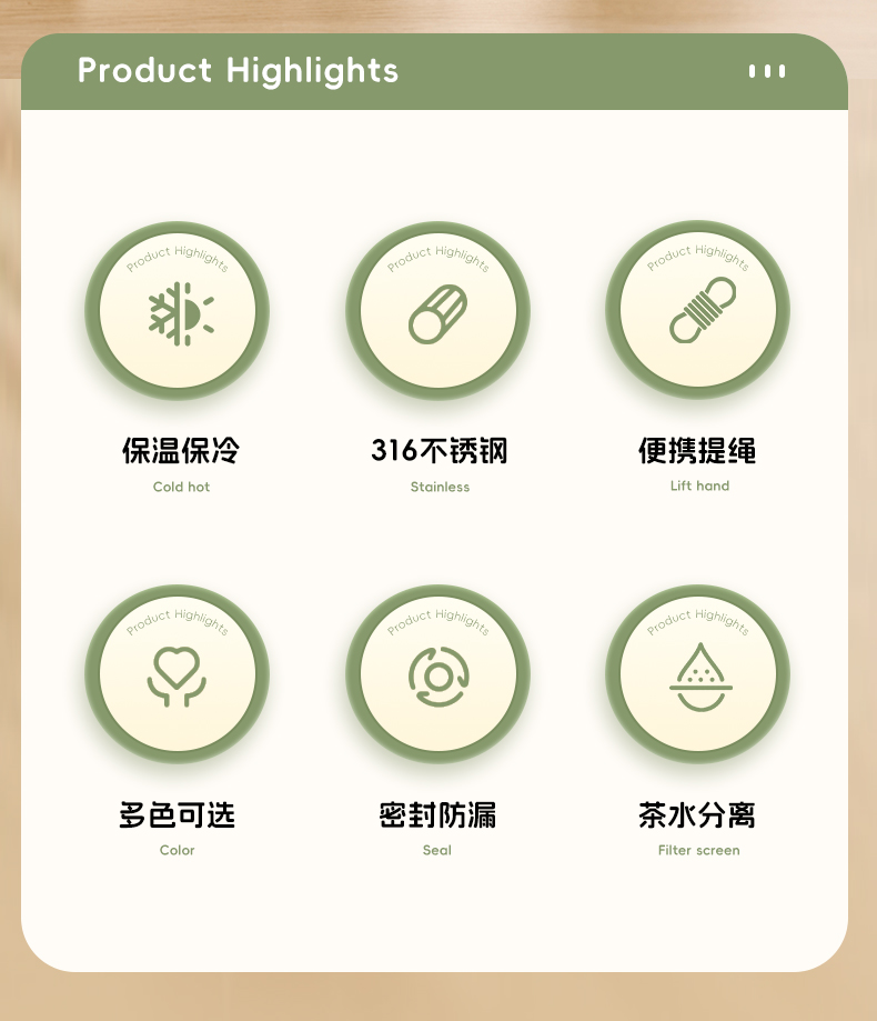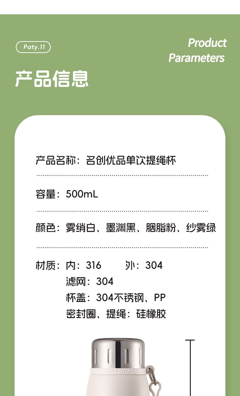 杯盖样式:旋盖 杯身样式:直身杯 杯身主体材质:316不锈钢 内胆材质:316不锈钢 杯盖材质:pp 功能:便携