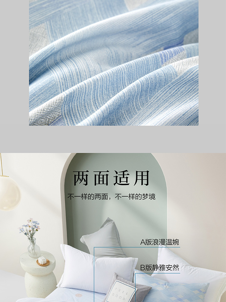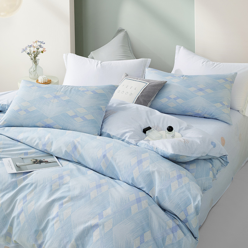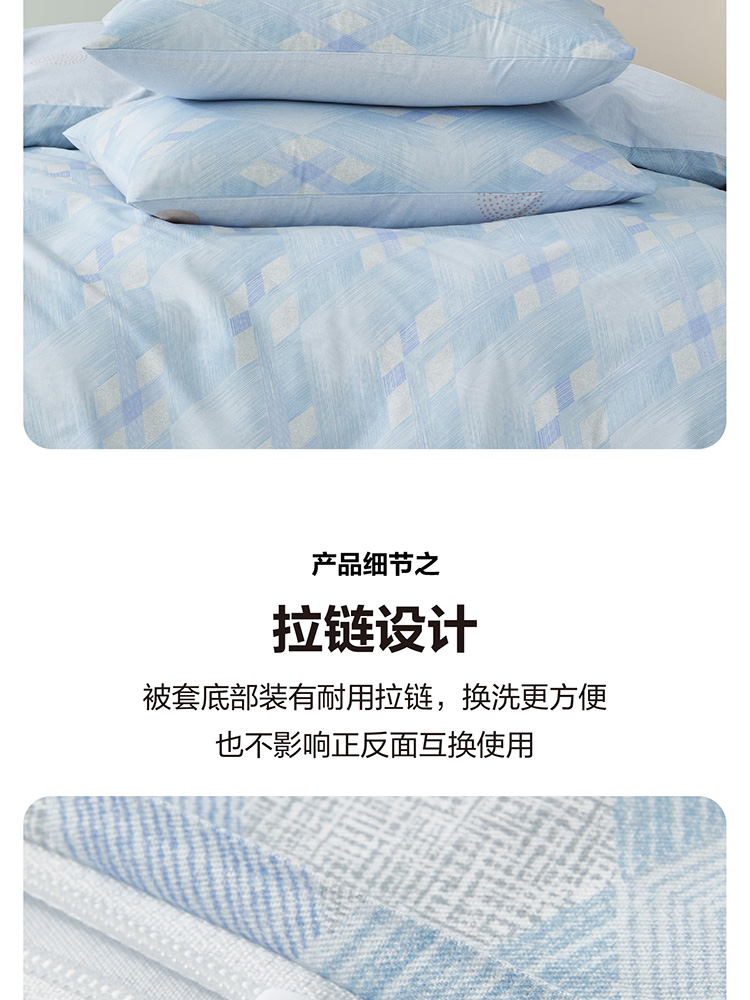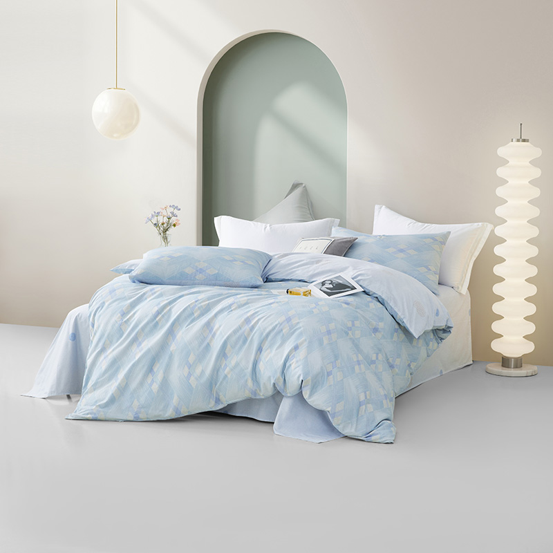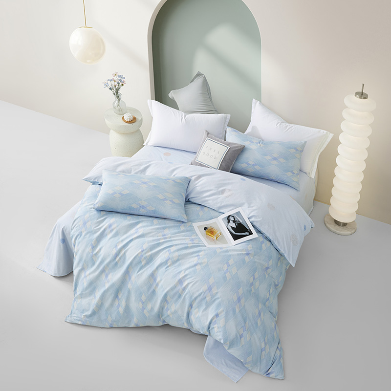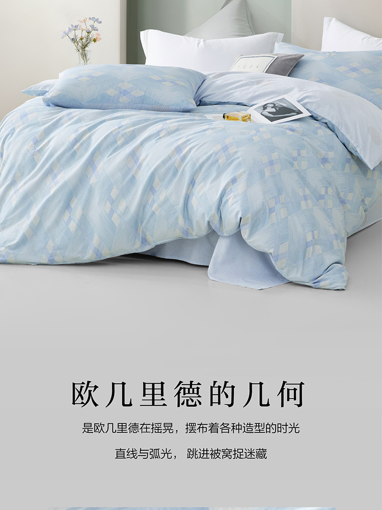 规格尺寸:枕套:48*74cmX2 被套:200*230cmX1 床单:230*240cmX1 外箱尺寸:54*42*38 cm 采用简约现代设计,淡蓝色调搭配几何图案,营造出宁静舒适的睡眠环境。选用优质面料,柔软亲肤,适合各种季节使用。 全棉面料亲肤舒适,柔软、吸湿透气。 采用简约现代设计,淡蓝色调搭配几何图案,营造出宁静舒适的睡眠环境。选用优质面料,柔软亲肤,适合各种季节使用。 全棉面料亲肤舒适,柔软、吸湿透气。